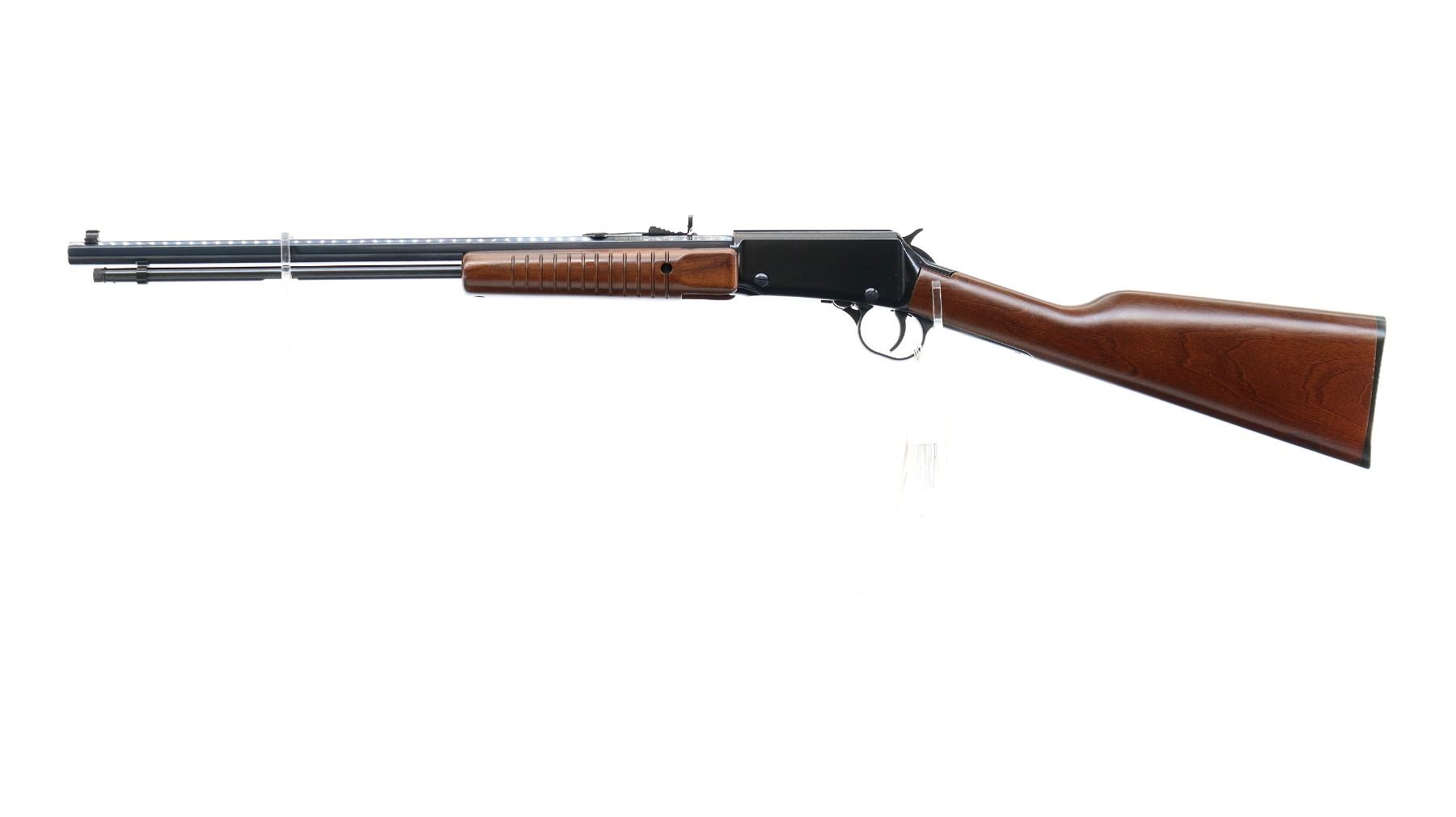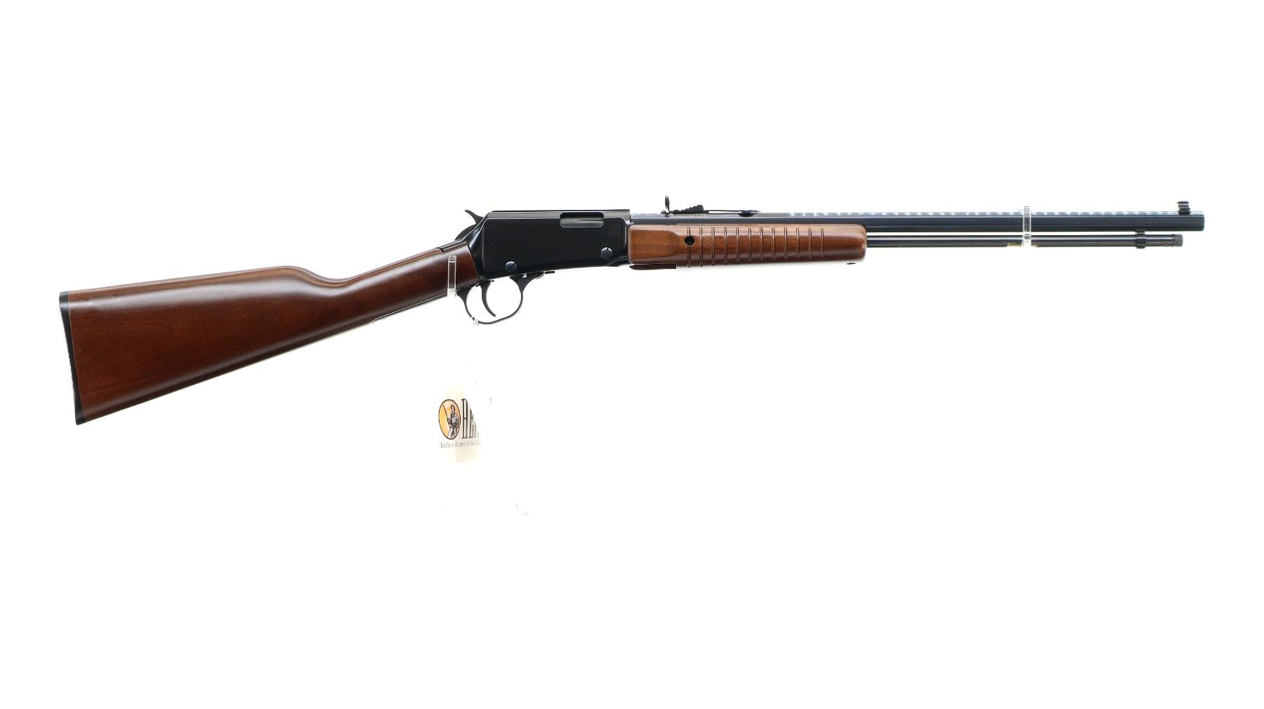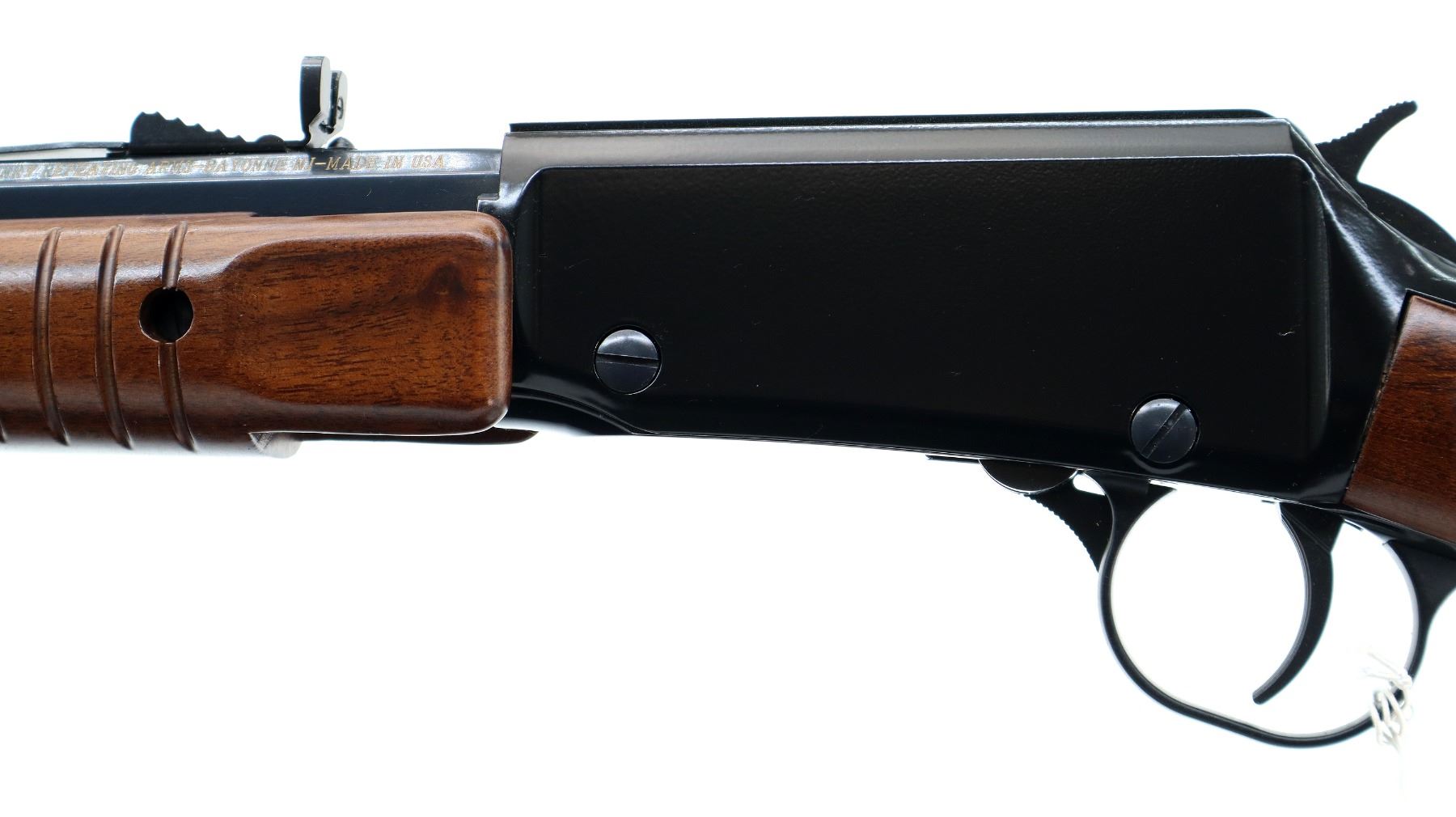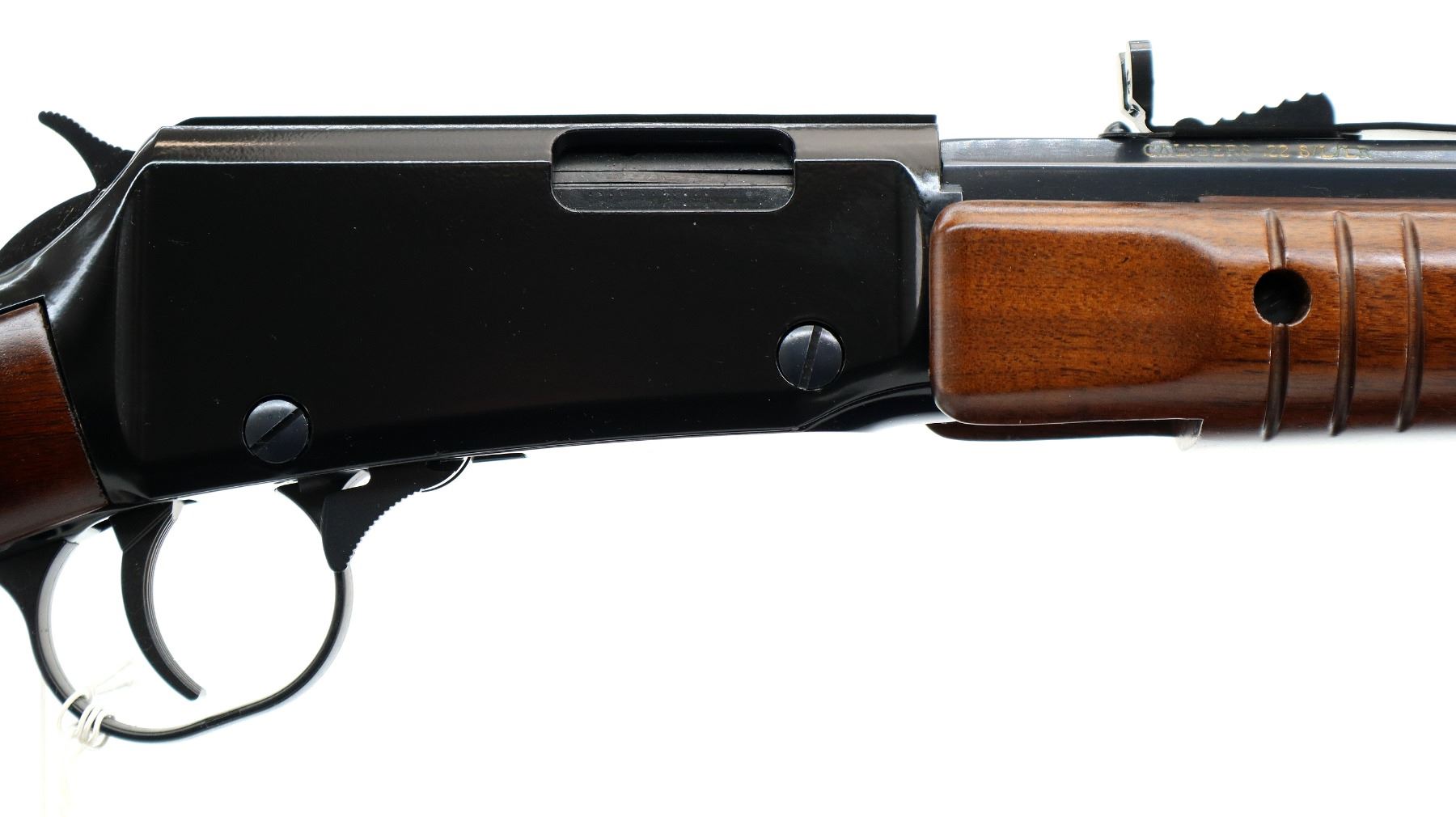 Main Description: Blade front sight, adjustable u notched semi buckhorn rear sight, blued octagon barrel and full length magtube, grooved black alloy receiver, spur hammer. Two piece wood stocks, grooved forearm, straight grip, checkered black polymer butt plate, retains factory hang tags