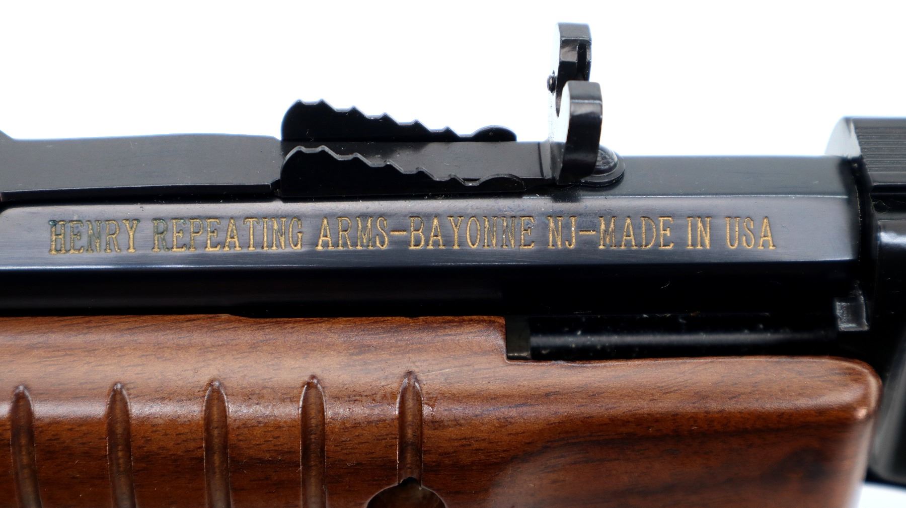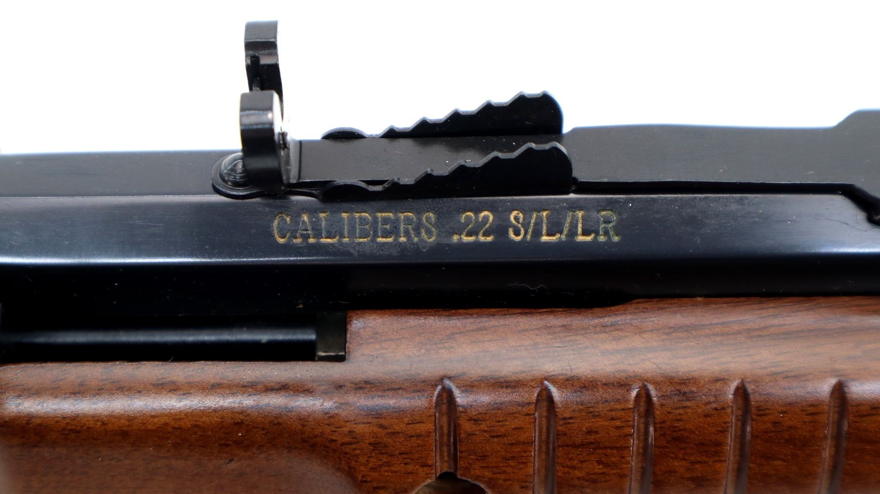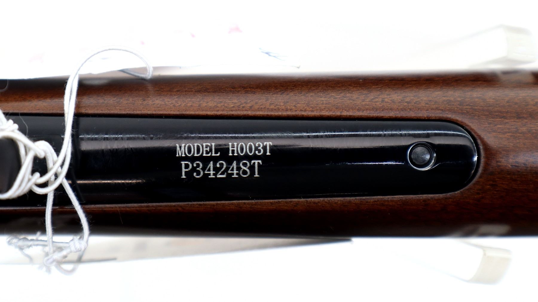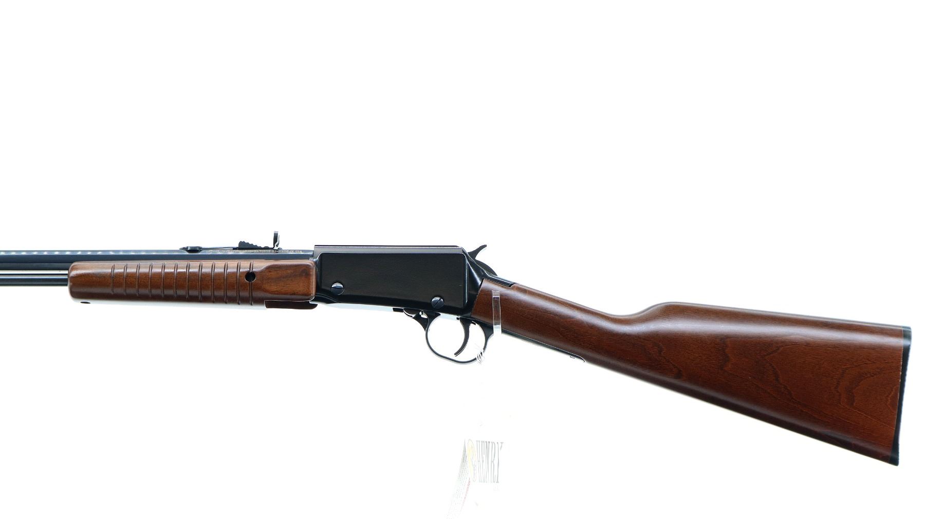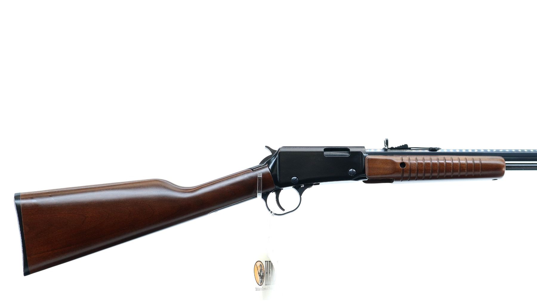 Main Description: Blade front sight, adjustable u notched semi buckhorn rear sight, blued octagon barrel and full length magtube, grooved black alloy receiver, spur hammer. Two piece wood stocks, grooved forearm, straight grip, checkered black polymer butt plate, retains factory hang tags