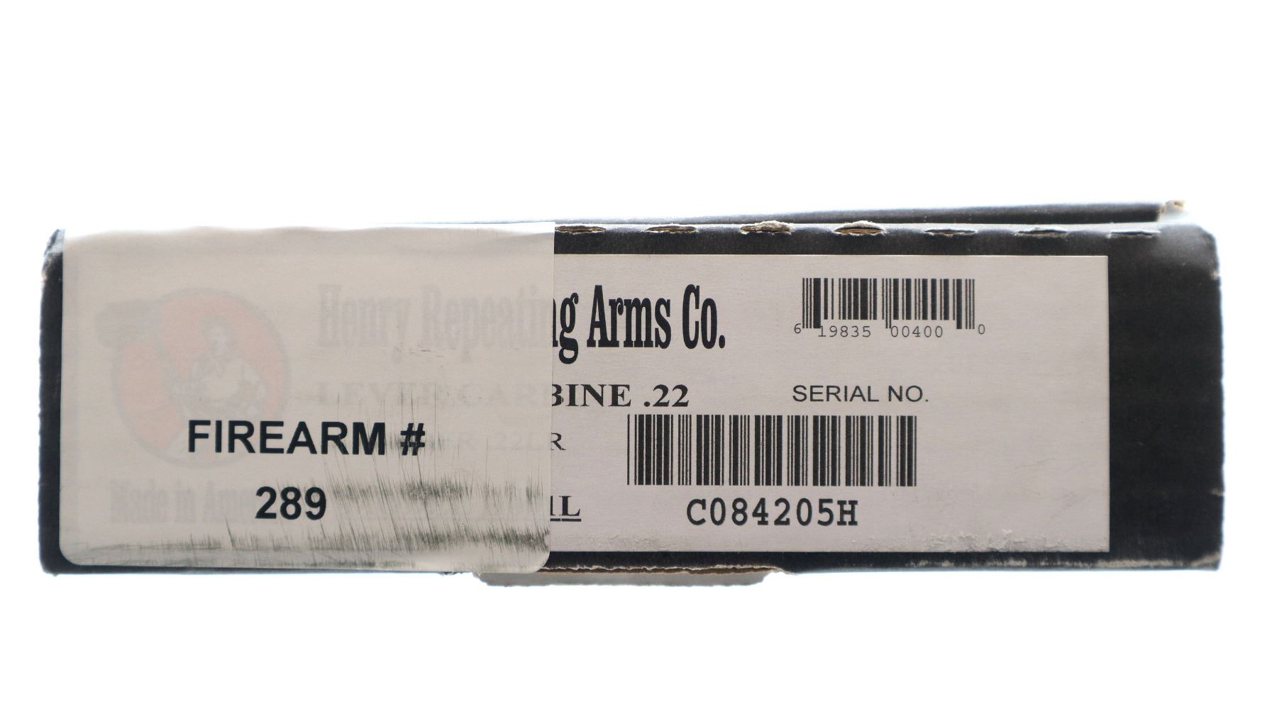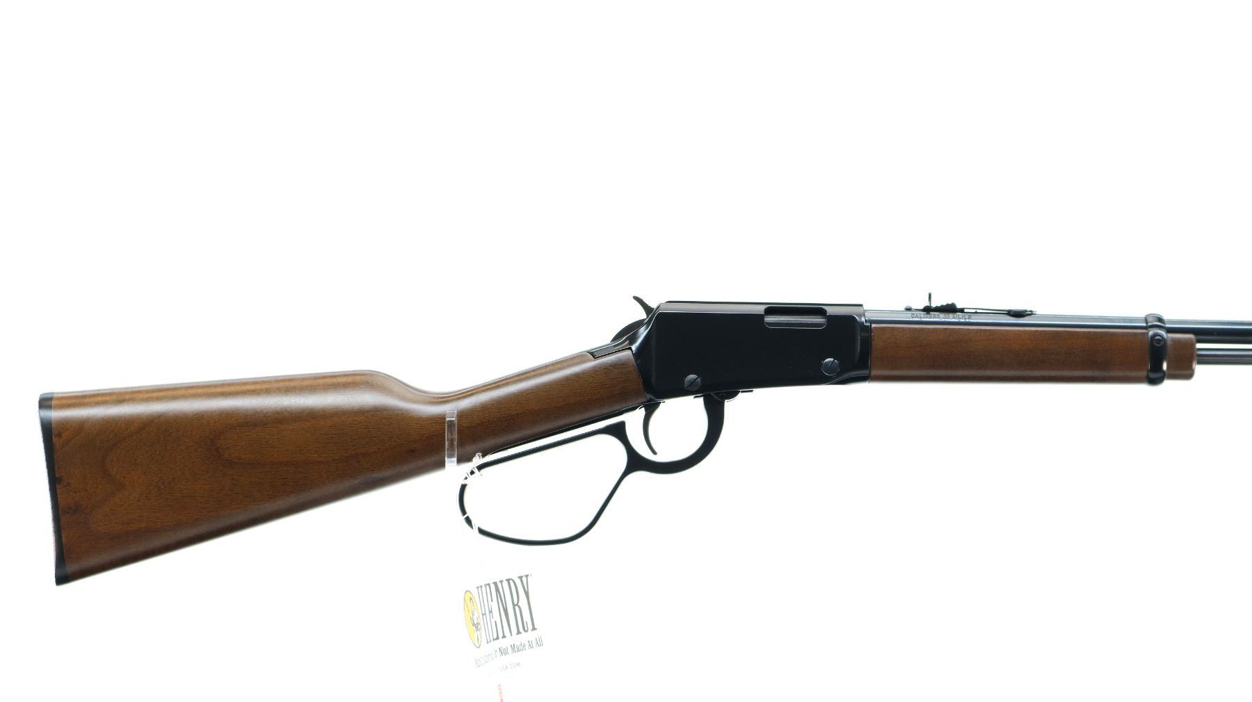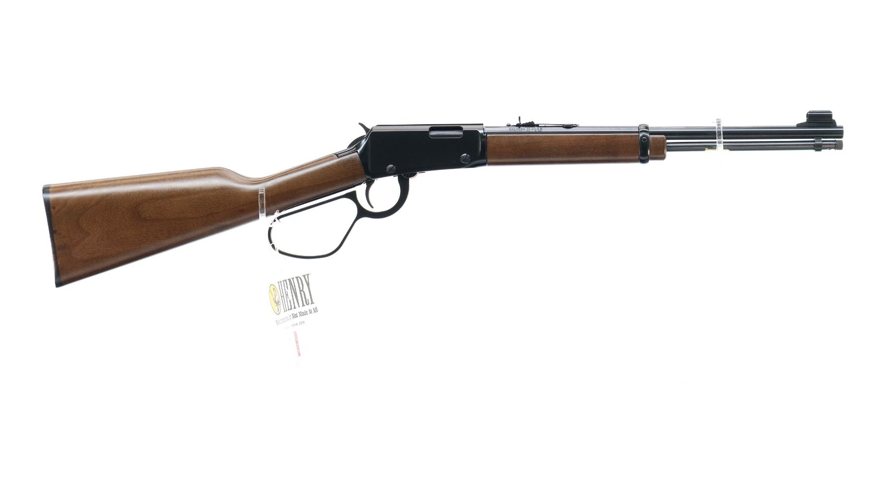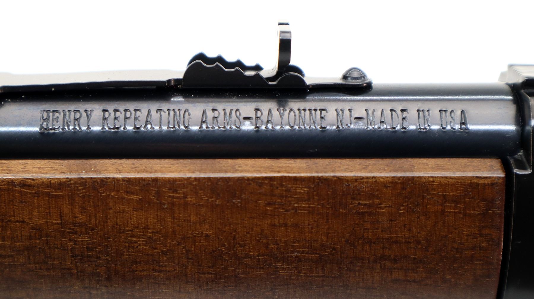 Main Description: Blade front sight with hood and ramp, adjustable u notched rear sight, blued barrel and outer magtube, grooved black finish receiver, spur hammer. Two piece wood stocks, straight grip, checkered black polymer butt plate, large loop lever, retains factory hang tags.