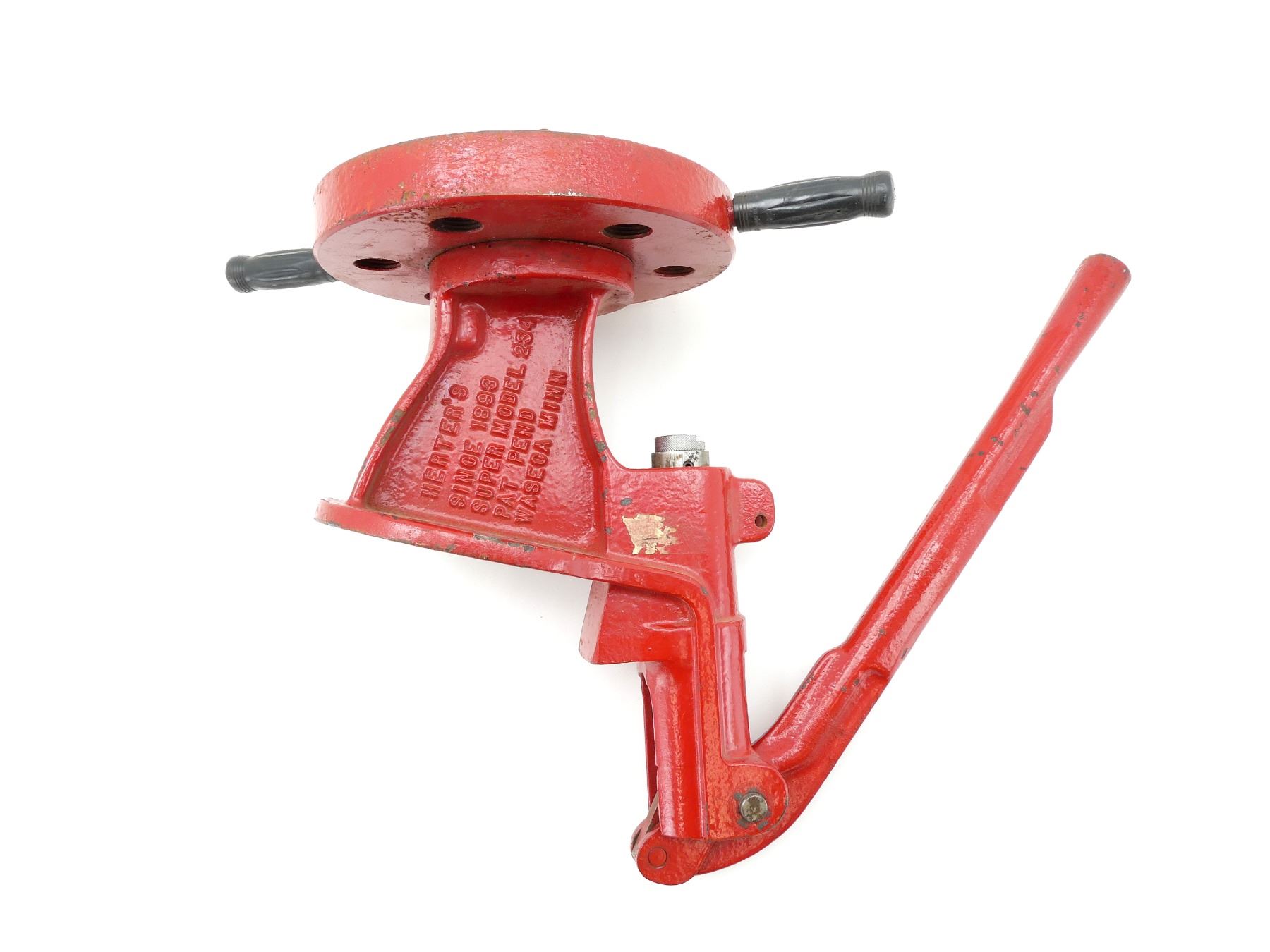 LOT INCLUDES; (1) SUPER MODEL 234 RELOADING PRESS, VARIOUS MARKINGS, RED PAINTED, WITH #14 SHELL HOLDER ATTACHED, MOUNTS TO BENCH, MAY REQUIRE ADJUSTMENTS AND/OR MAY NOT BE COMPLETE. SEE PHOTOS.