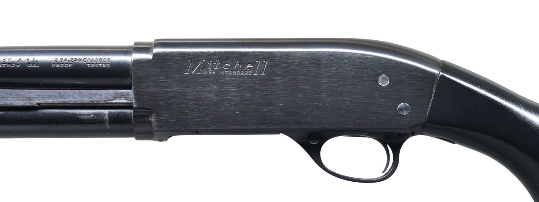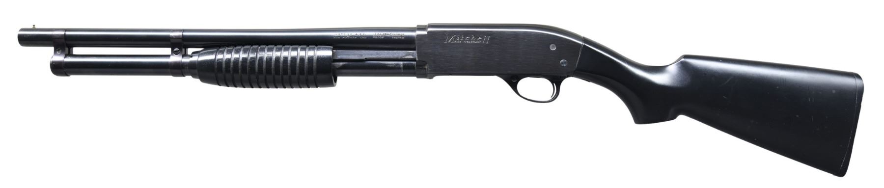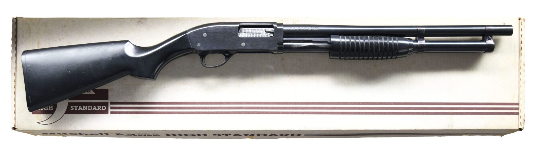 Cal. 12 Ga. 2 3/4". S# 679990. Bbl. 18 1/2". Brass bead front sight. Filipino made shotgun imported by Mitchell Arms/Hi Standard. Blued finish. Hardwood stock with dark finish. UNATTACHED ACCESSORIES: matching numbered importer box. CONDITION: stock set shows scattered handling marks. Metal retains 95% original blue with a couple small spots of light oxidation & operational wear mostly on mag tube. Action functions properly when hand cycled. Near excellent bright bore. (25-3406/MJC). MODERN. $250-350.
