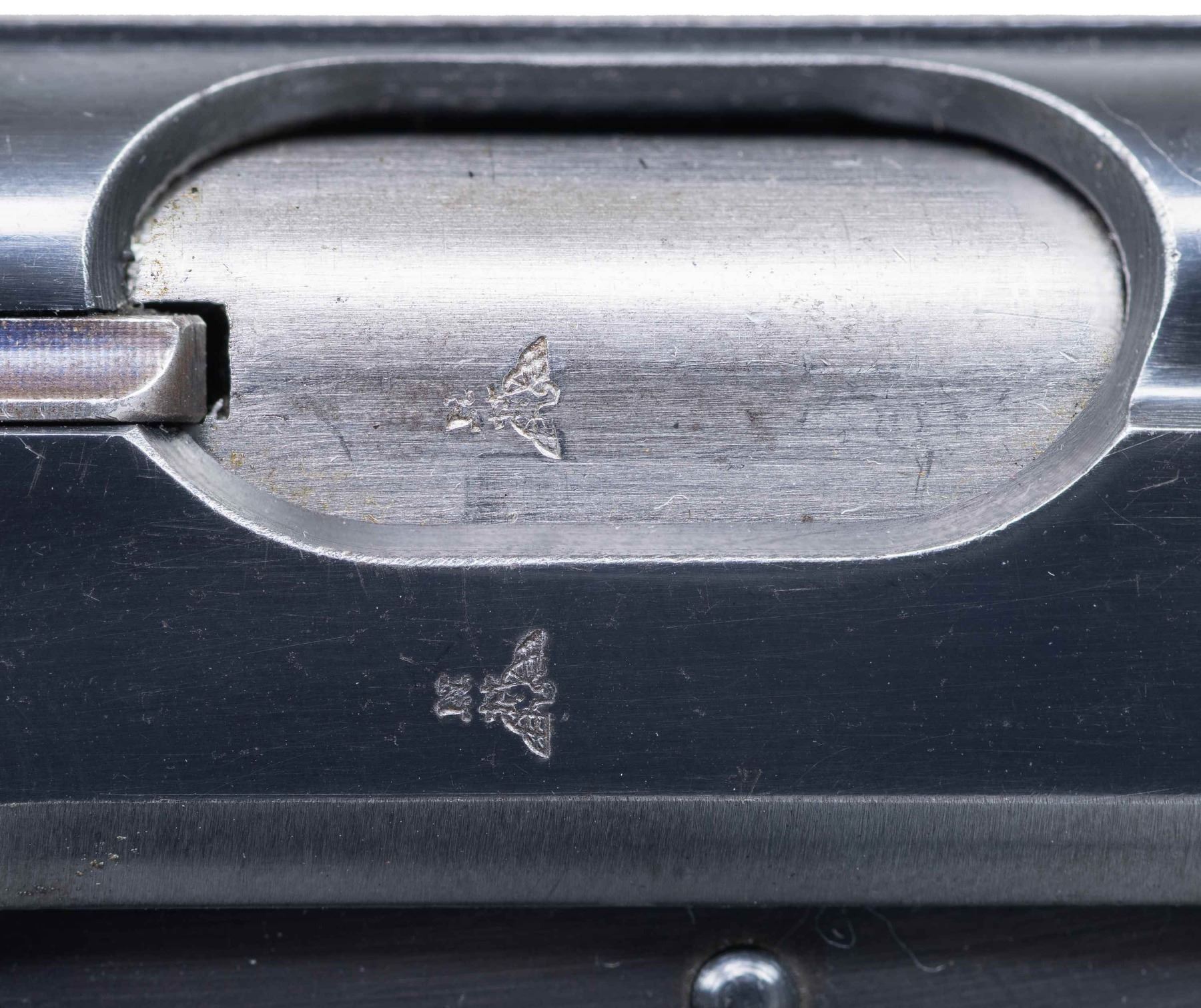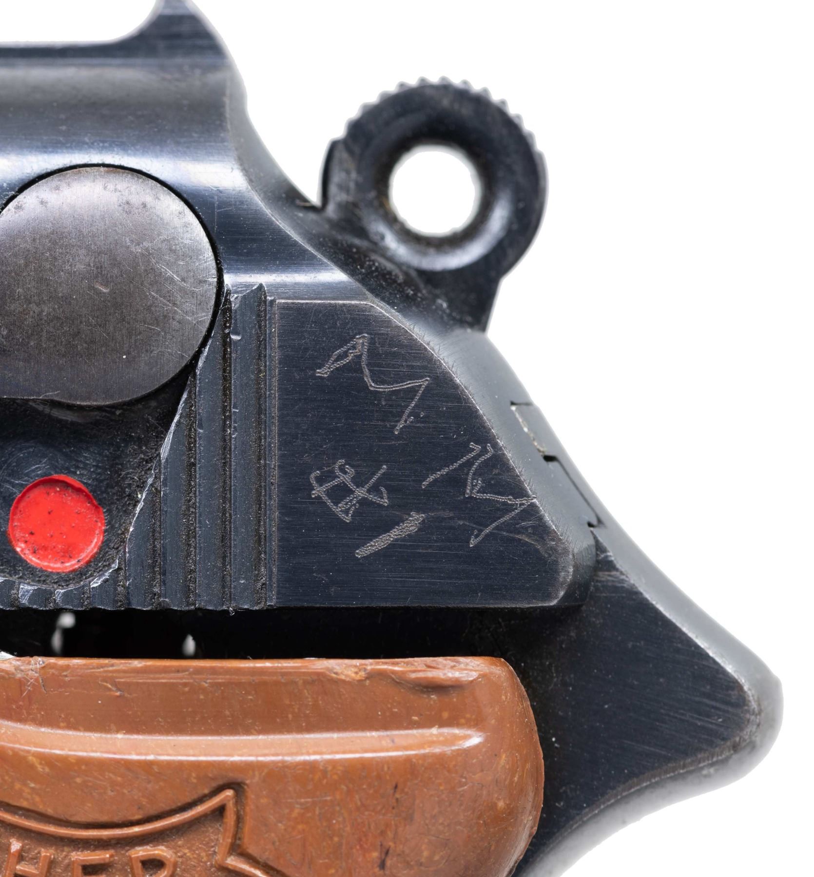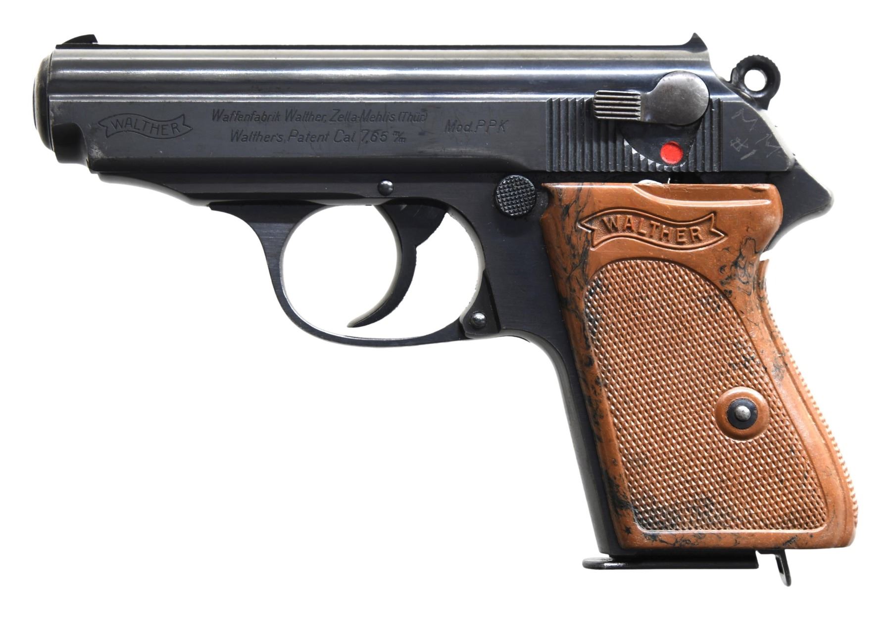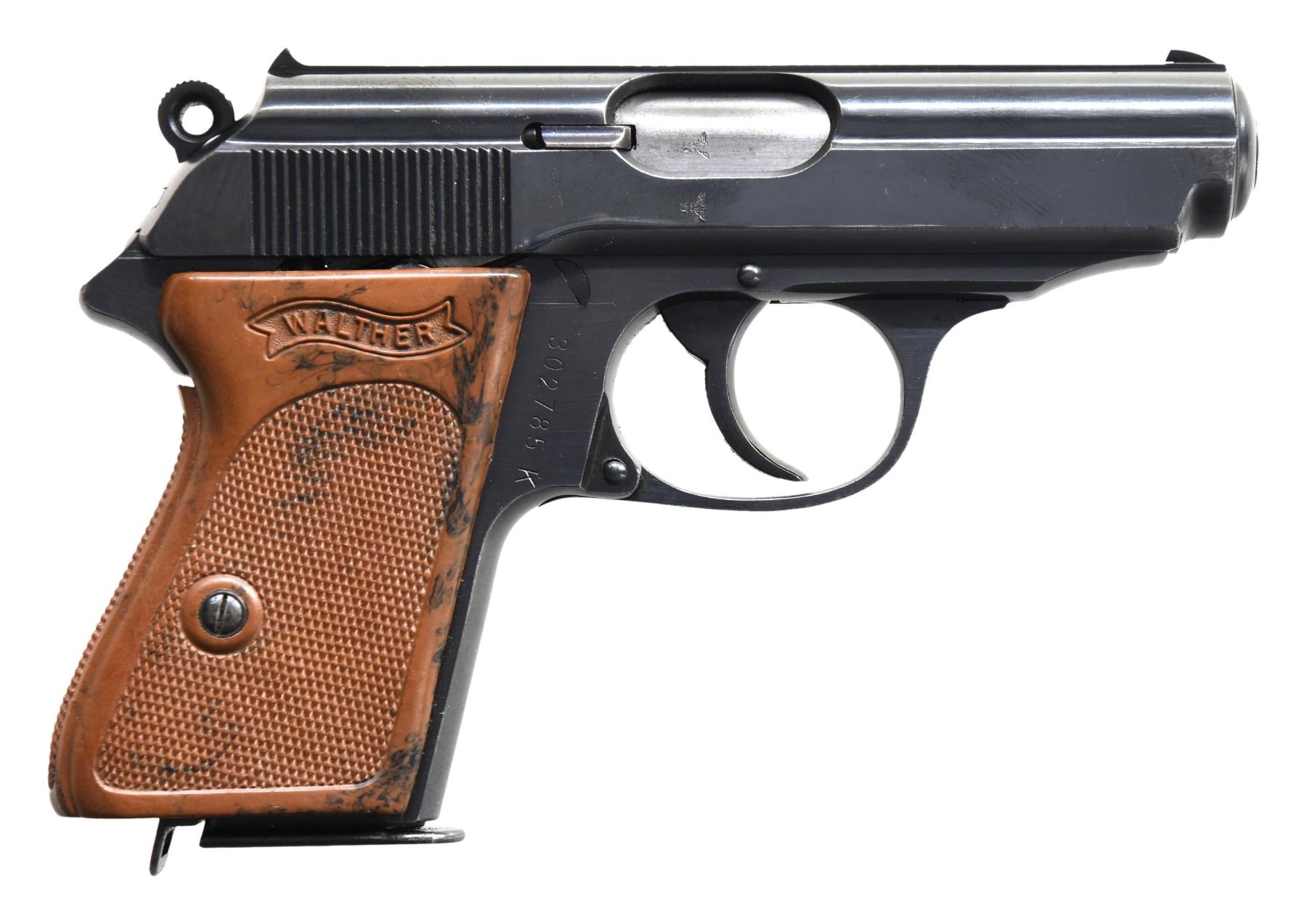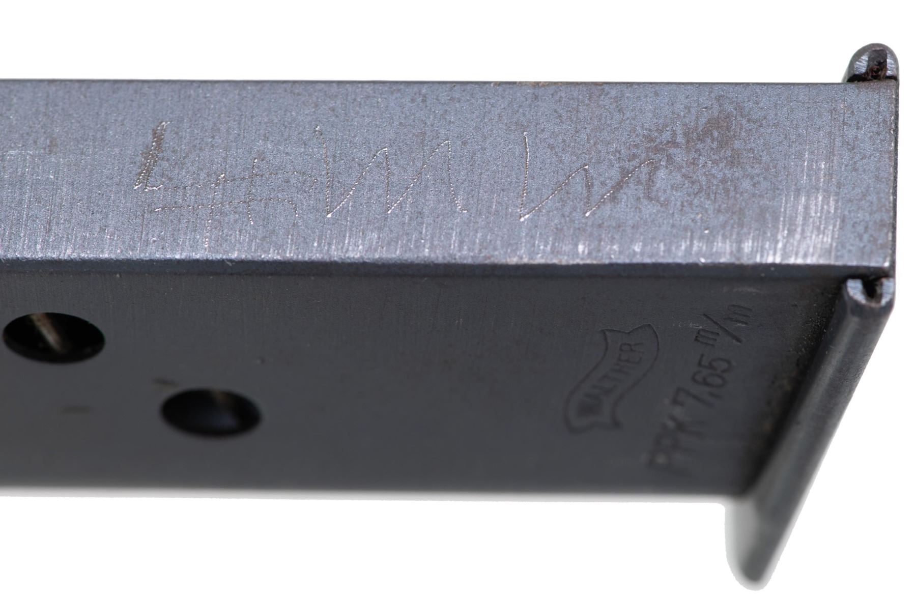 MODEL PPK SEMI-AUTOMATIC PISTOL. Cal. 7.65mm. S# 302785K. Bbl. 3 1/4". PPK semi-automatic pistol mfg. by Walther in 1941. According to "SS Contract Walther PP/PPK Contract Variations & Serial Numbers", by Thomas Whiteman, the highest recorded S# within the 7th SS contract is "302279K", with this example being just 506 S#s away. The left side of the slide is marked with the Walther banner logo, followed by markings stipulating Walther's mfg. information, as well as the model and cal. designations. Left side of slide is also lightly etched "MM/ #1", with "MM #1" faintly etched on the spine of the mag. Right side of the frame (on chamber), slide, and bbl. exhibit a German Eagle/N commercial nitro proof. Metal components exhibit a blue finish overall, save for on the chamber, which is polished in-the-white. Frame is mounted with a 1-piece checkered mottled brown synthetic wrap around grip. Slide features a matte grooved rib, with a fixed blade front sight and fixed U-notch rear sight. Interior of slide matches the frame via "785", which is lightly etched parallel to the ejection port. MAGS: 1 7-rd. CONDITION: metal components retain the majority of their original factory blue finish, exhibiting some spots of light to mild wear and thinning (primarily on edges), some superficial handling marks, as well as some spots of light surface oxidation overall. Mirror bore, retaining well defined rifling throughout. Grip shows some warping, as well as scattered superficial marks from handling and storage, but otherwise remains sturdy and serviceable. (25-2380/MLW). CURIO. $1,000-1,500.