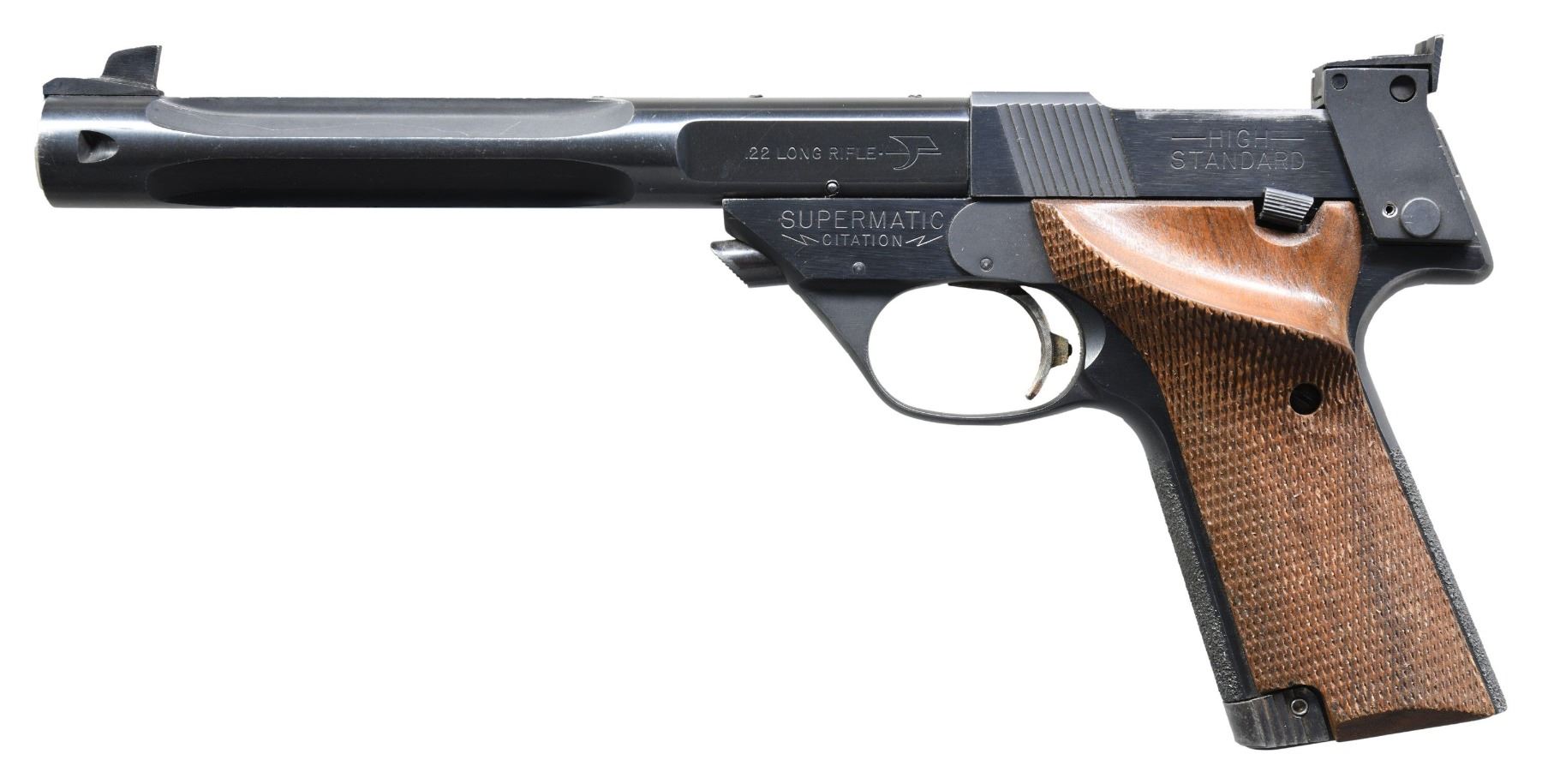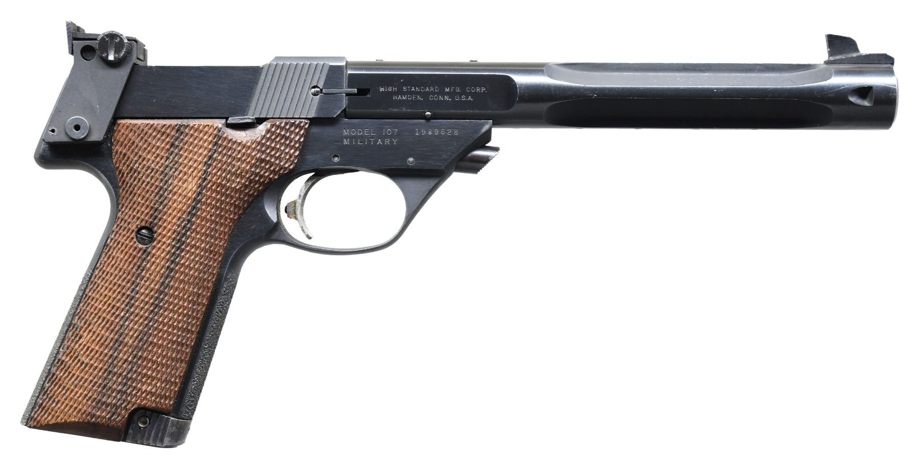 MILITARY SEMI-AUTO PISTOL. Cal. 22 LR. S# 1989628. Bbl. 7 1/4" Hamden marked fluted target with provision for muzzle brake plus dovetailed target sight blade and frame mounted adjustable rear sight. Mfg. with catalog number 9243 from 1968-1981; frames without "ML" serial number prefix made before August of 1975. Case colored wide serrated target trigger and magazine latch. Checkered walnut grips with thumb rest for RH use. Right side of frame marked "MODEL 107" / "MILITARY". Stippled grip straps and high polish frame finish. Top of barrel non factory drilled and tapped for optics base; bottom factory drilled and tapped for weights. MAGS: 1 factory 10 rd. with 'HIGH STANDARD" marked red plastic base extension. CONDITION: slight handling and functioning marks throughout; near excellent bore and grips. (25-3654/NW). CURIO. $350-500.