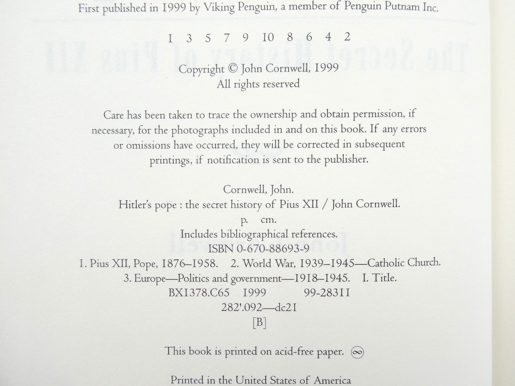 (1) BY JOHN CORNWELL, HARD COVER WITH DUST COVER, ISBN: 0-670-88693-9. SEE PHOTOS.
