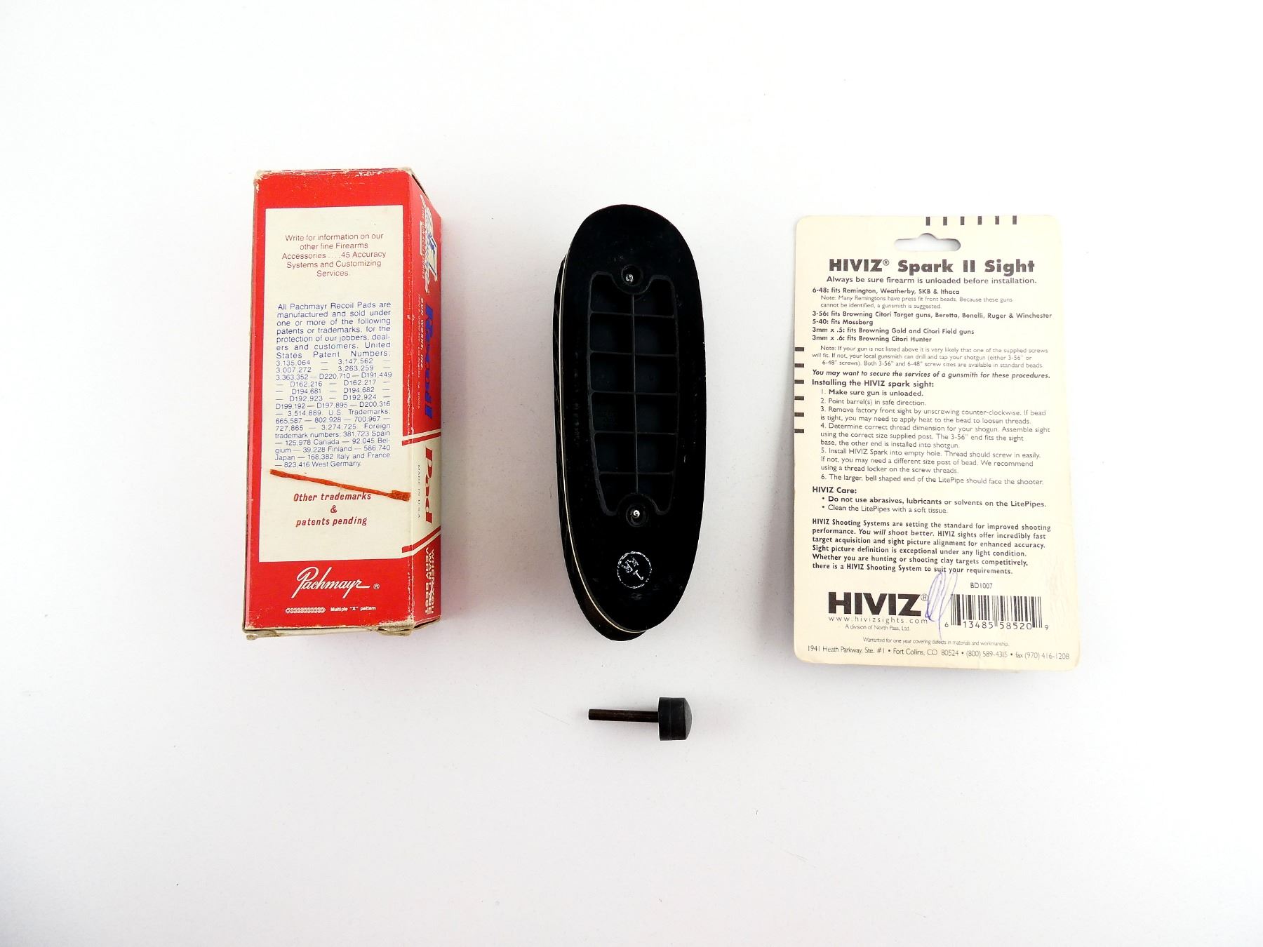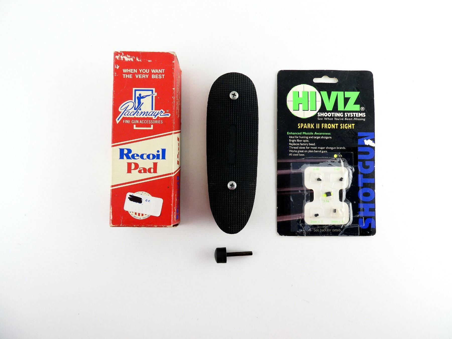 LOT INCLUDES; (1) PKG HIVIZ SPARK II SHOT GUN FRONT SIGHT, FITS BROWNING GOLD / CITORI FIELD / CITORI HUNTER, ETC. SHOT GUNS & (1) PACHMAYR RECOIL PAD, BLACK RUBBER, PART #: T660-L-SN-BL, POSSIBLY NEW OLD STOCK IN ORIGINAL PACKAGING. MAY REQUIRE FITTING. SEE PHOTOS.