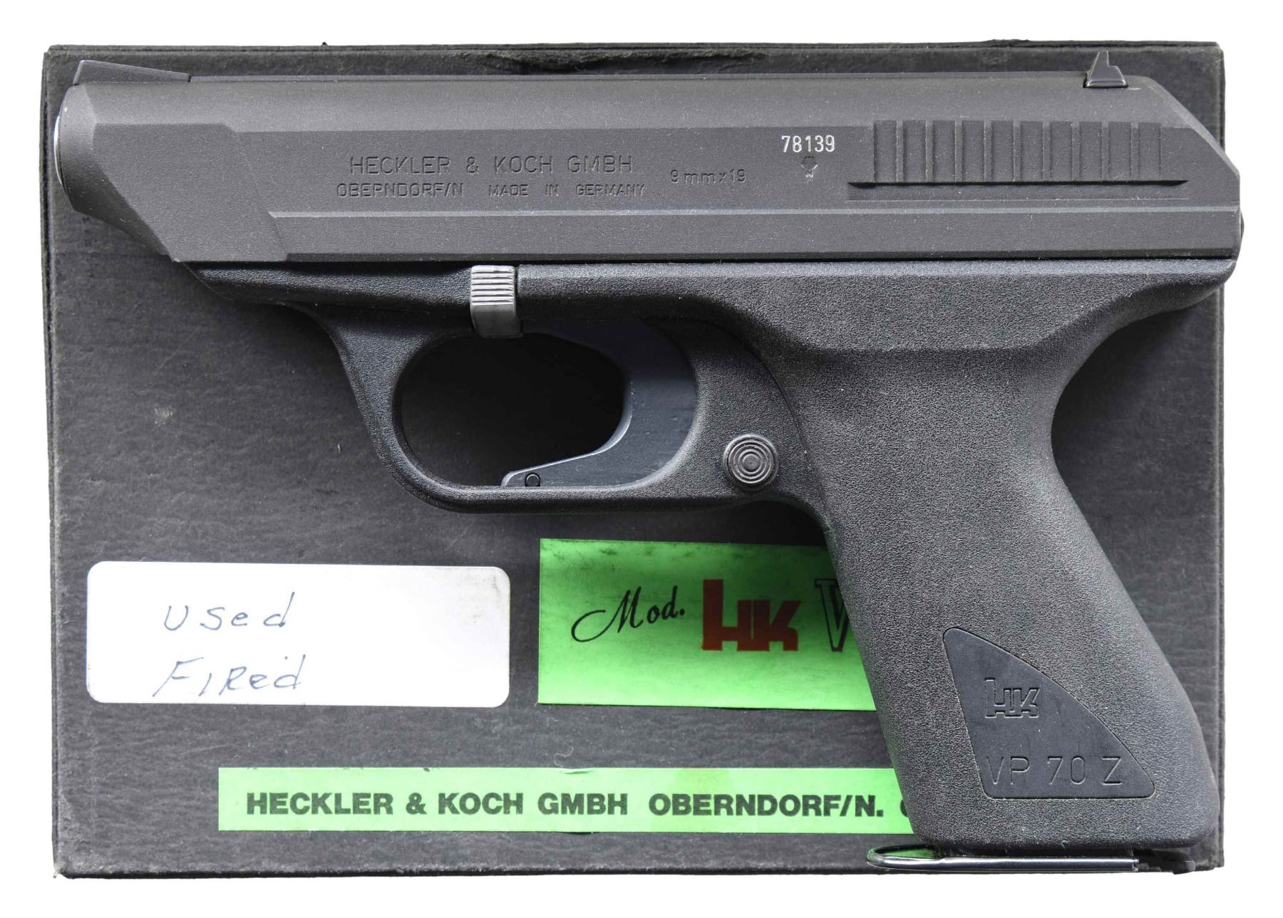 Cal. 9x19. S# 78139. Mfg. 1980. Bbl. 4.5" bbl. Black parkerized slide & black polymer frame. MAGS: 2 - 18 rd. UNATTACHED ACCESSORIES: box w/ matching factory target, paperwork & cleaning kit. CONDITION: all aspects near excellent showing light wear. Near excellent bore. (25-3221/MD). MODERN. $600-900.