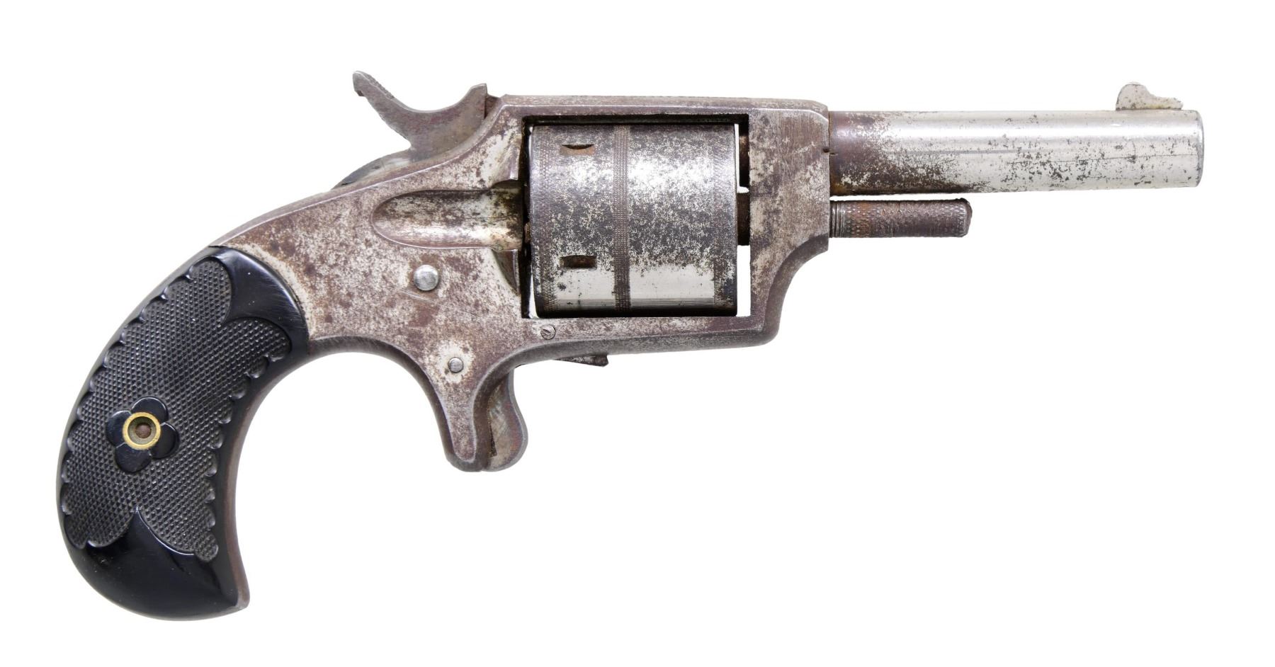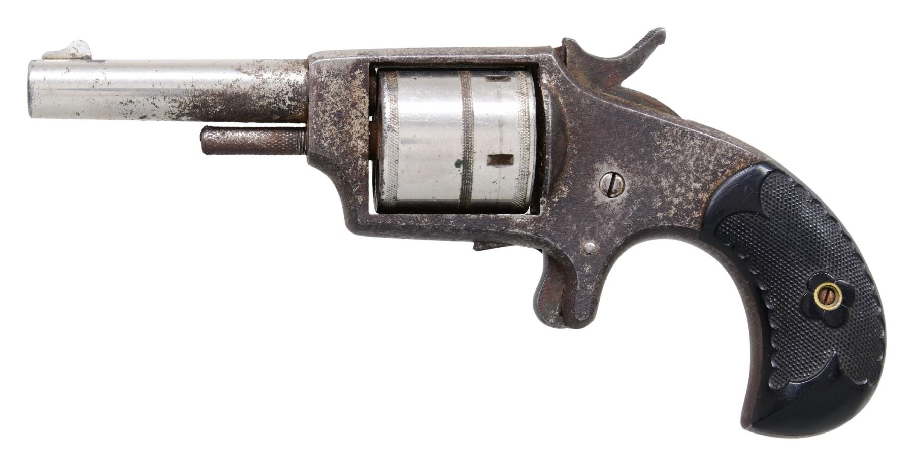 Cal. 32 RF. S# 926. Bbl. 2 3/4". Blade front sight. Fixed rear sight. Hopkins & Allen "Dictator" spur trigger revolver. Nickel finish. Checkered black hard rubber grips. CONDITION: grips show scattered scratches & handling marks. Metal is mostly turning dark from oxidation with some pitting & strong traces of nickel finish. Hammer does not go to full cock & does not rotate cyl. will need attention to fix. Pitted & oxidized bore. (01-27022/MJC). ANTIQUE. $100-200.