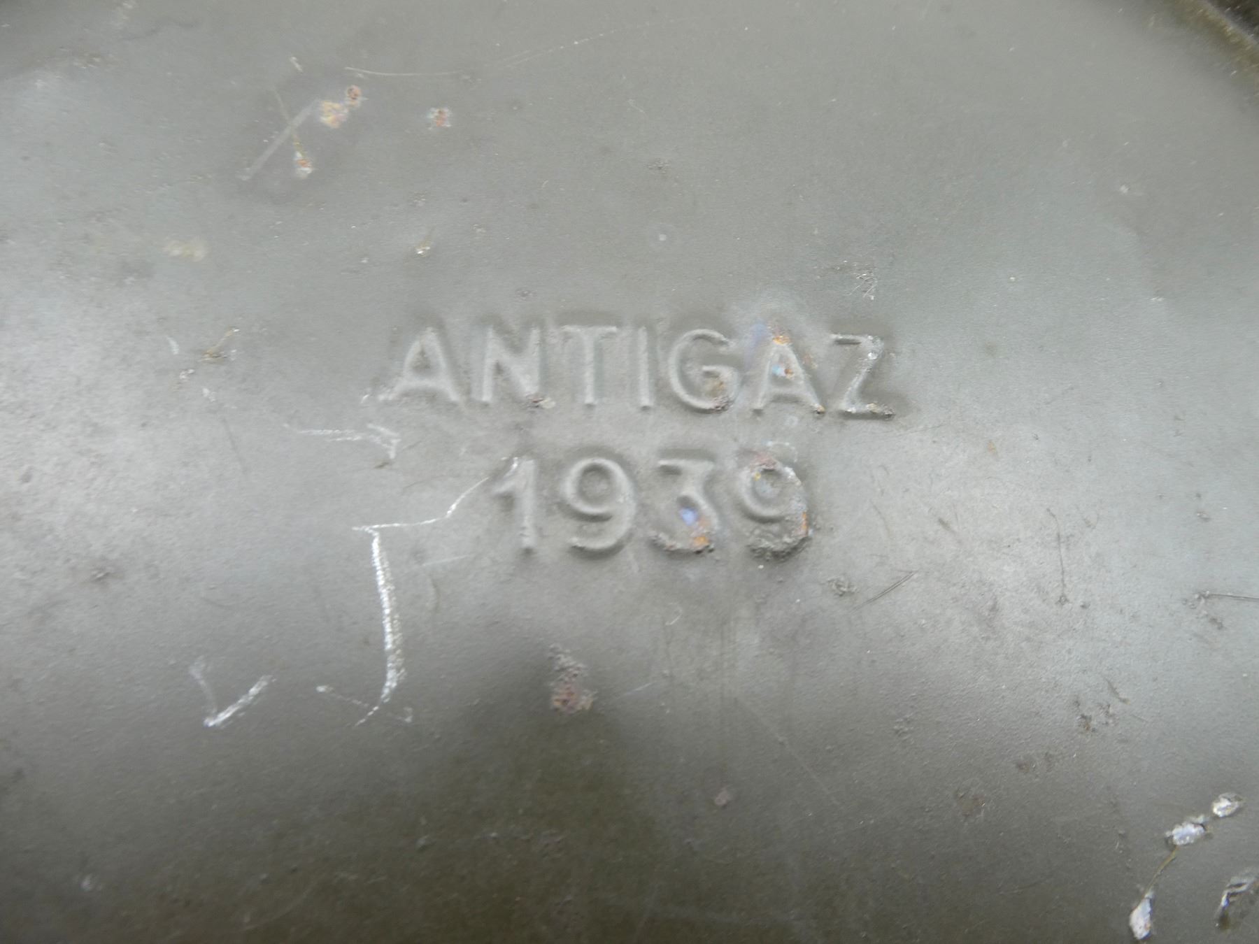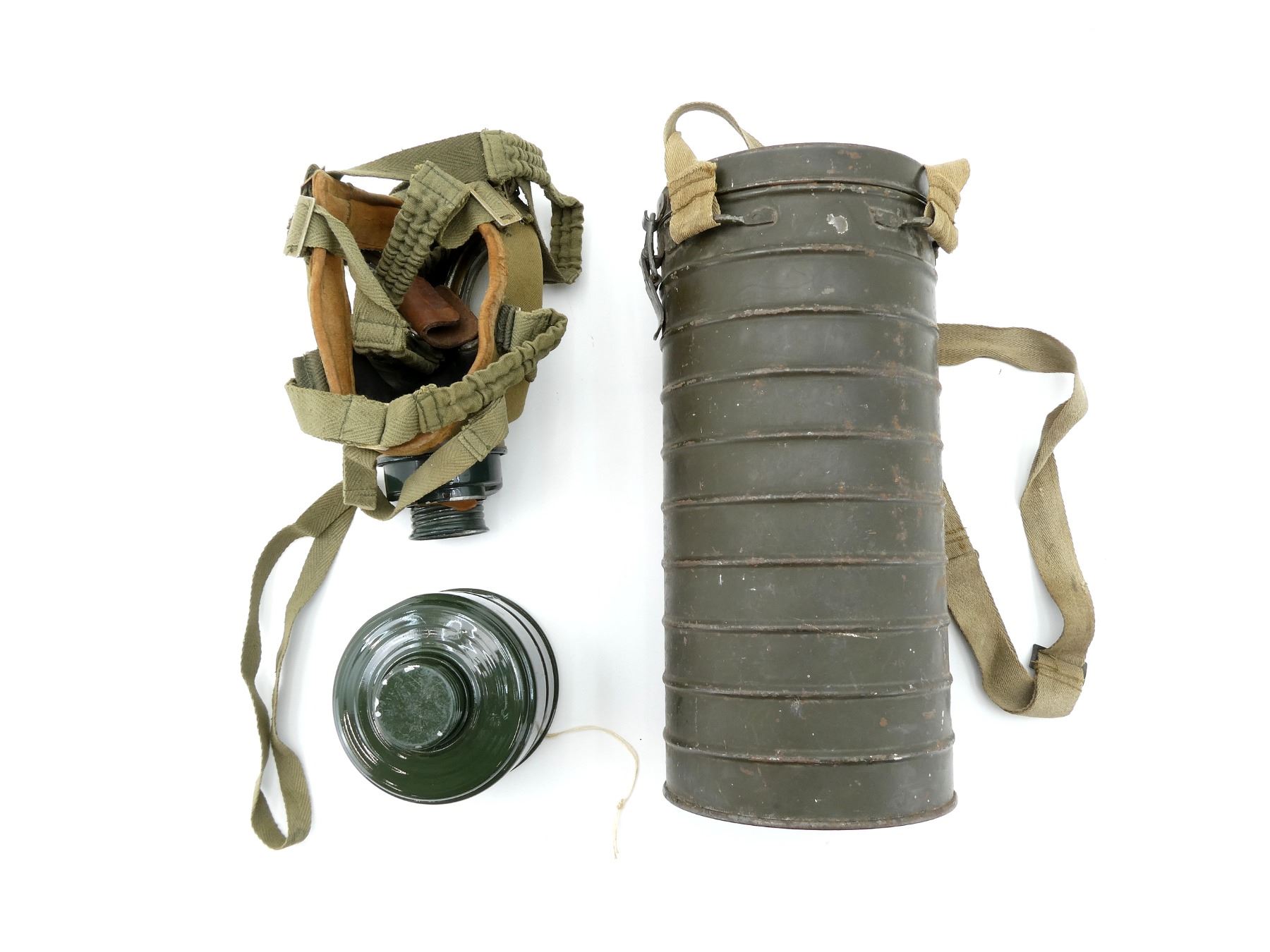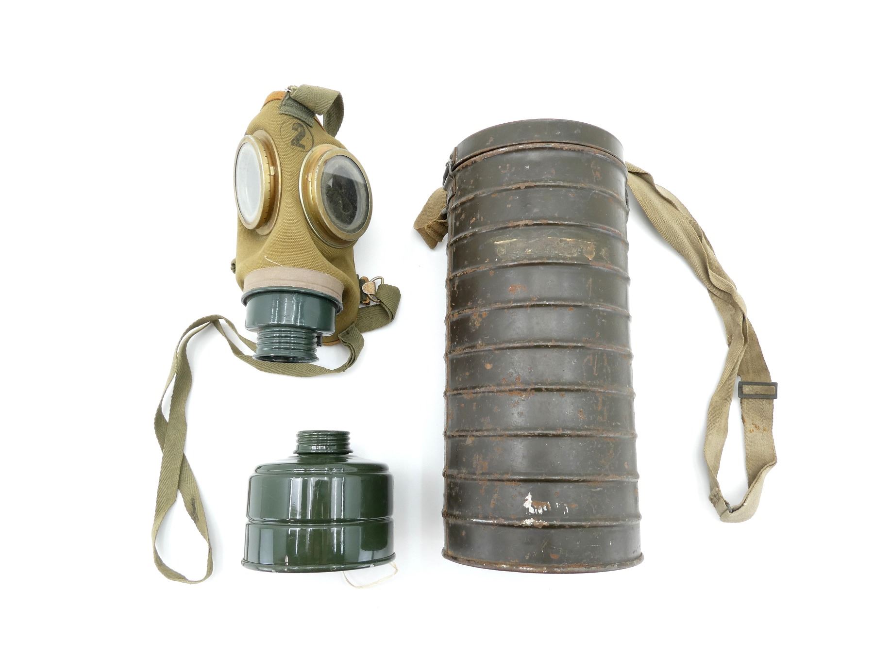 LOT INCLUDES; (1) HUNGARIAN CIVILIAN M76 GAS MASK, TAN CANVAS FACE PIECE, MARKED: "2", CANVAS RUBBERIZED INSIDE, GREEN CANVAS ADJUSTABLE HEAD STRAPS, NO VISIBLE MARKINGS, LENSES INTACT, SHOWS AGE / WEAR, COMES WITH (1) GREEN PAINTED FILTER, MARKED: "72", "11 13" & (1) ROMANIAN MD-35 GAS MASK CANNISTER (CAN ONLY), LID MARKED: "125404" OVER "AG" OVER "V" IN A TRIANGLE, BOTTOM MARKED: "ANTIGAZ, 1939", INK STAMP BELOW LID LATCH, WITH ADJUSTABLE CANVAS SHOULDER STRAP, SHOWS AGE / WEAR, APPROX. 5 5/8" DIA. & OVERALL LENGTH APPROX. 12 1/8". SEE PHOTOS.