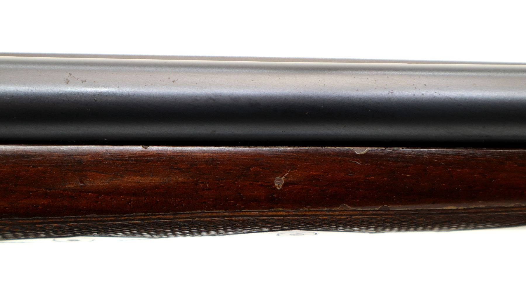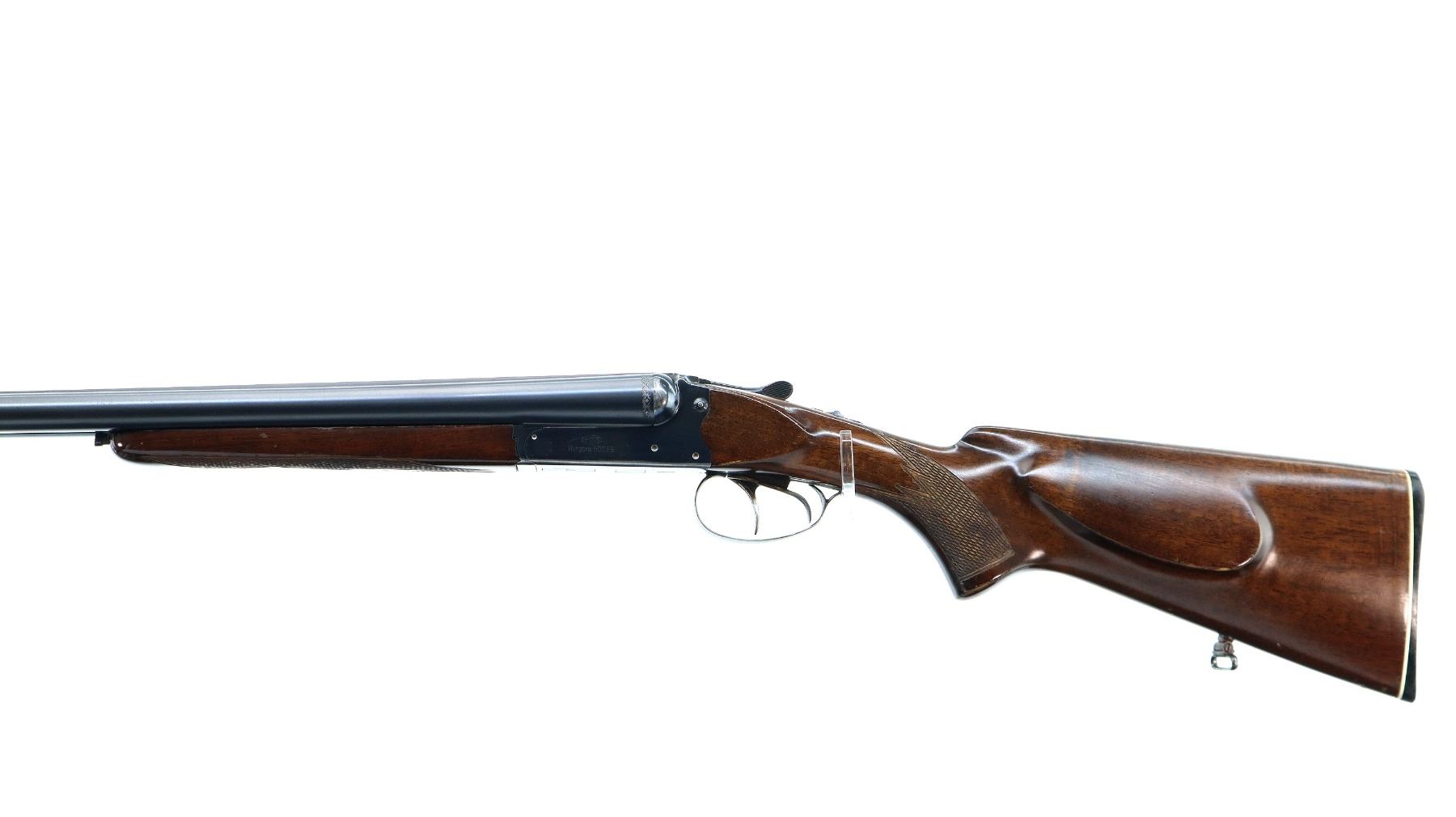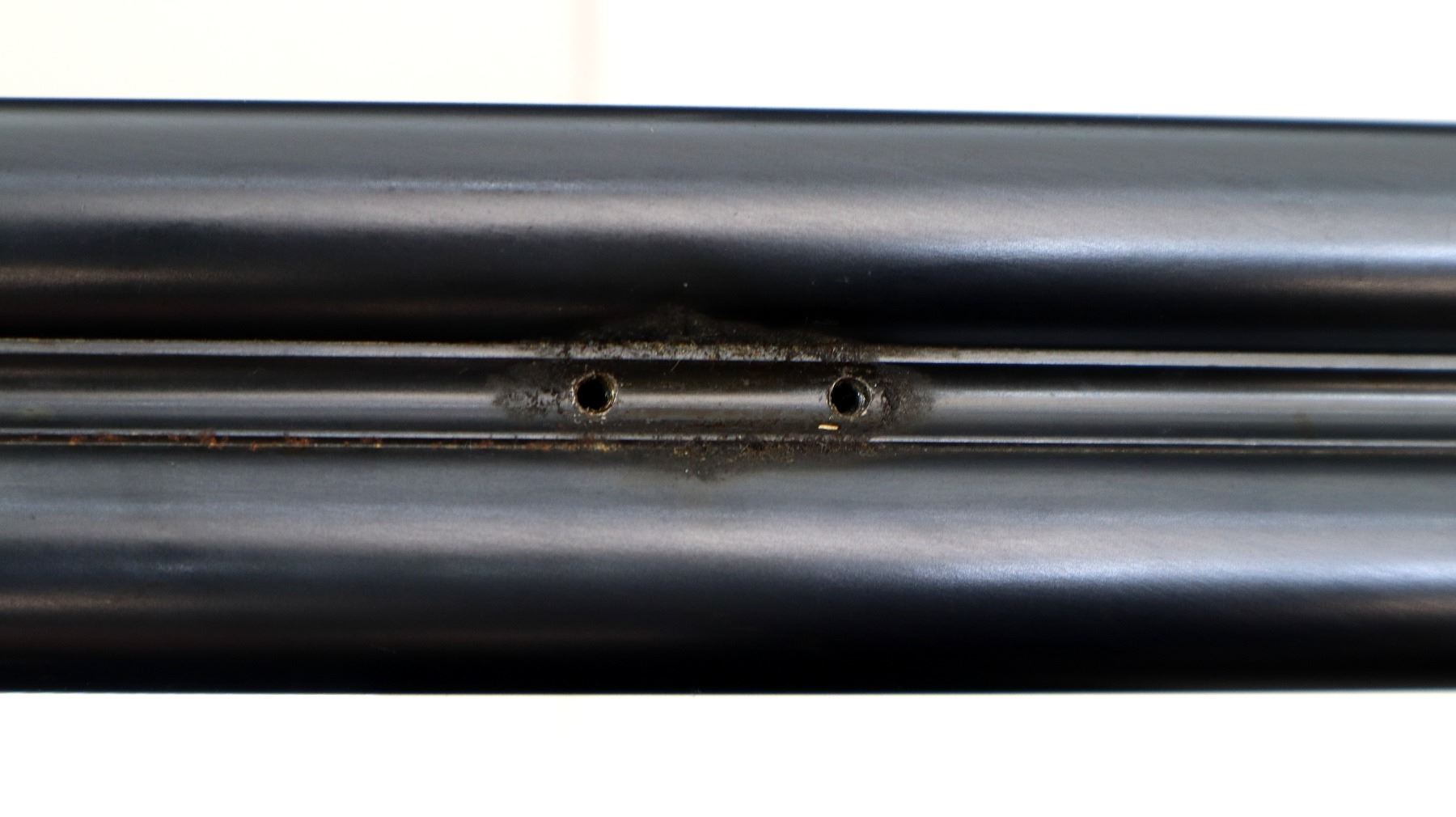 Main Description: Brass bead, blued finish, raised rib, automatic safety, ejectors, cocking indicators, double triggers. Two piece wood stocks, checkered forearm and pistol grip, European cheek rest, rear sling swivel only missing front holes are present.