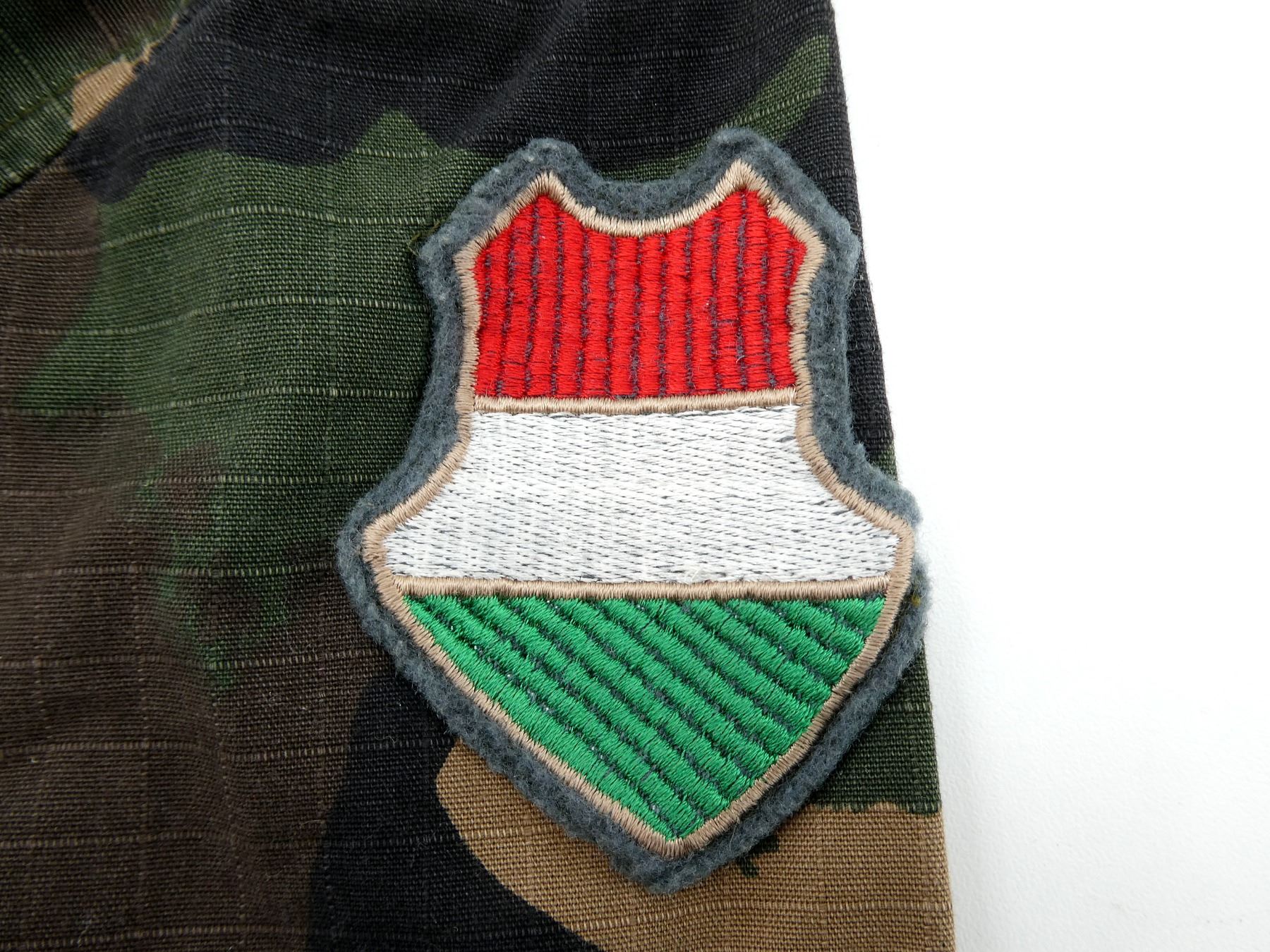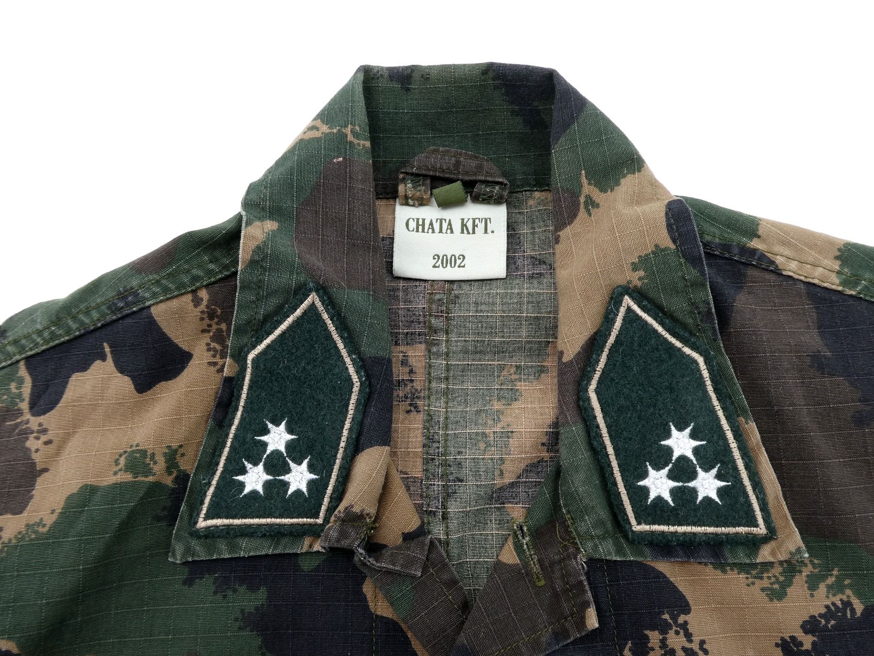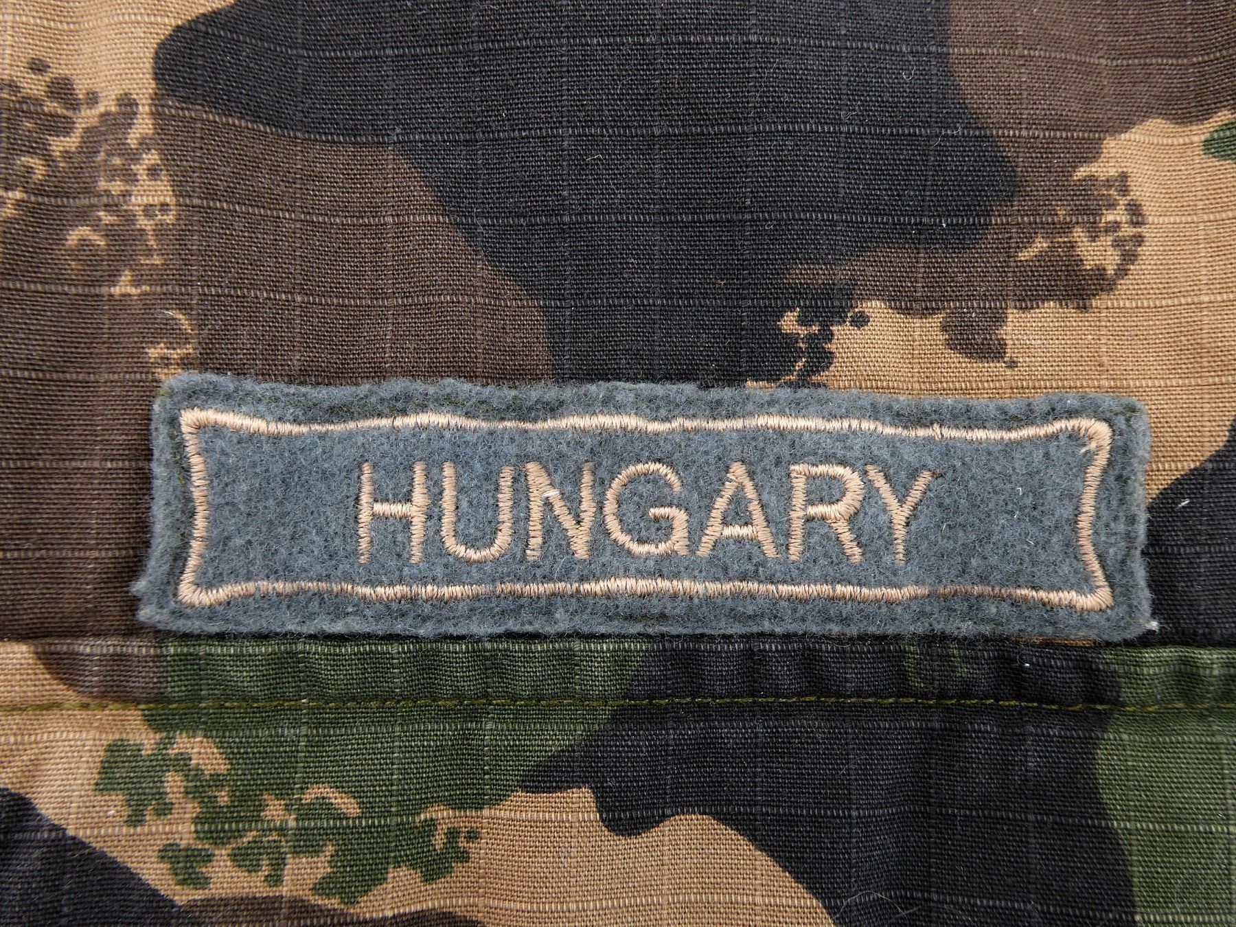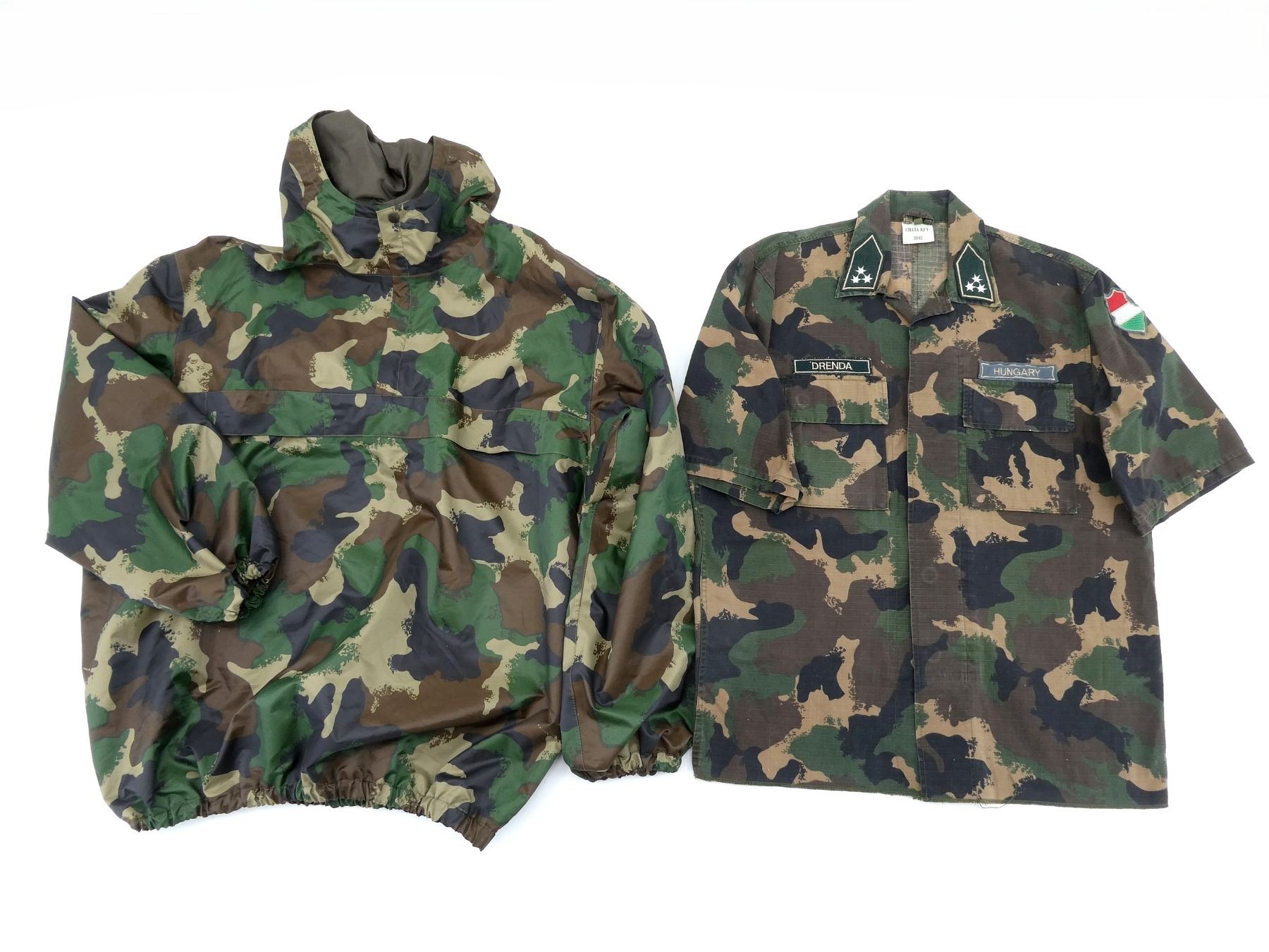 LOT INCLUDES; (1) SHORT SLEEVED CAMO BUTTON-UP SHIRT, 4-COLOUR CAMO ADOPTED IN 1990 SIMILAR TO WOODLAND PATTERN, CORPORAL RANK COLLAR TABS, HUNGARIAN CREST SHOULDER BADGE, NAME TAG MARKED: "DRENDA", TAG MARKED: "HUNGARY", LABELS MARKED: "52", "CHATA KFT., 2002", SHOWS WEAR, SHOULDER WIDTH APPROX. 18.5" & (1) LONG-SLEEVED CAMO WATER-PROOF PARKA, 4-COLOUR CAMO ADOPTED IN 1990 SIMILAR TO WOODLAND PATTERN, LABEL MARKED: "52" WITH VARIOUS OTHER FAINT / UN-CLEAR MARKINGS, PARTIALLY ZIPPERED FRONT (WORKS), HOODED, DRAWSTRING HOOD, SHOULDER WIDTH APPROX. 22". SEE PHOTOS.