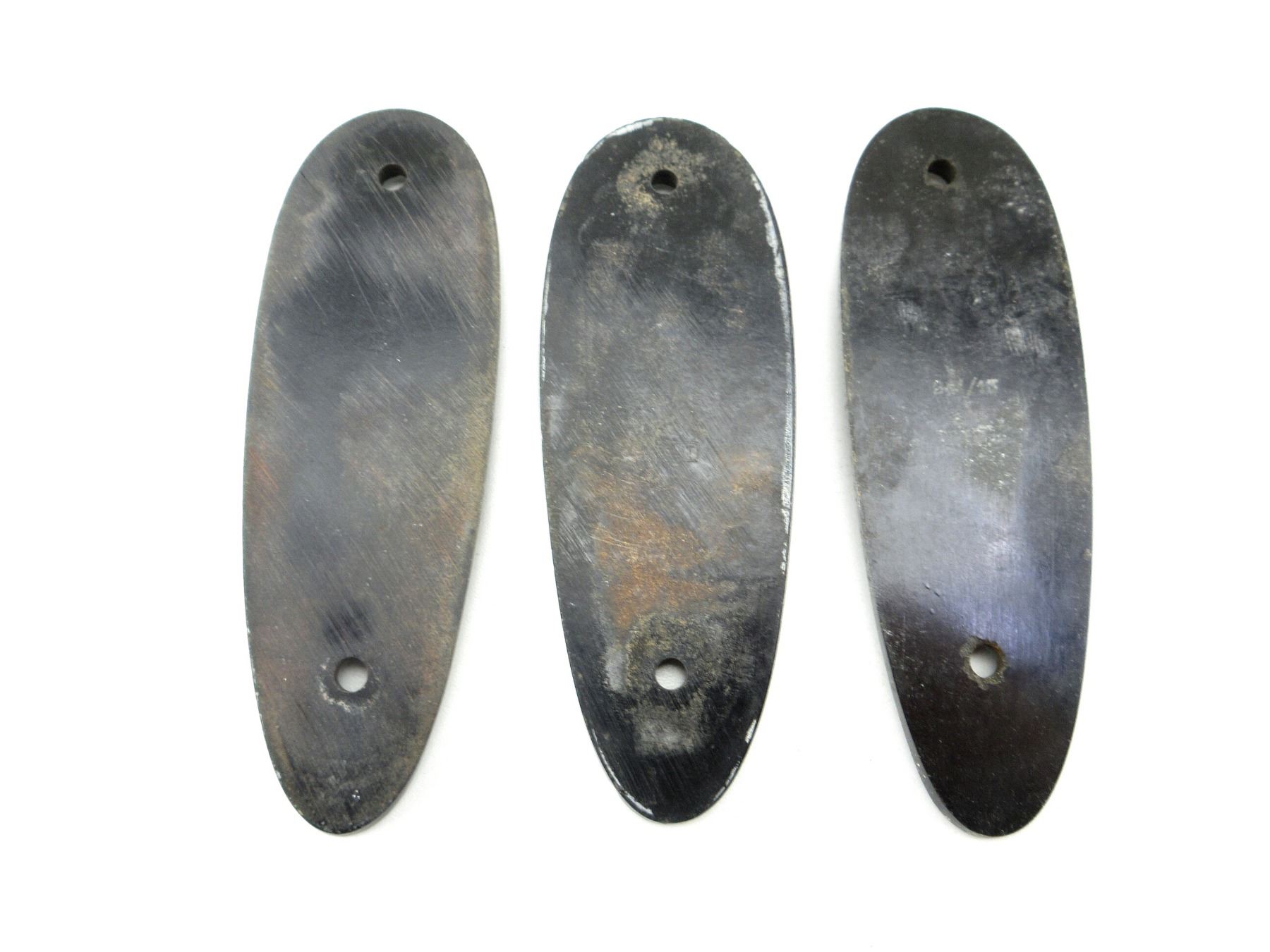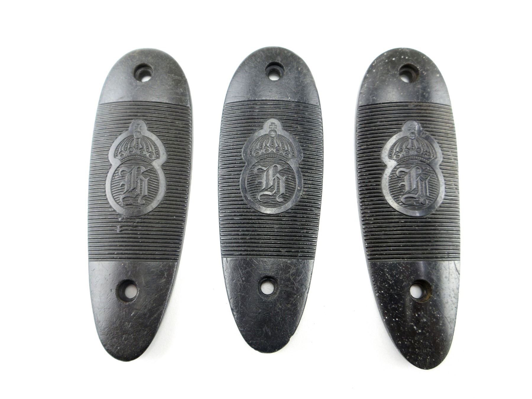 LOT INCLUDES; (3) BLACK POLYMER BUTT PLATES, NO SCREWS, OVERALL LENGTH APPROX. 5 1/8". MAY REQUIRE FITTING. SEE PHOTOS.