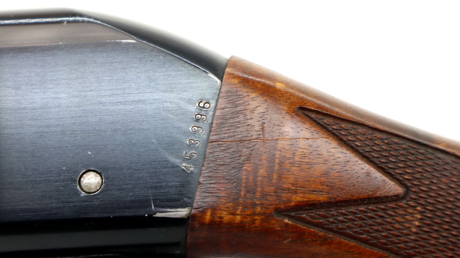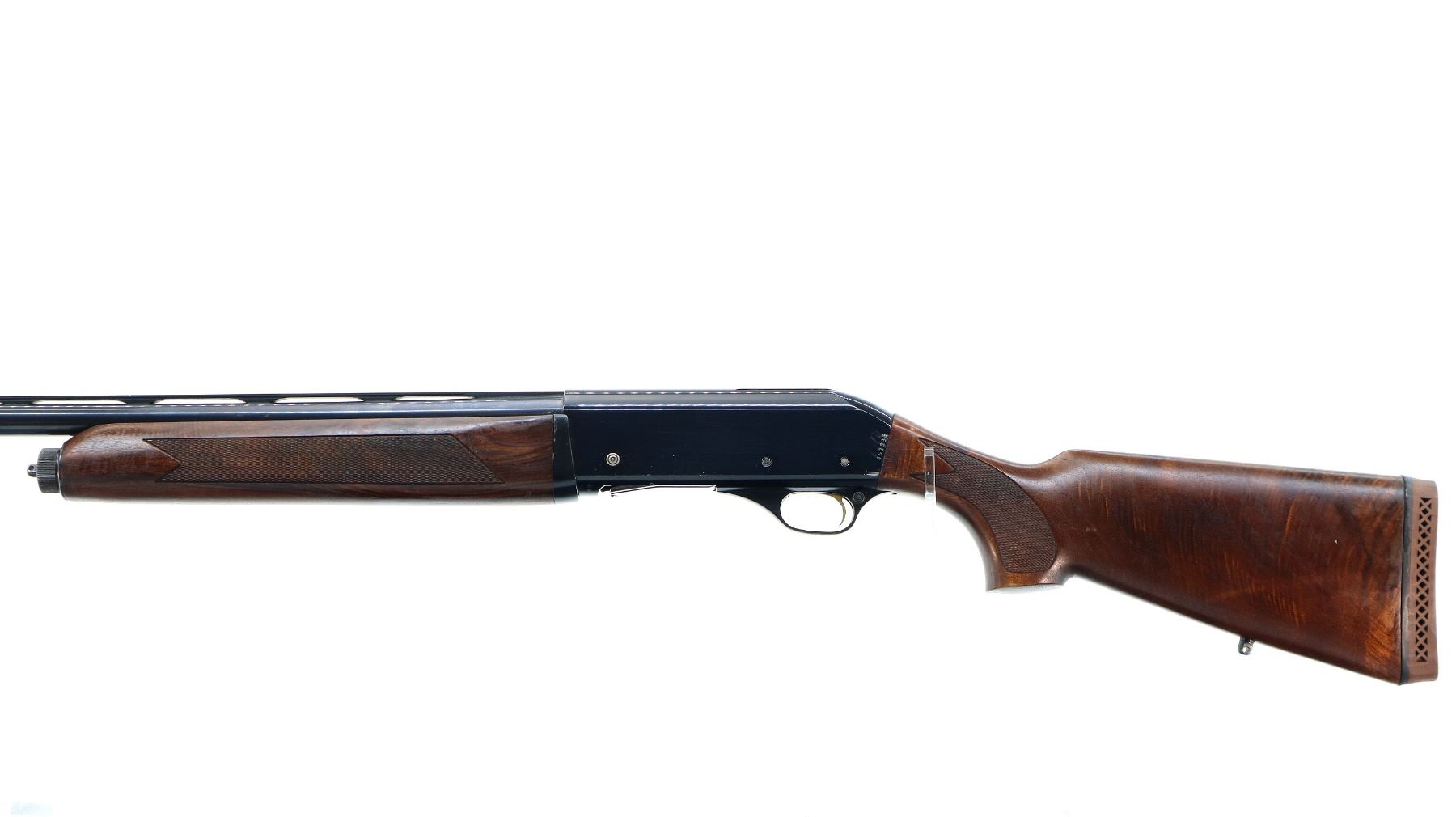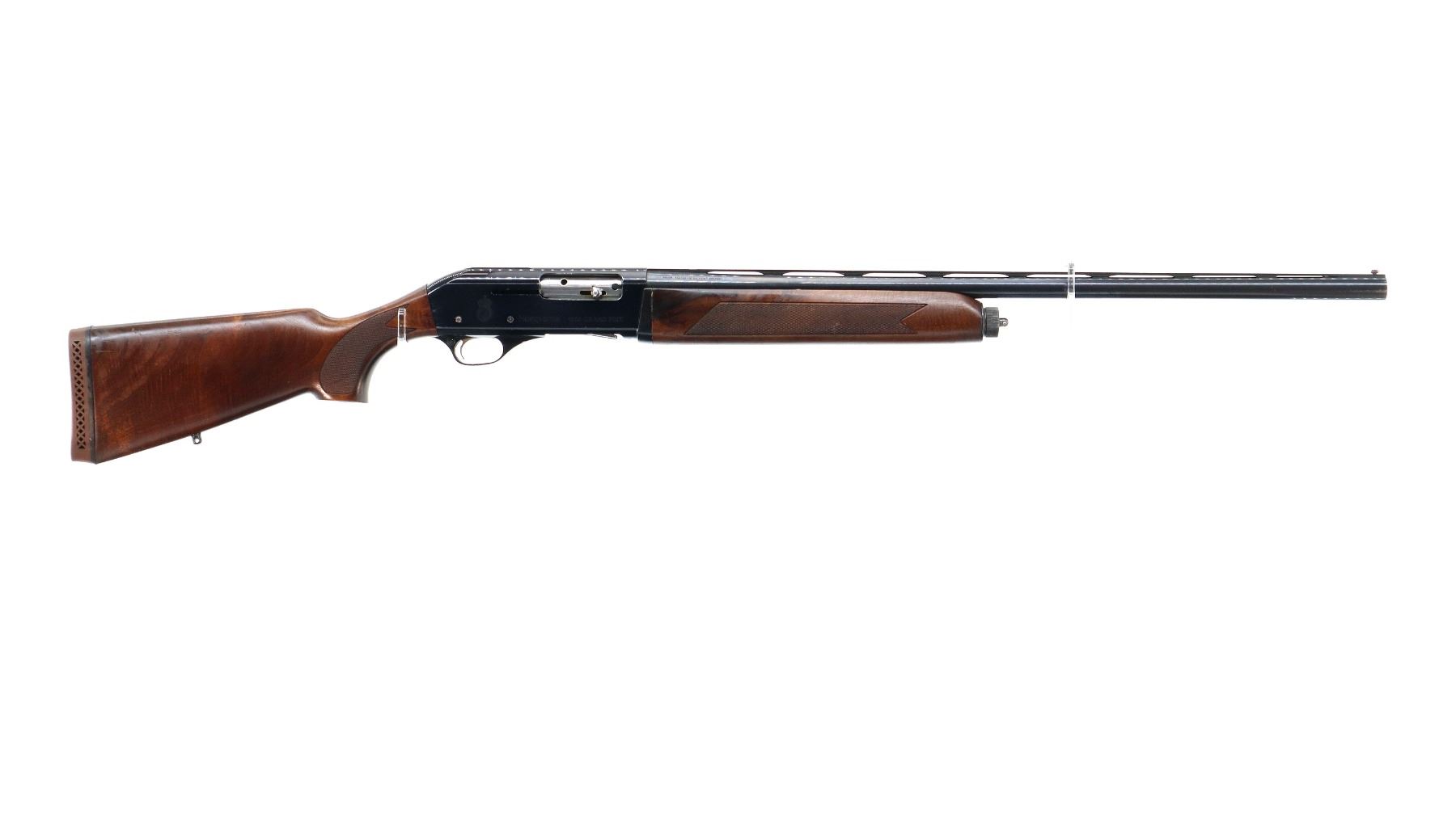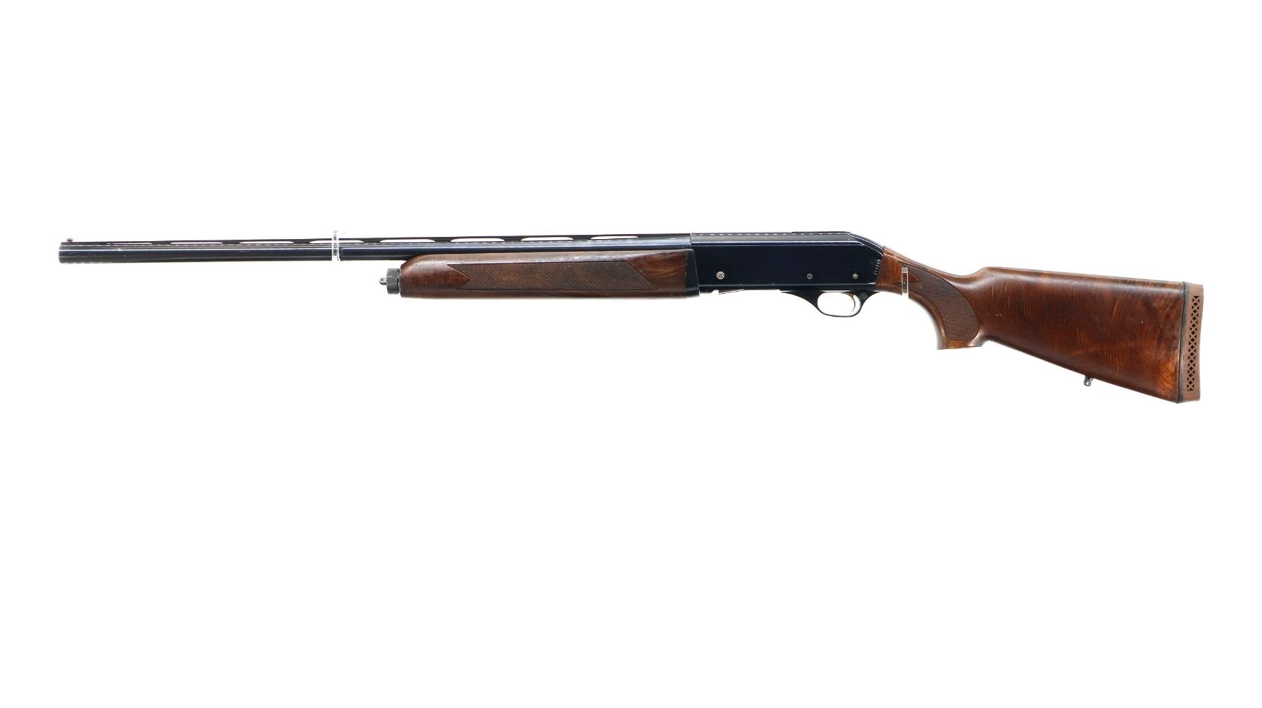 Main Description: Red fiber optic front bead, blued vent rib barrel, black alloy receiver drilled and tapped with no plug screws installed with grooved area at the rear. Two piece wood stocks, checkered forearm and pistol grip, cracked behind receiver, brown vented rubber recoil pad, swivel studs.