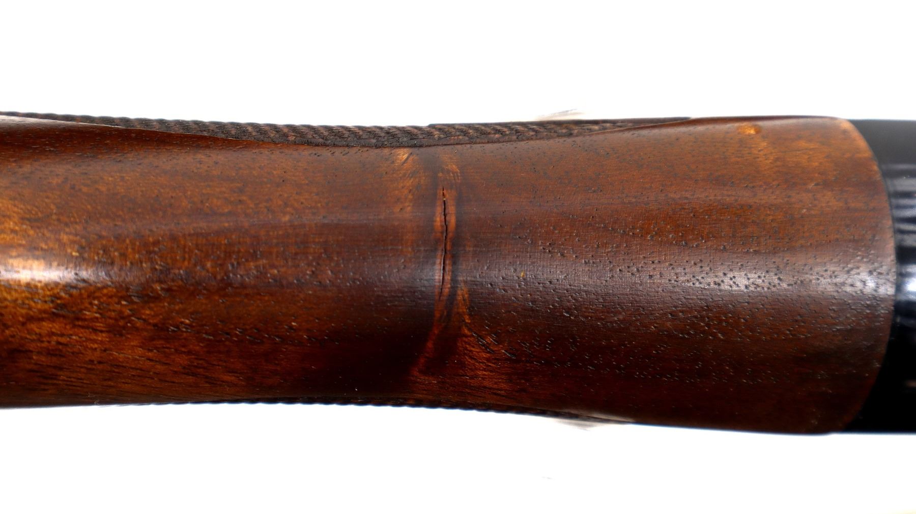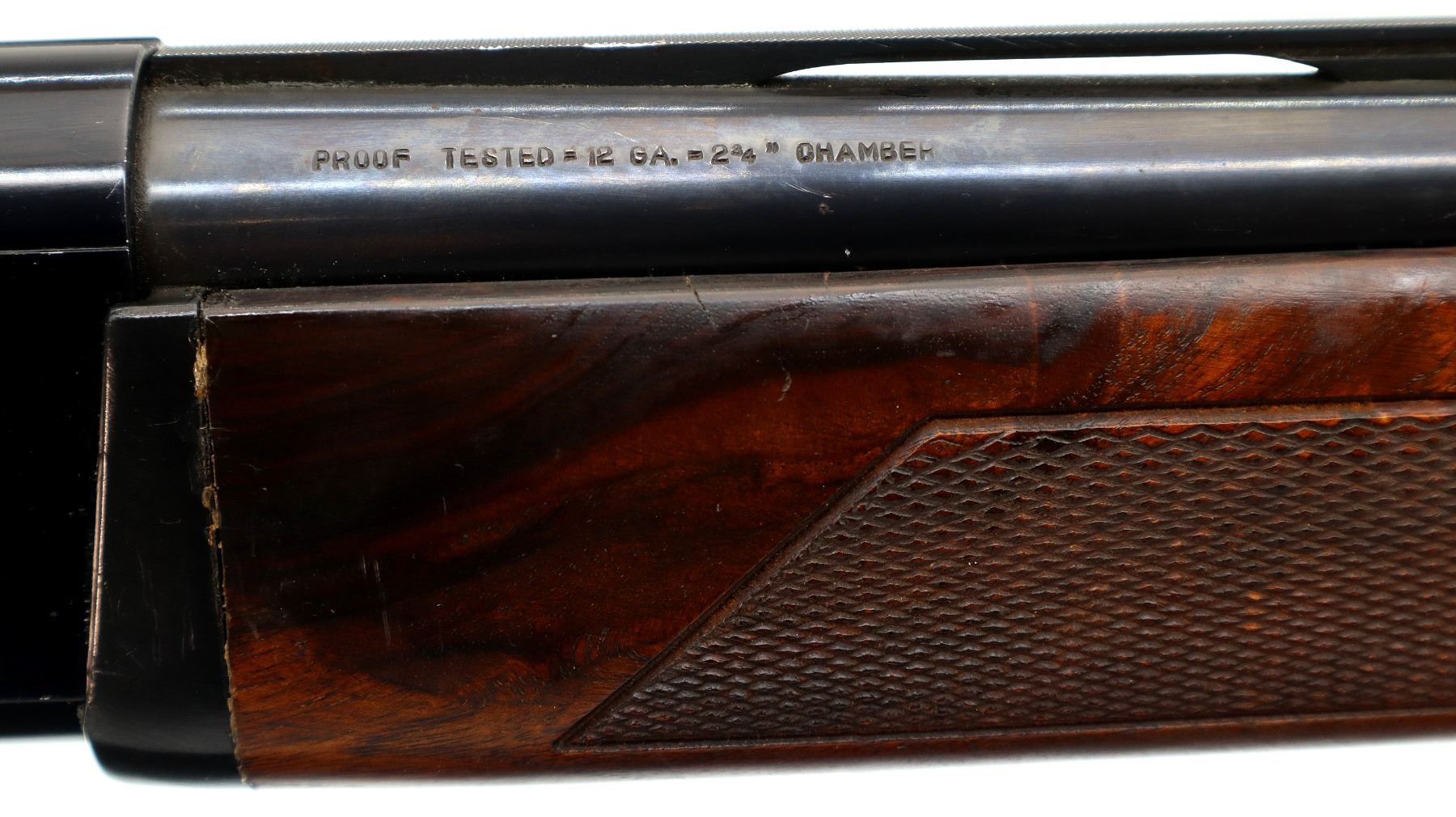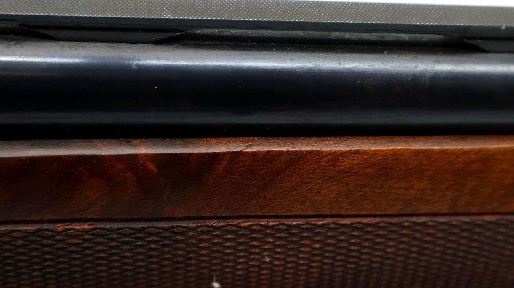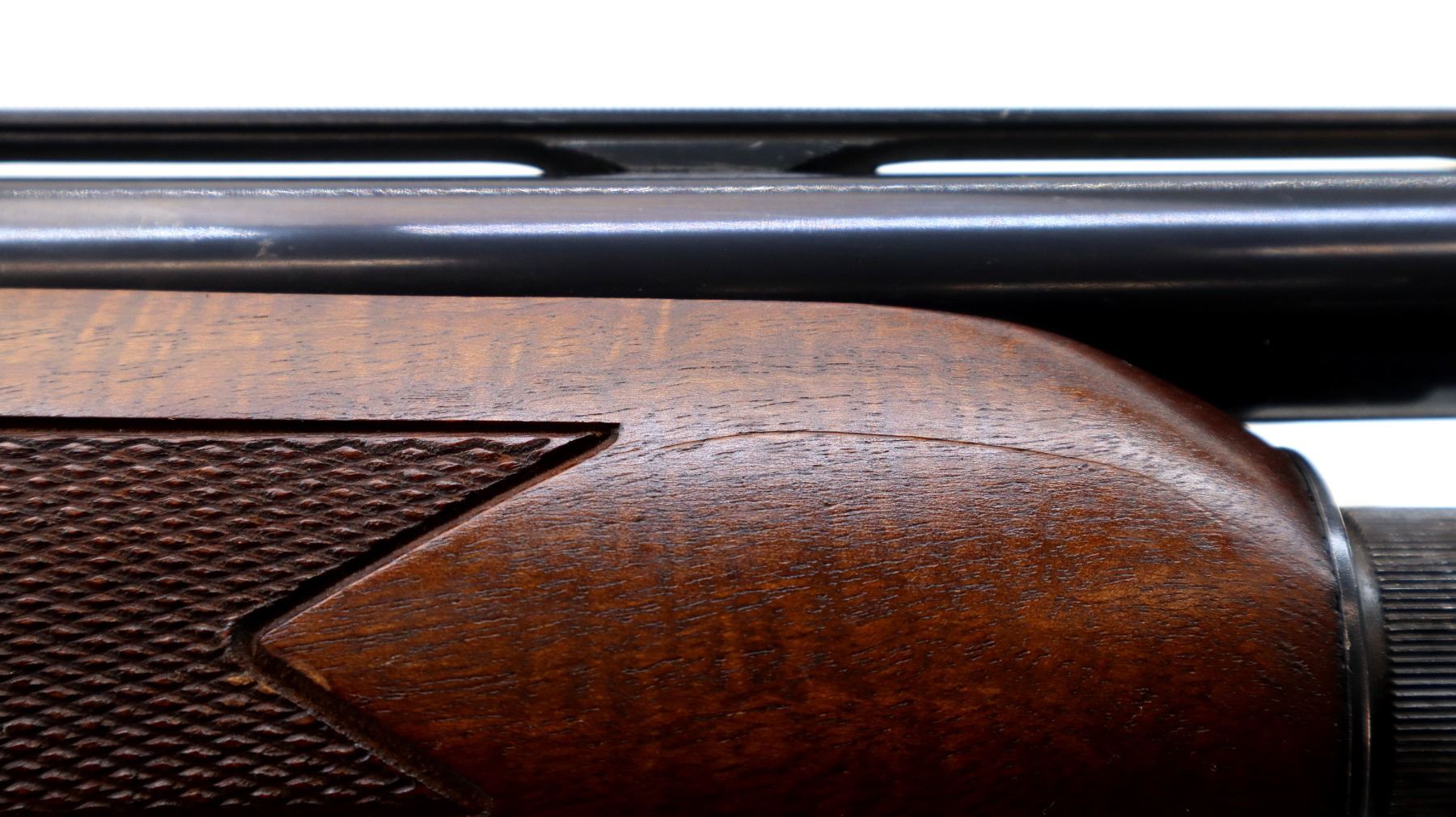 Main Description: Red fiber optic front bead, blued vent rib barrel, black alloy receiver drilled and tapped with no plug screws installed with grooved area at the rear. Two piece wood stocks, checkered forearm and pistol grip, cracked behind receiver, brown vented rubber recoil pad, swivel studs.