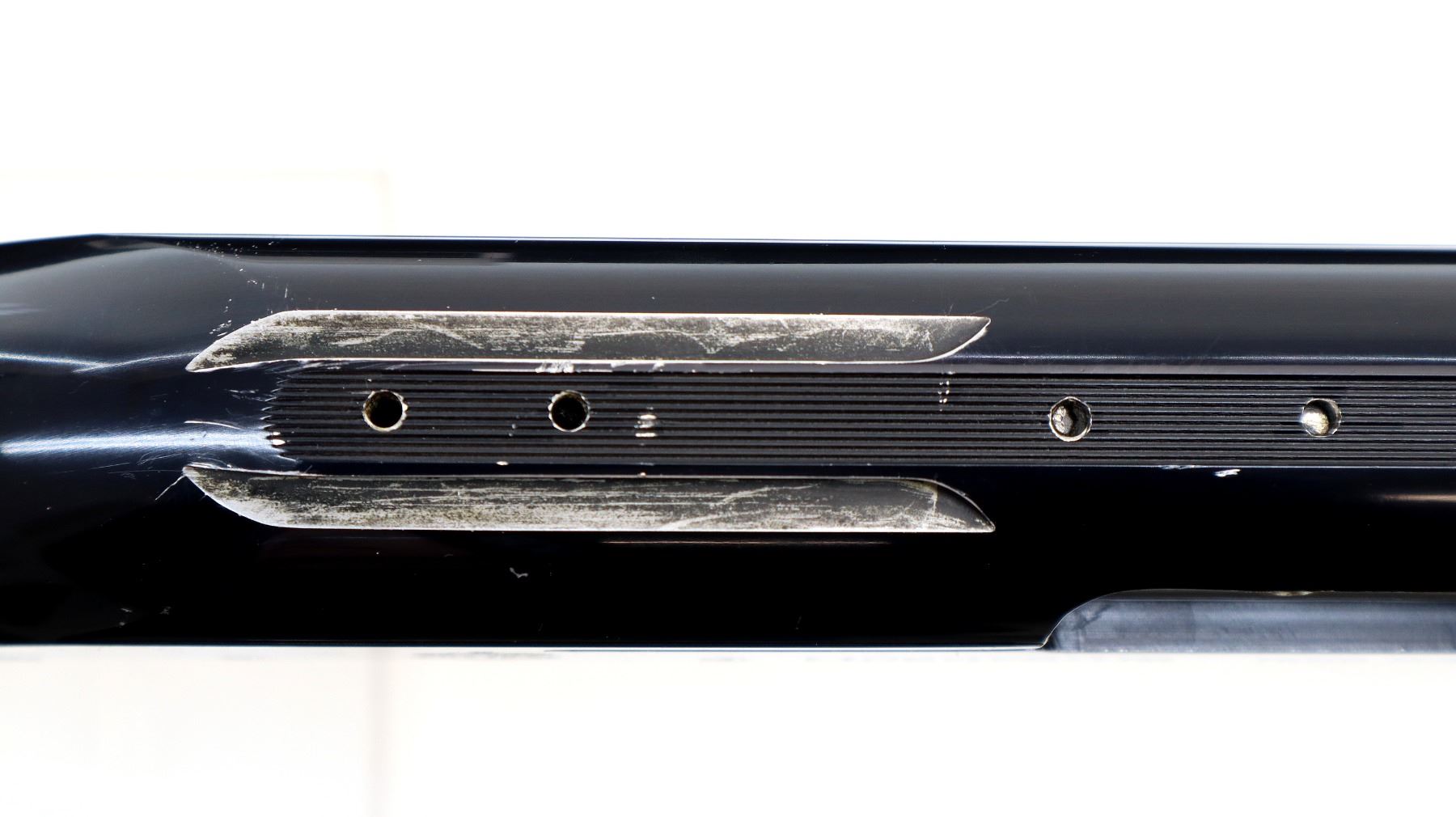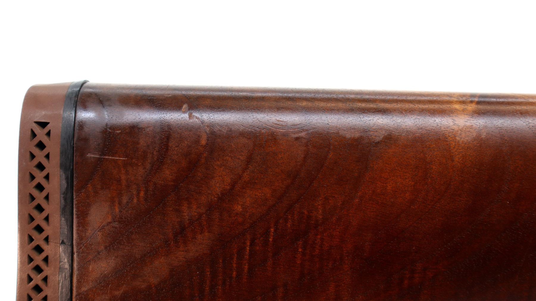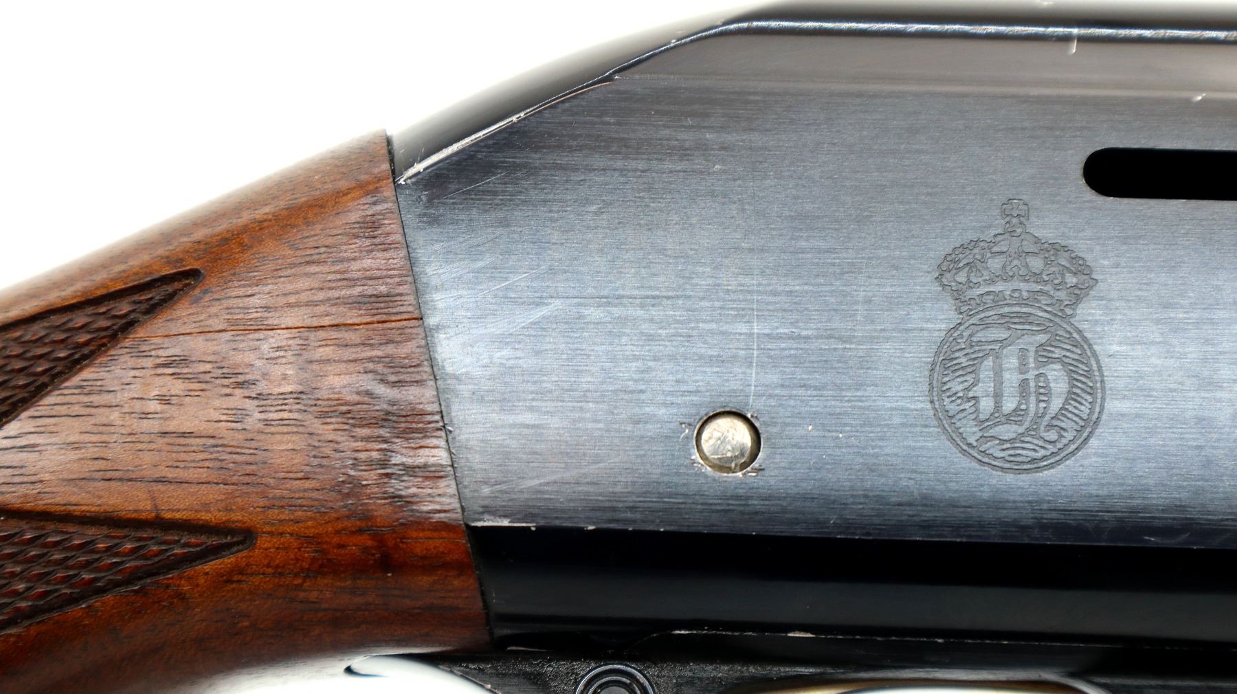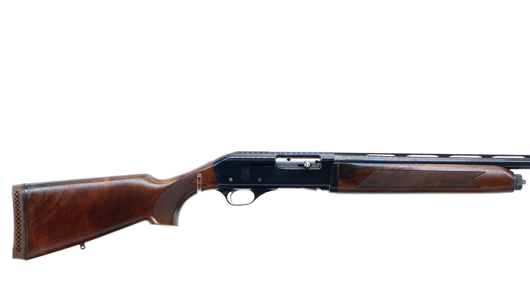 Main Description: Red fiber optic front bead, blued vent rib barrel, black alloy receiver drilled and tapped with no plug screws installed with grooved area at the rear. Two piece wood stocks, checkered forearm and pistol grip, cracked behind receiver, brown vented rubber recoil pad, swivel studs.