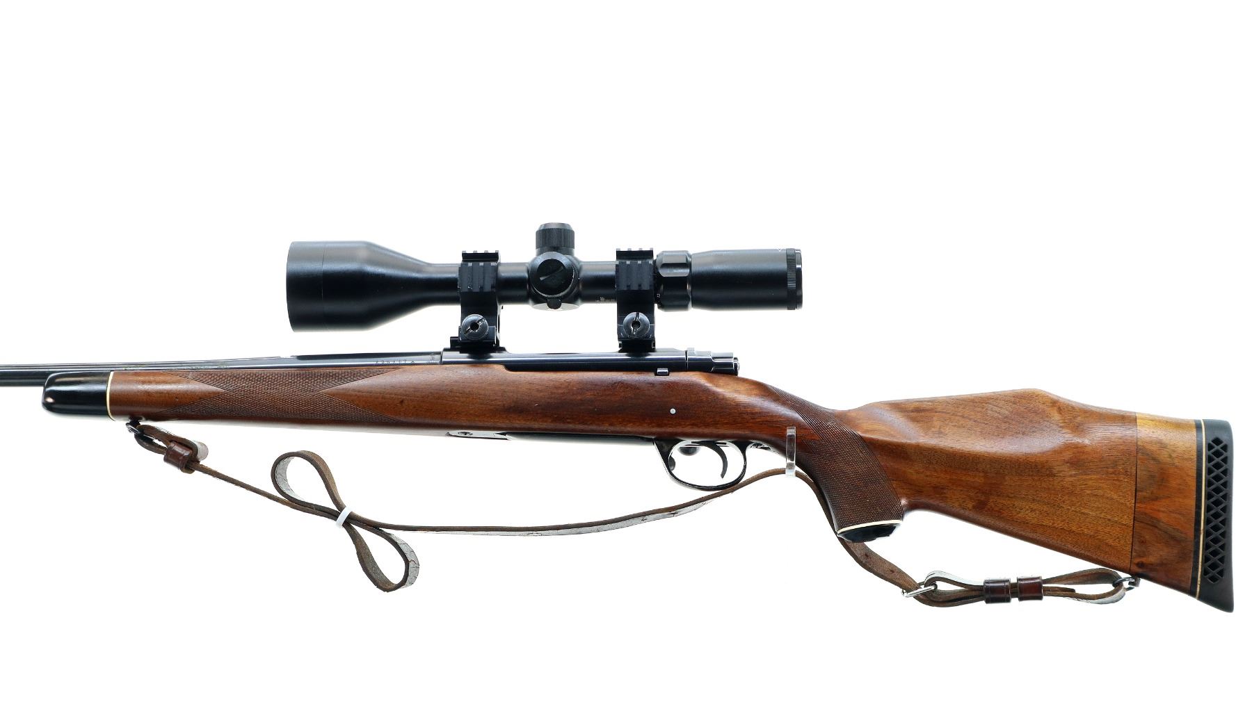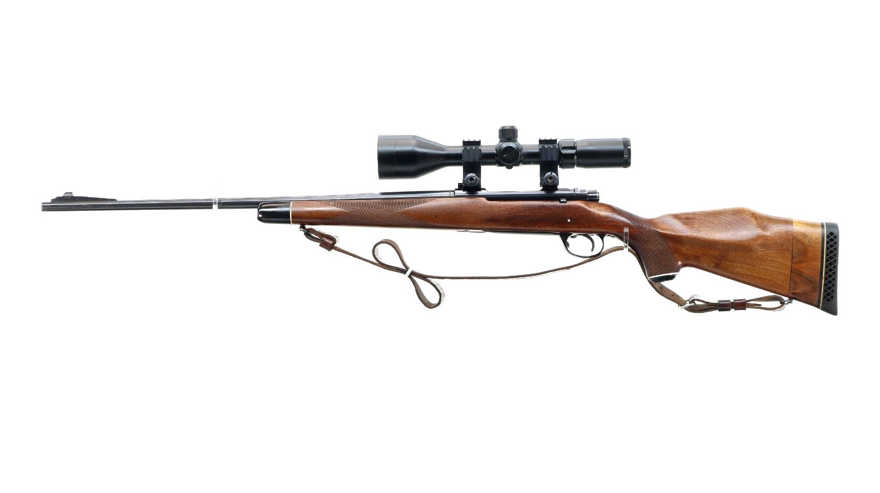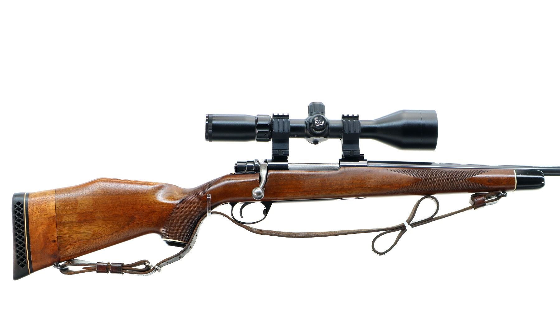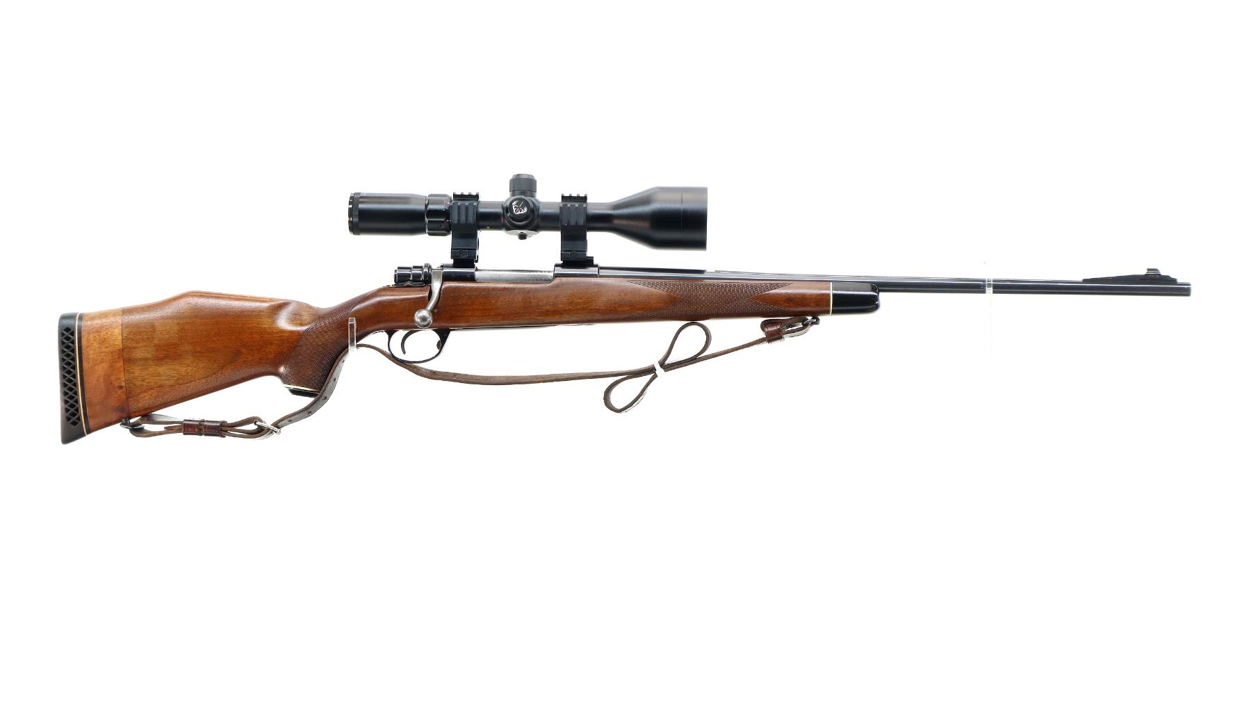 Main Description: Blade front sight with ramp, missing rear sight dovetail present, blued finish, receiver drilled and tapped with unknown 3-12 x 56 scope installed, clear optics, fine crosshair with center illuminated dot (does not function). Jeweled bolt with smooth knob. One piece wood stock, black polymer forend and pistol grip caps, checkered forearm and pistol grip, cracked and repaired through wrist, cheek rest, black vented rubber recoil pad with wood extension, 13.75" LOP, hinged floor plate, sling swivels with brown leather sling.