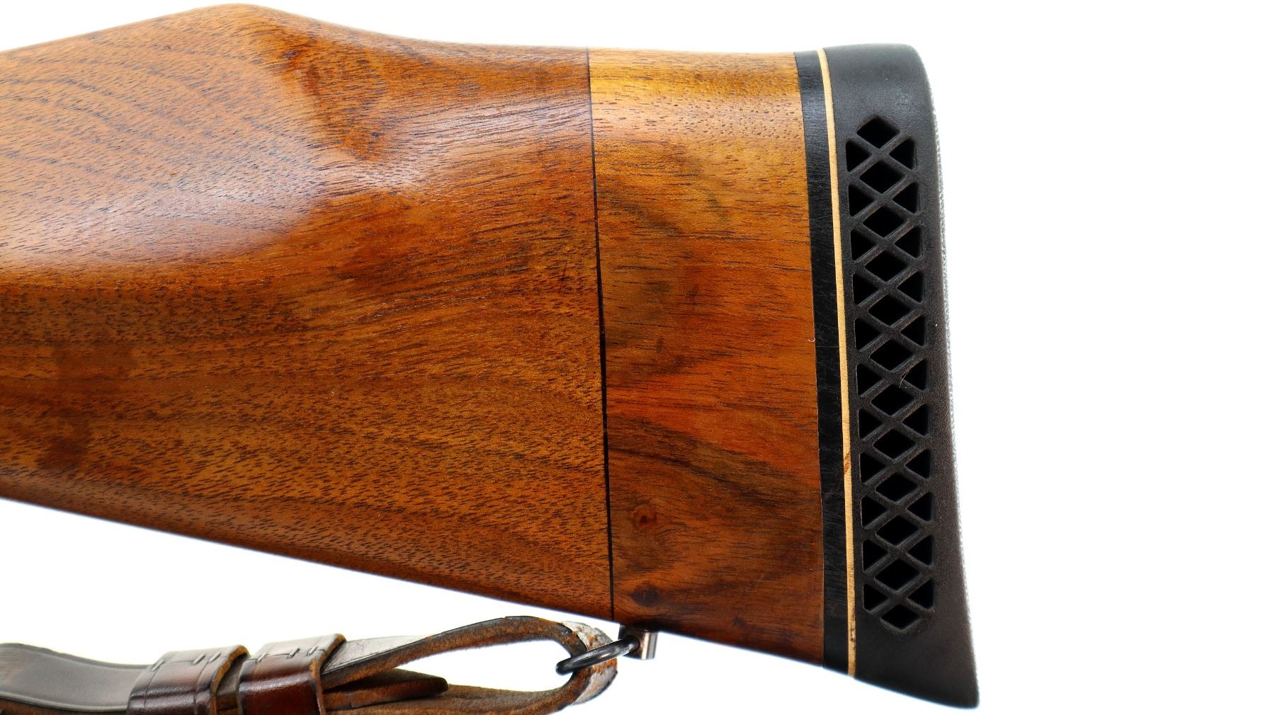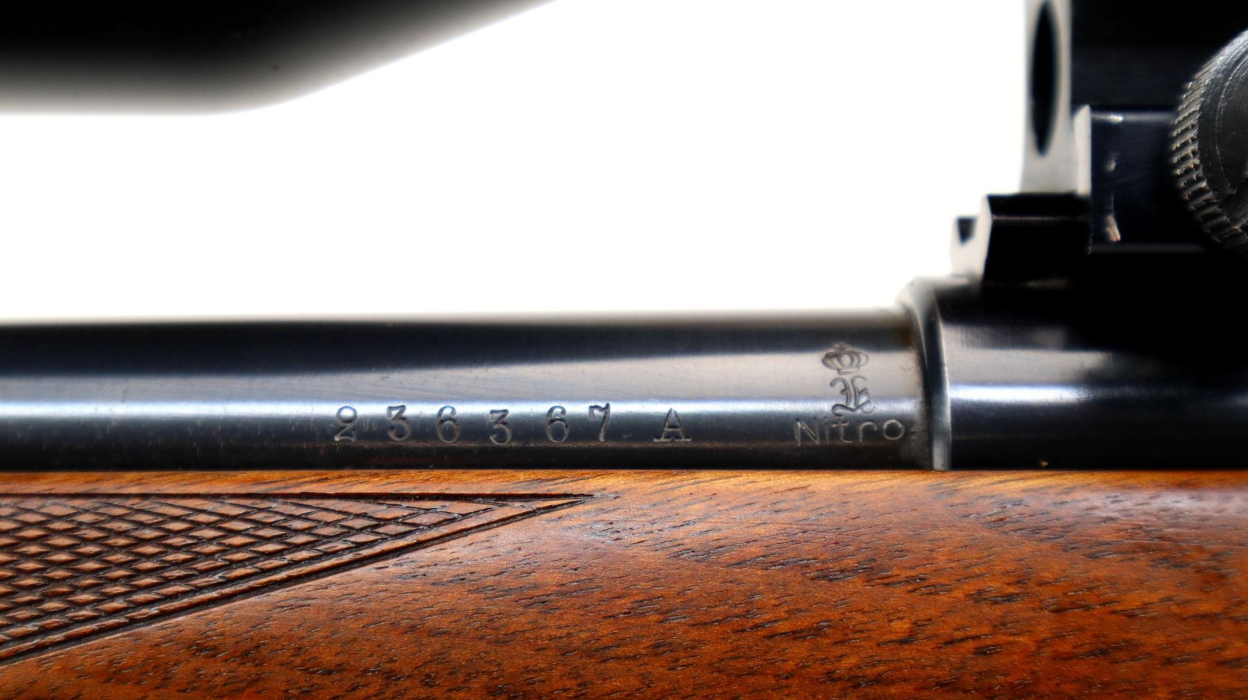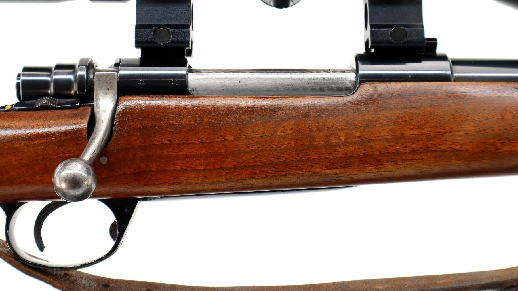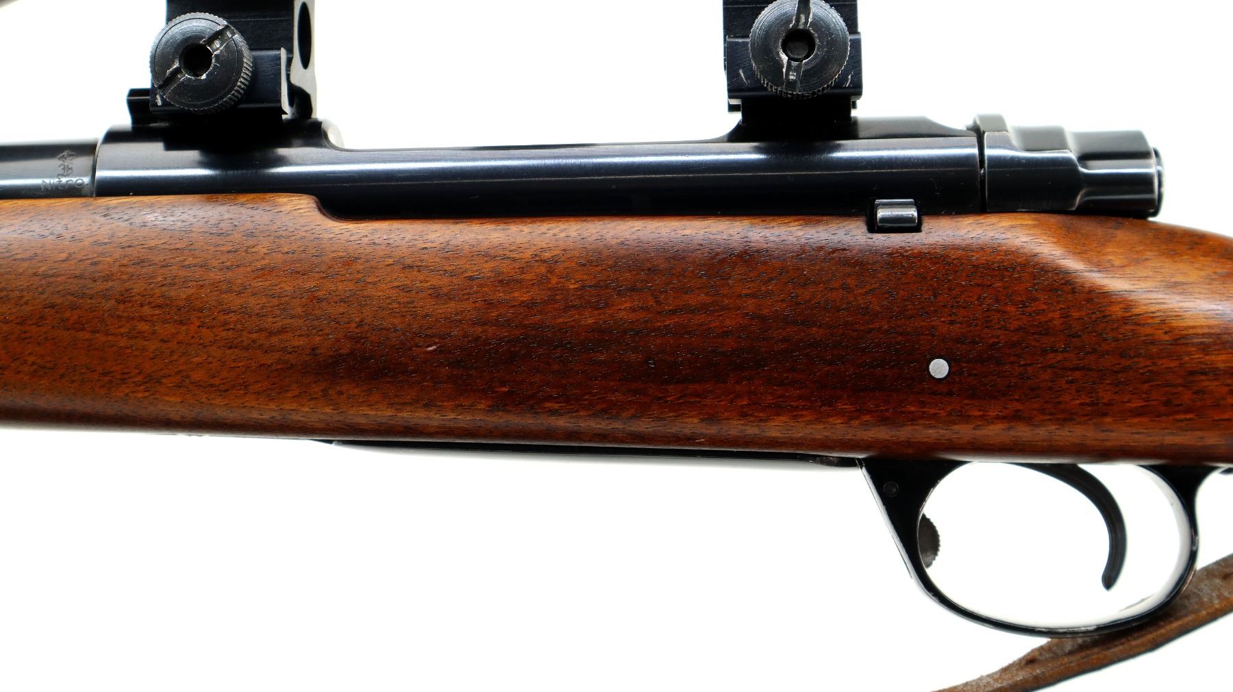 Main Description: Blade front sight with ramp, missing rear sight dovetail present, blued finish, receiver drilled and tapped with unknown 3-12 x 56 scope installed, clear optics, fine crosshair with center illuminated dot (does not function). Jeweled bolt with smooth knob. One piece wood stock, black polymer forend and pistol grip caps, checkered forearm and pistol grip, cracked and repaired through wrist, cheek rest, black vented rubber recoil pad with wood extension, 13.75" LOP, hinged floor plate, sling swivels with brown leather sling.