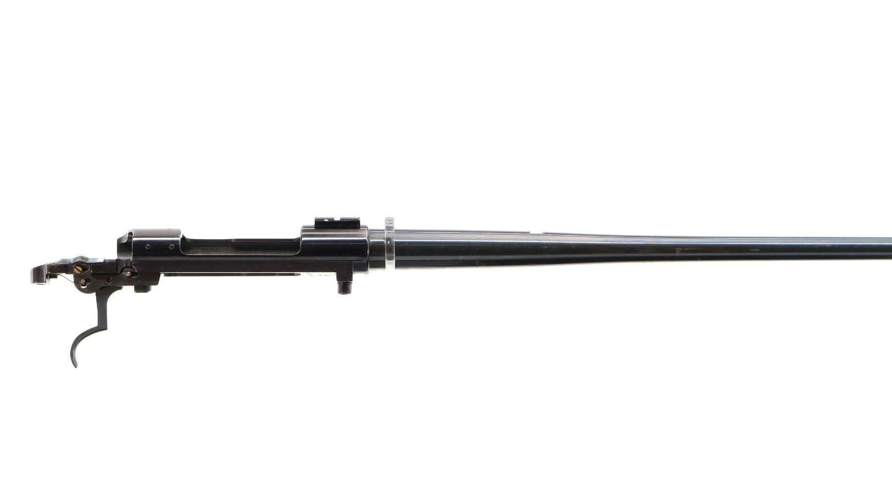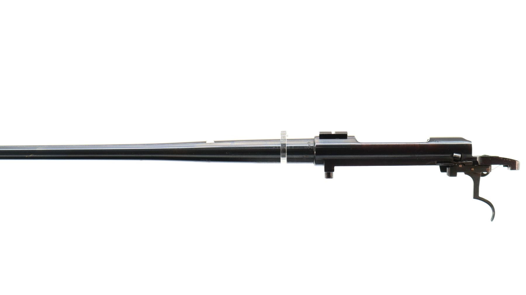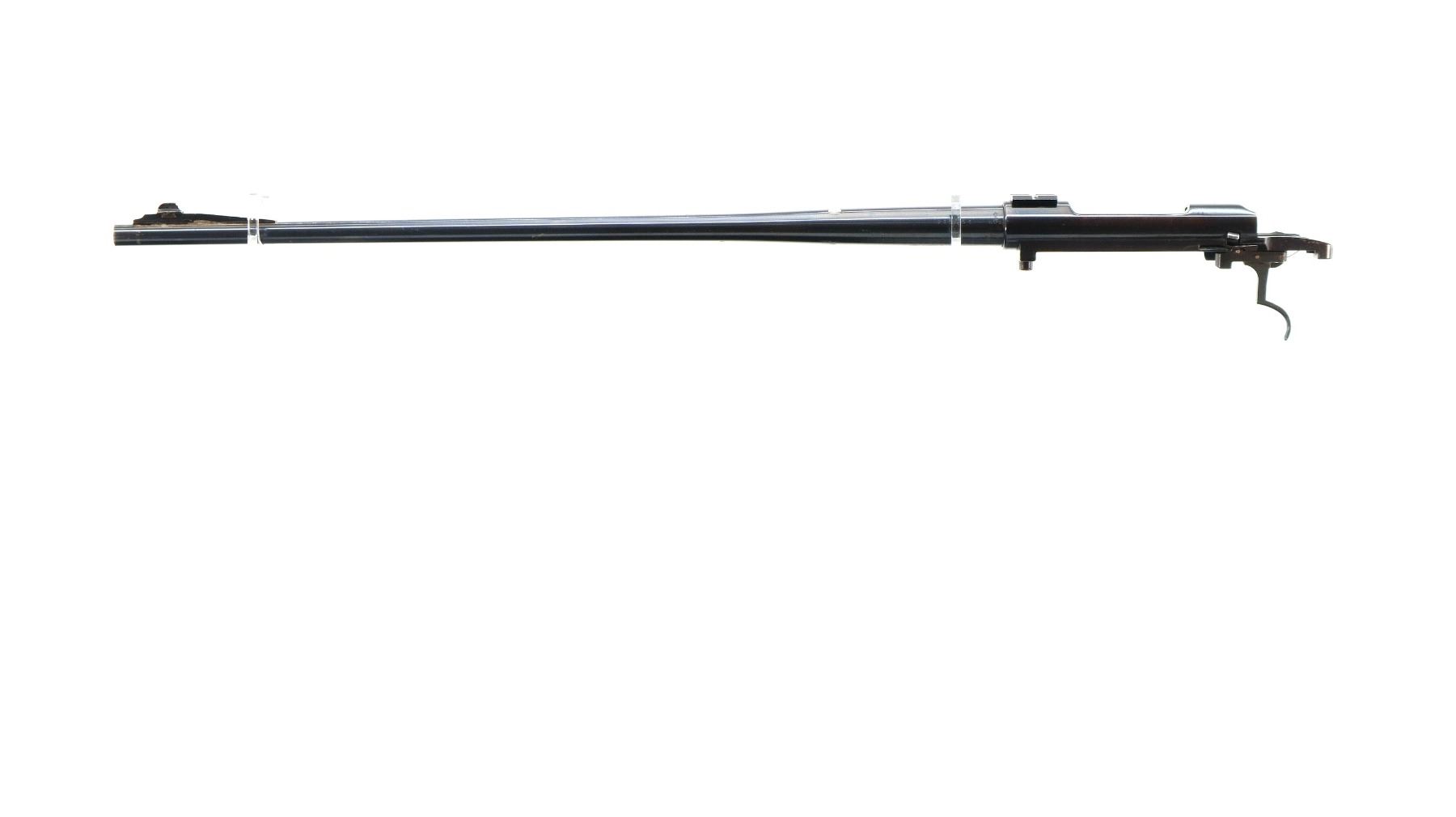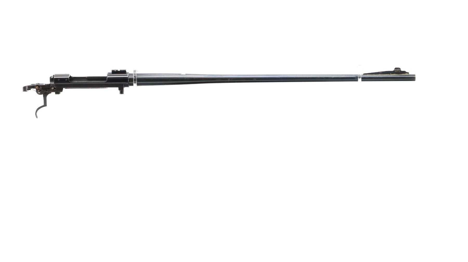 Main Description: Blade front sight with ramp, missing rear sight dovetail present, blued finish, receiver drilled and tapped with front base only installed, includes trigger, sear and safety with bolt stop assembly. Missing all other parts and stock.