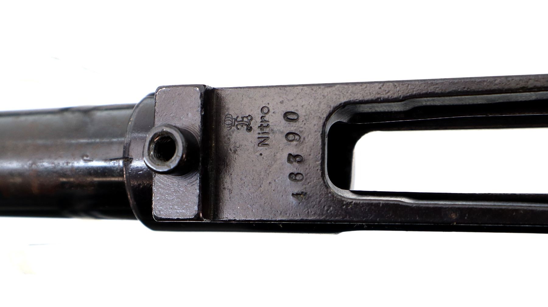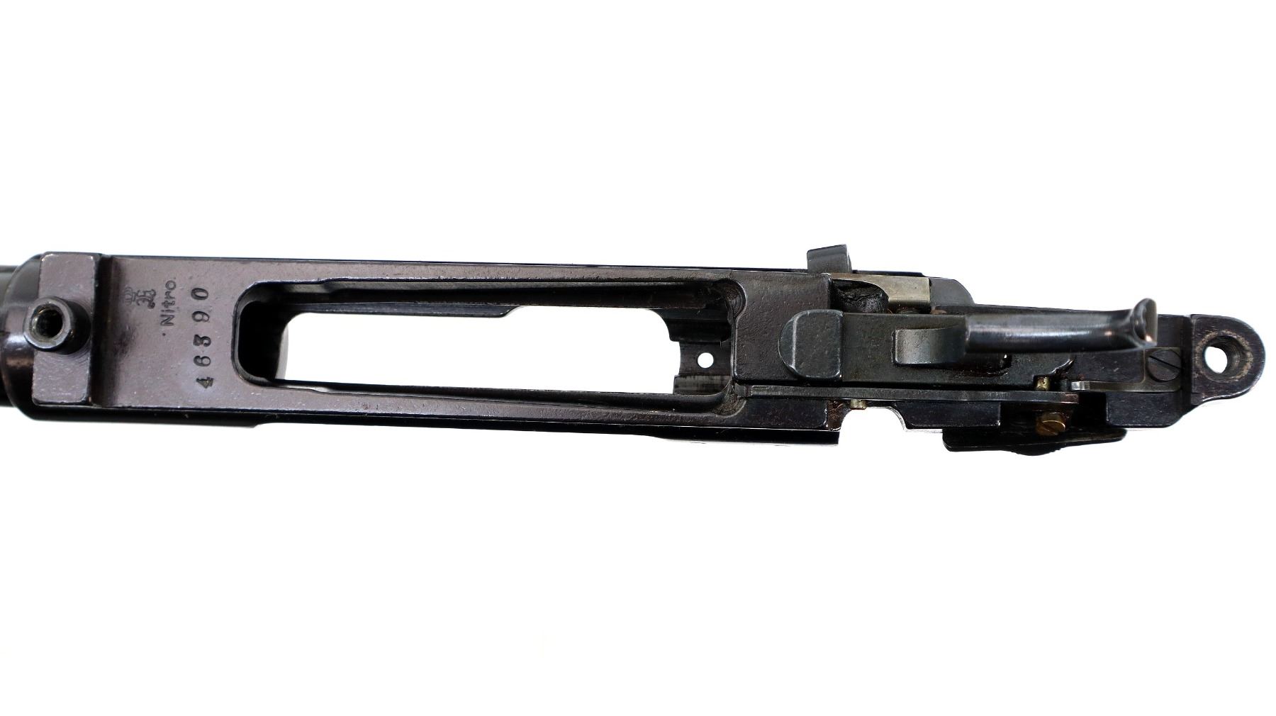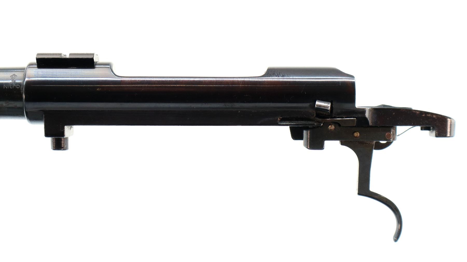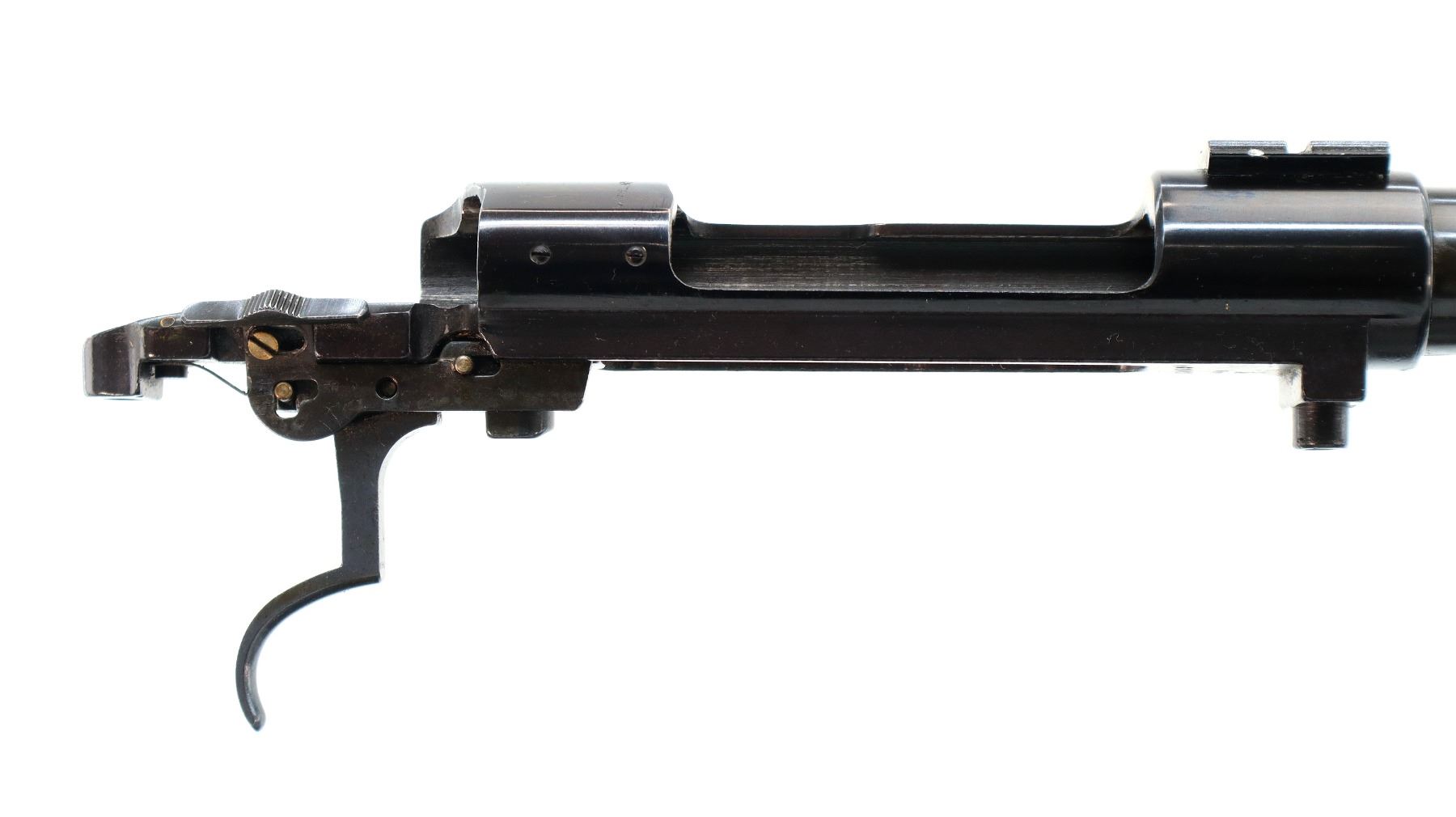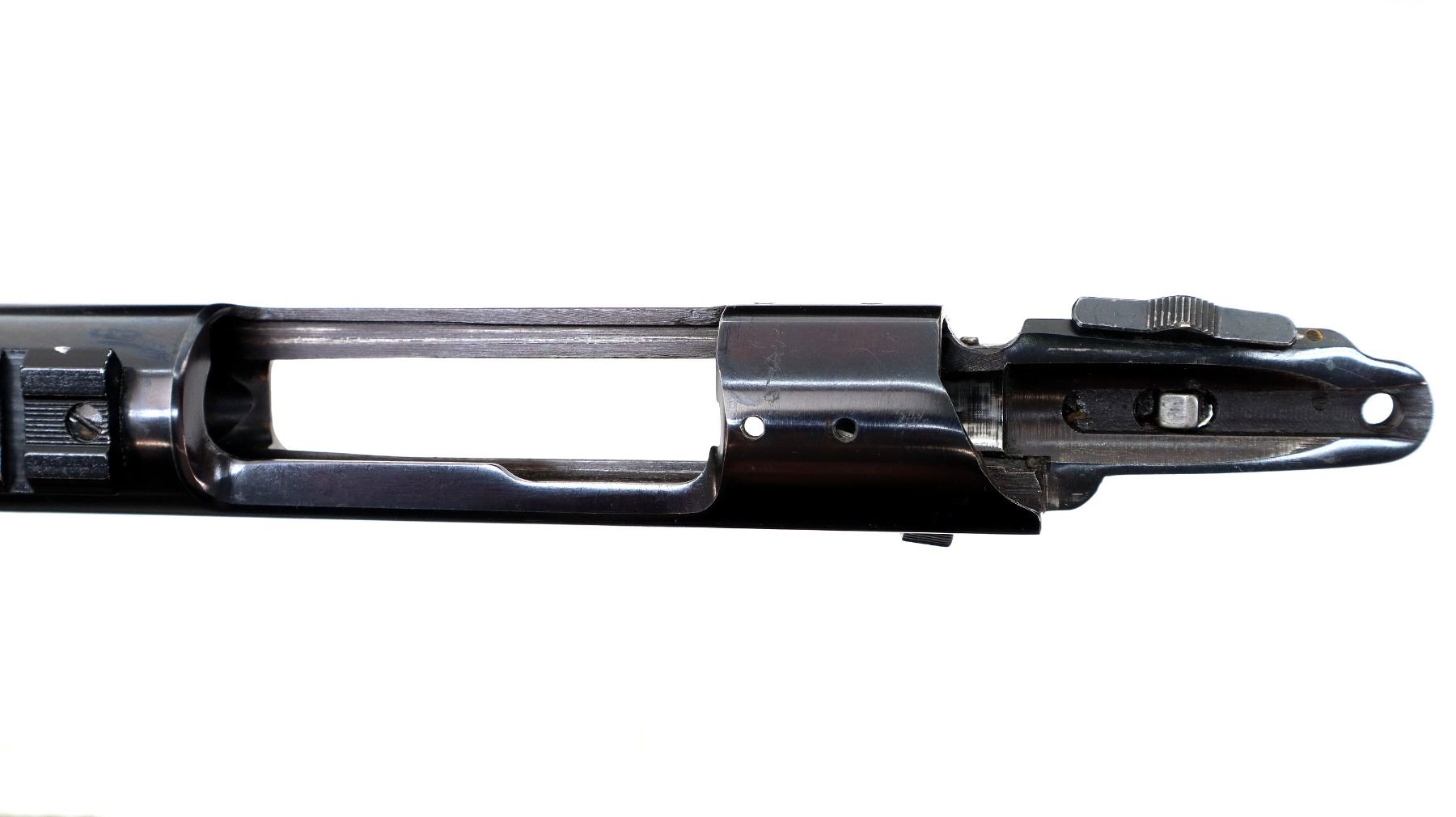 Main Description: Blade front sight with ramp, missing rear sight dovetail present, blued finish, receiver drilled and tapped with front base only installed, includes trigger, sear and safety with bolt stop assembly. Missing all other parts and stock.