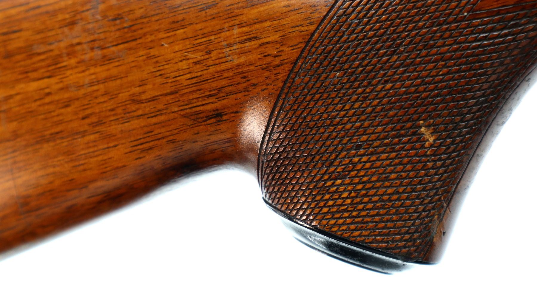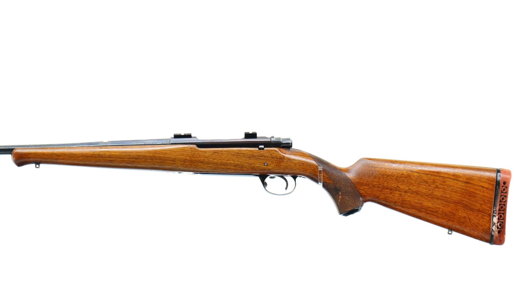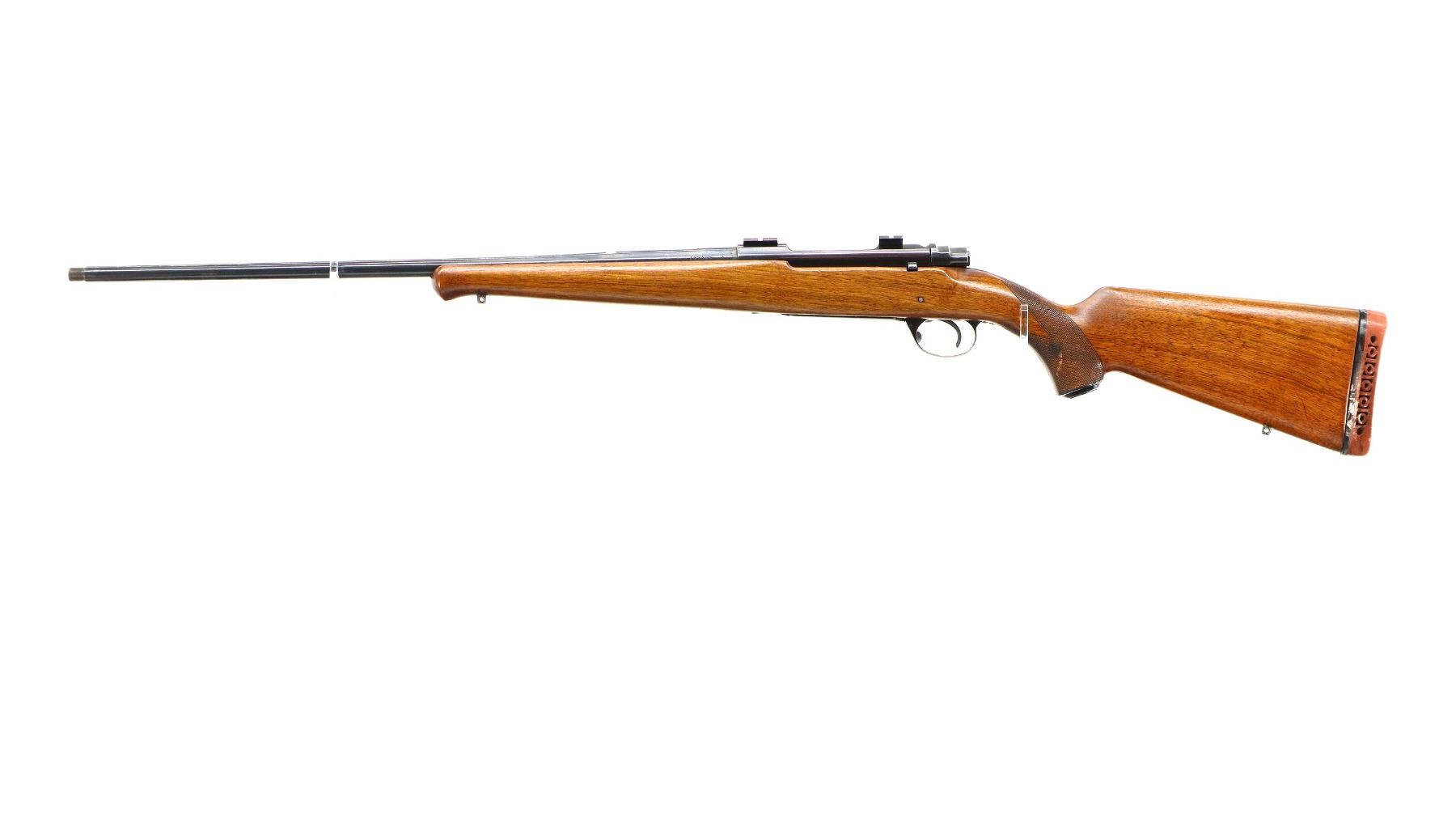 Main Description: Missing front and rear sights, has the rear dovetail and modified barrel, blued finish, threaded muzzle with no cap, receiver drilled and tapped with two piece scope bases installed. One piece wood stock, Schnabel forend tip, checkered pistol grip chipped and cracked behind receiver, red vented rubber recoil pad, grip cap, swivel studs.