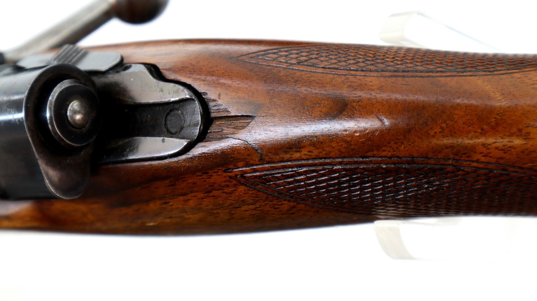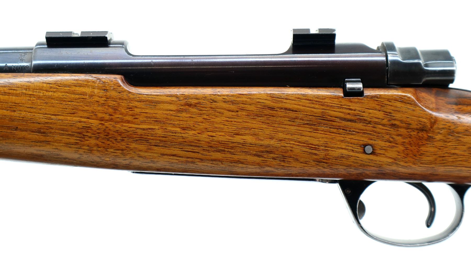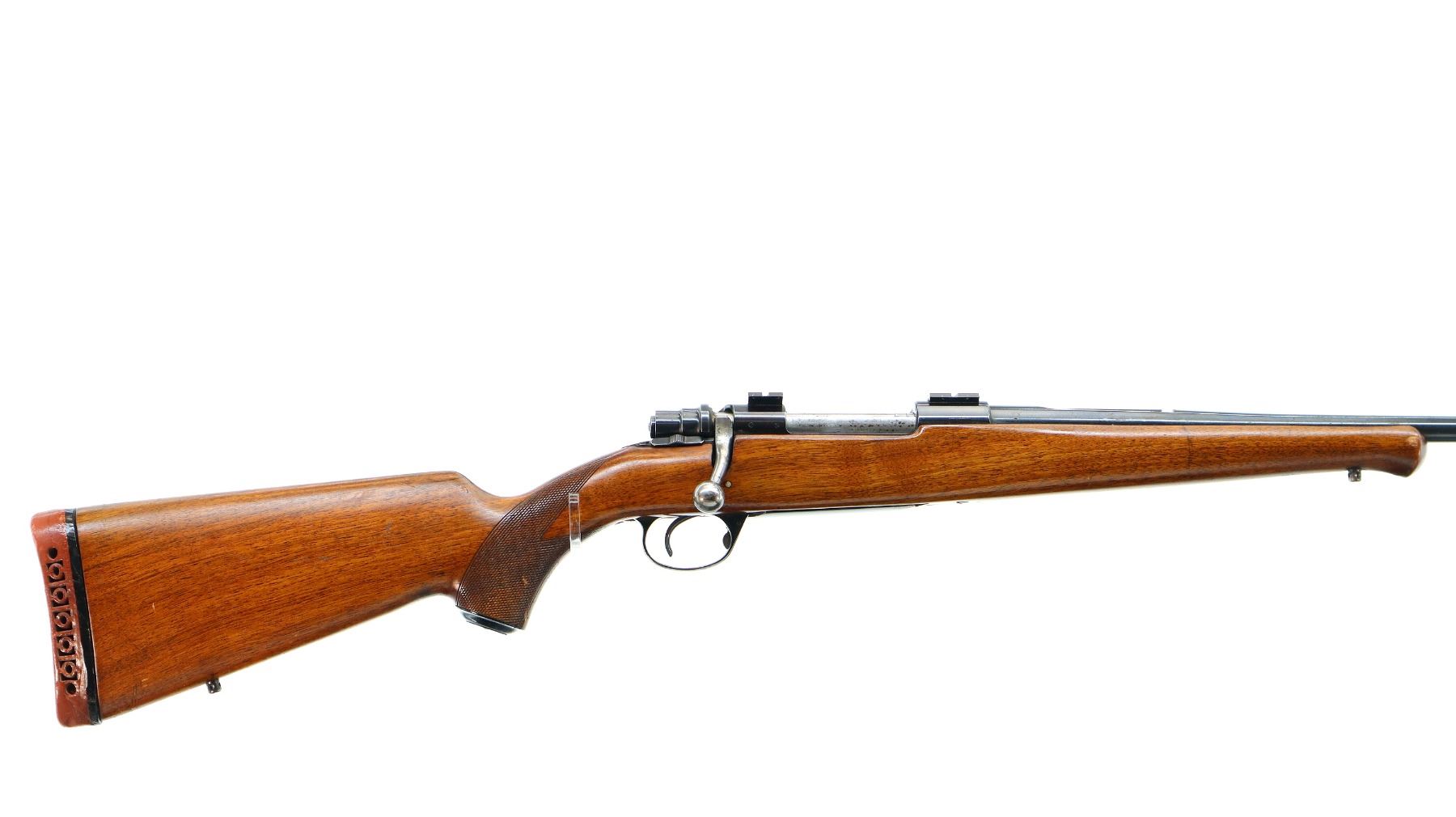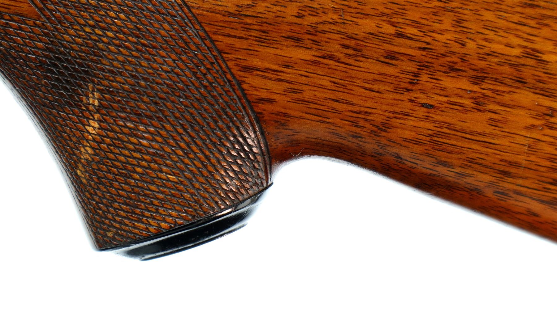 Main Description: Missing front and rear sights, has the rear dovetail and modified barrel, blued finish, threaded muzzle with no cap, receiver drilled and tapped with two piece scope bases installed. One piece wood stock, Schnabel forend tip, checkered pistol grip chipped and cracked behind receiver, red vented rubber recoil pad, grip cap, swivel studs.