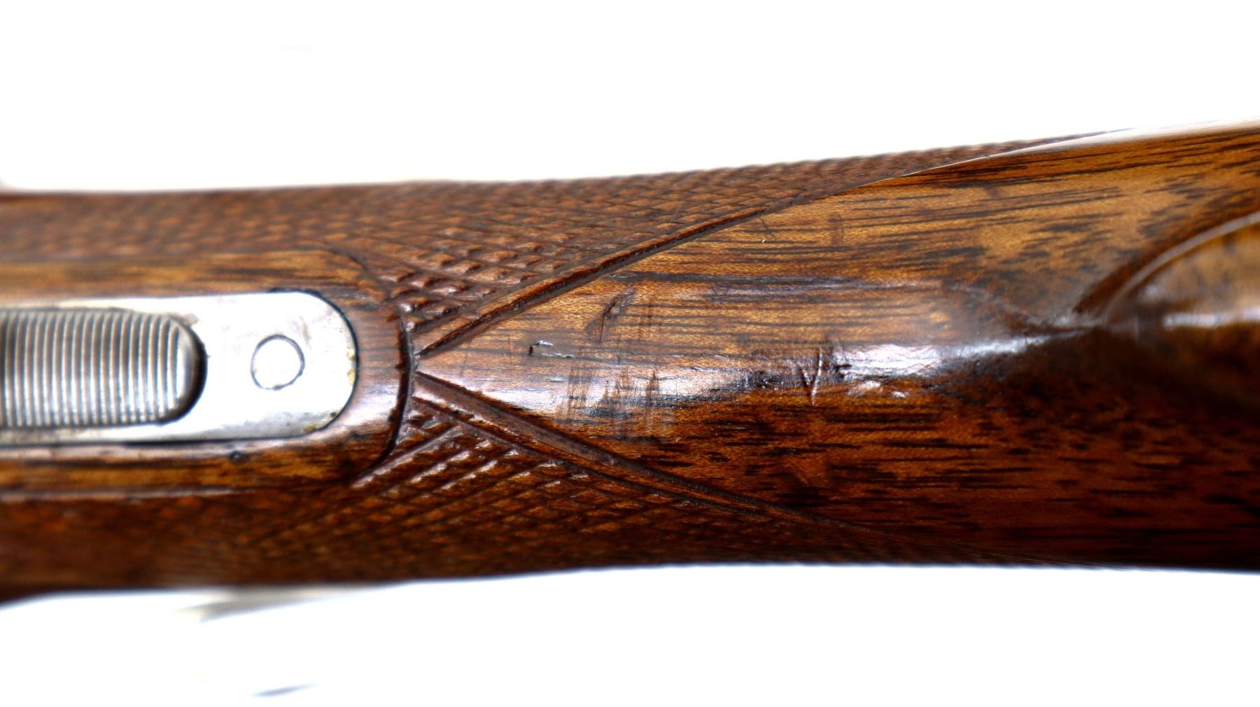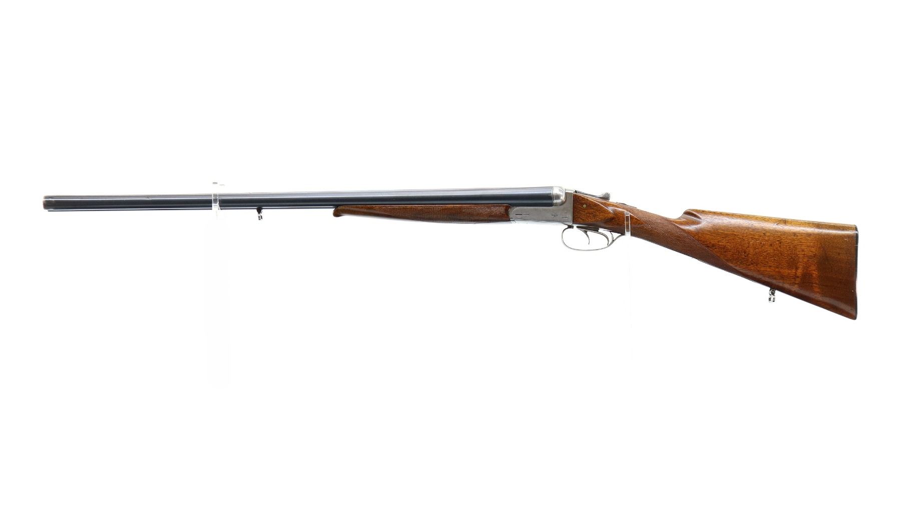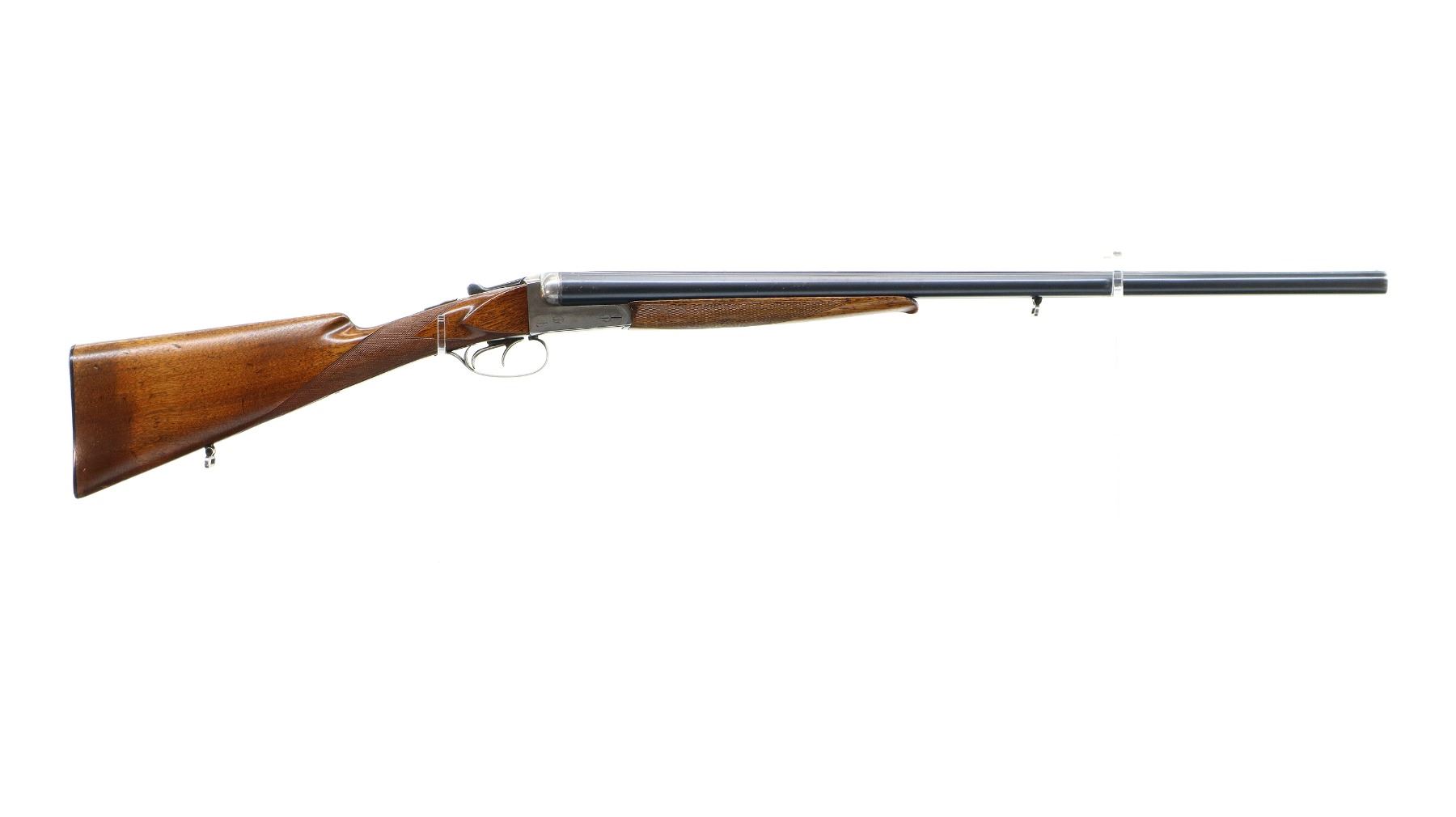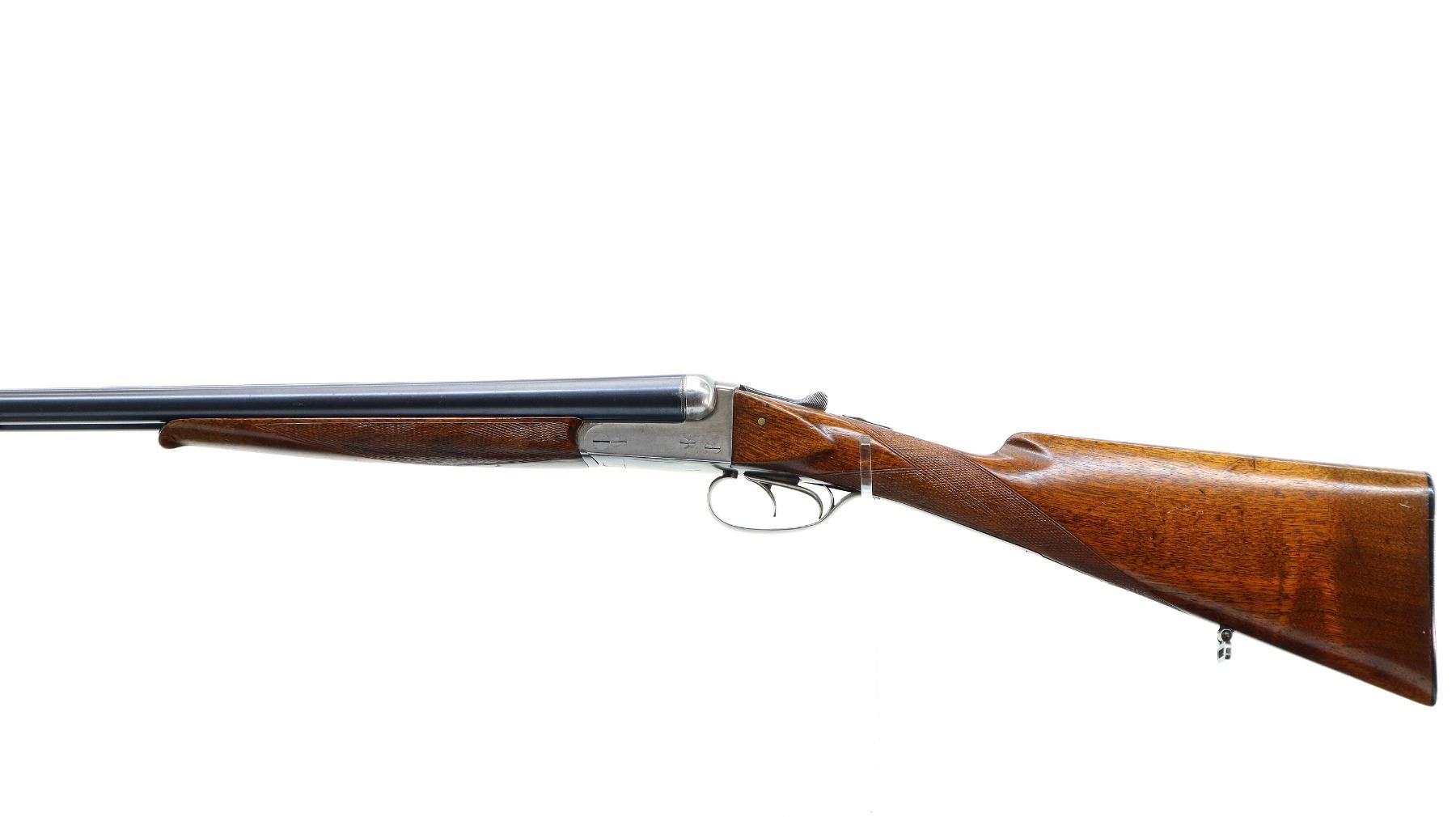 Main Description: Silver bead, blued barrels with raised rib, silver receiver, automatic safety, extractor, double triggers, front trigger is short. Two piece wood stocks, checkered forearm and straight grip cracked and repaired behind receiver, grooved black polymer butt plate, sling swivels.