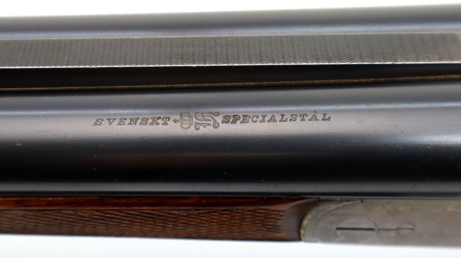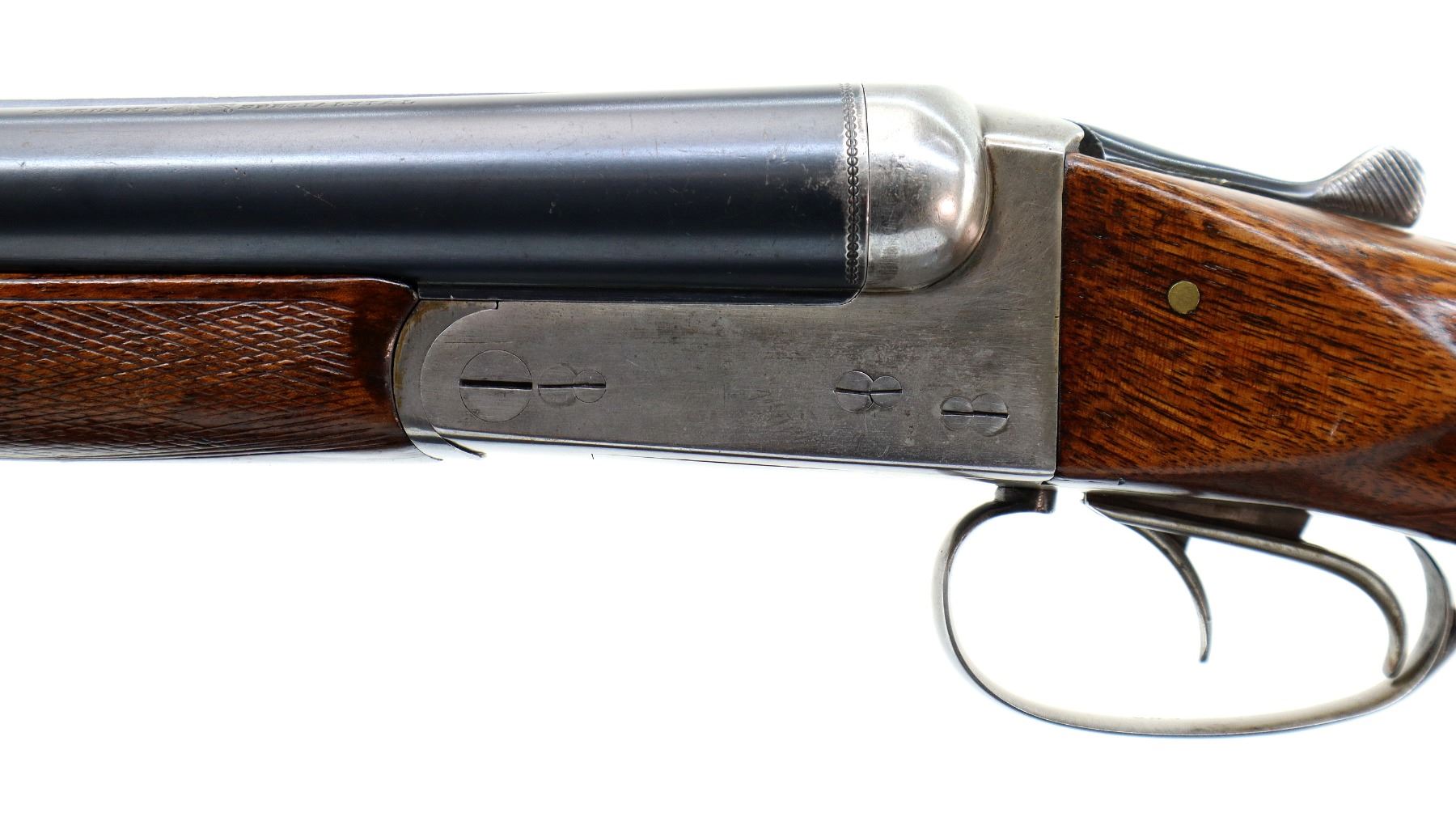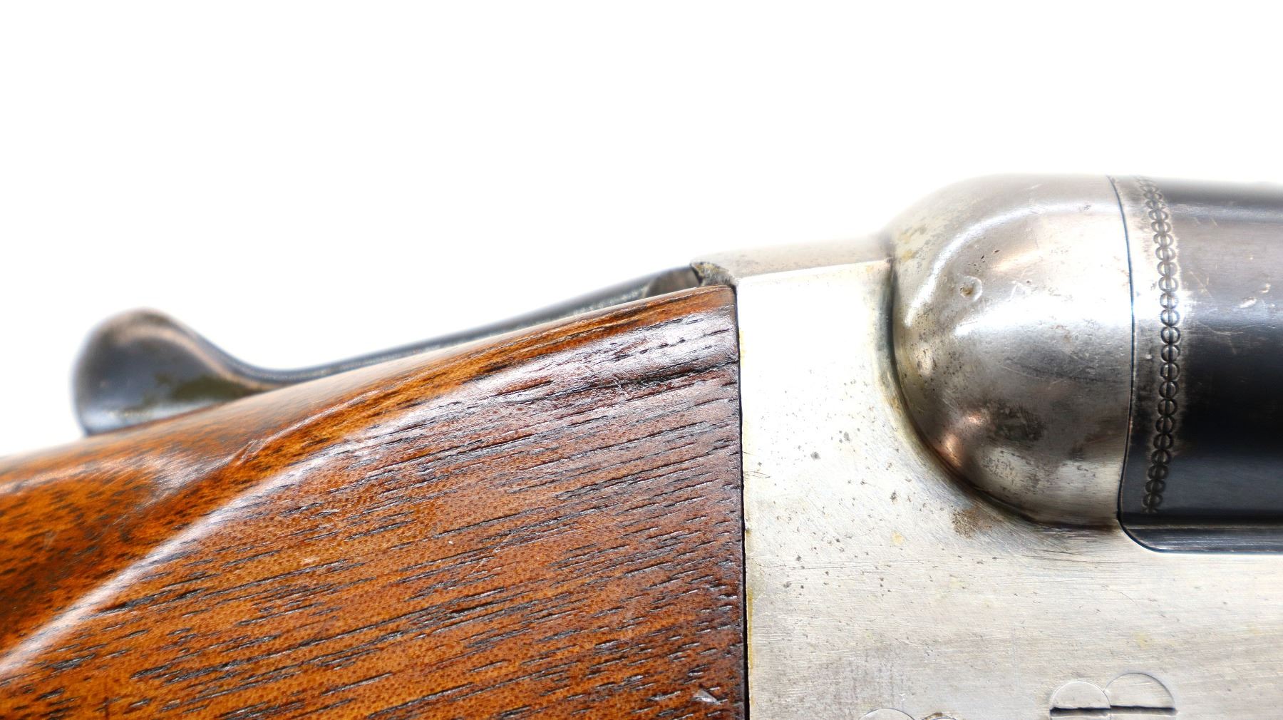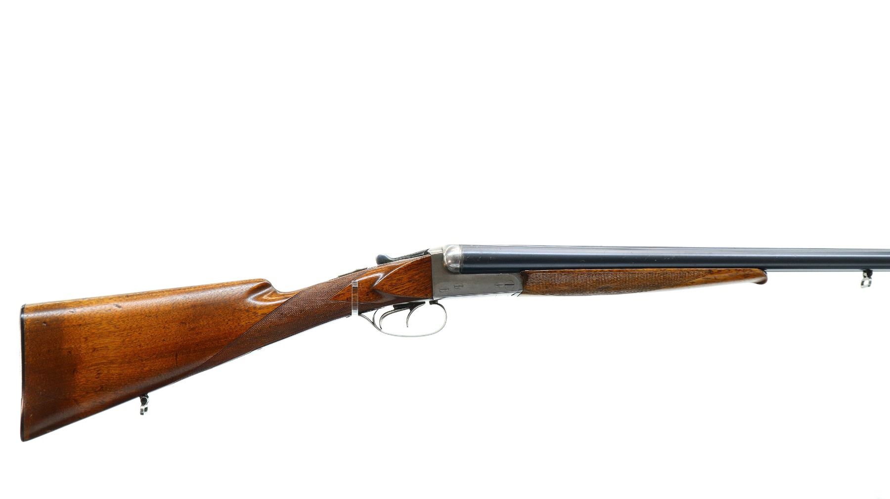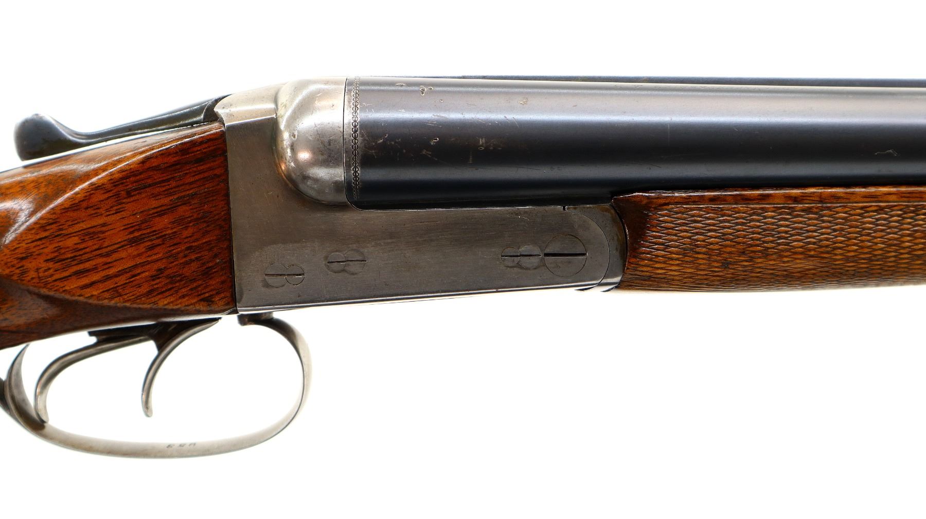 Main Description: Silver bead, blued barrels with raised rib, silver receiver, automatic safety, extractor, double triggers, front trigger is short. Two piece wood stocks, checkered forearm and straight grip cracked and repaired behind receiver, grooved black polymer butt plate, sling swivels.