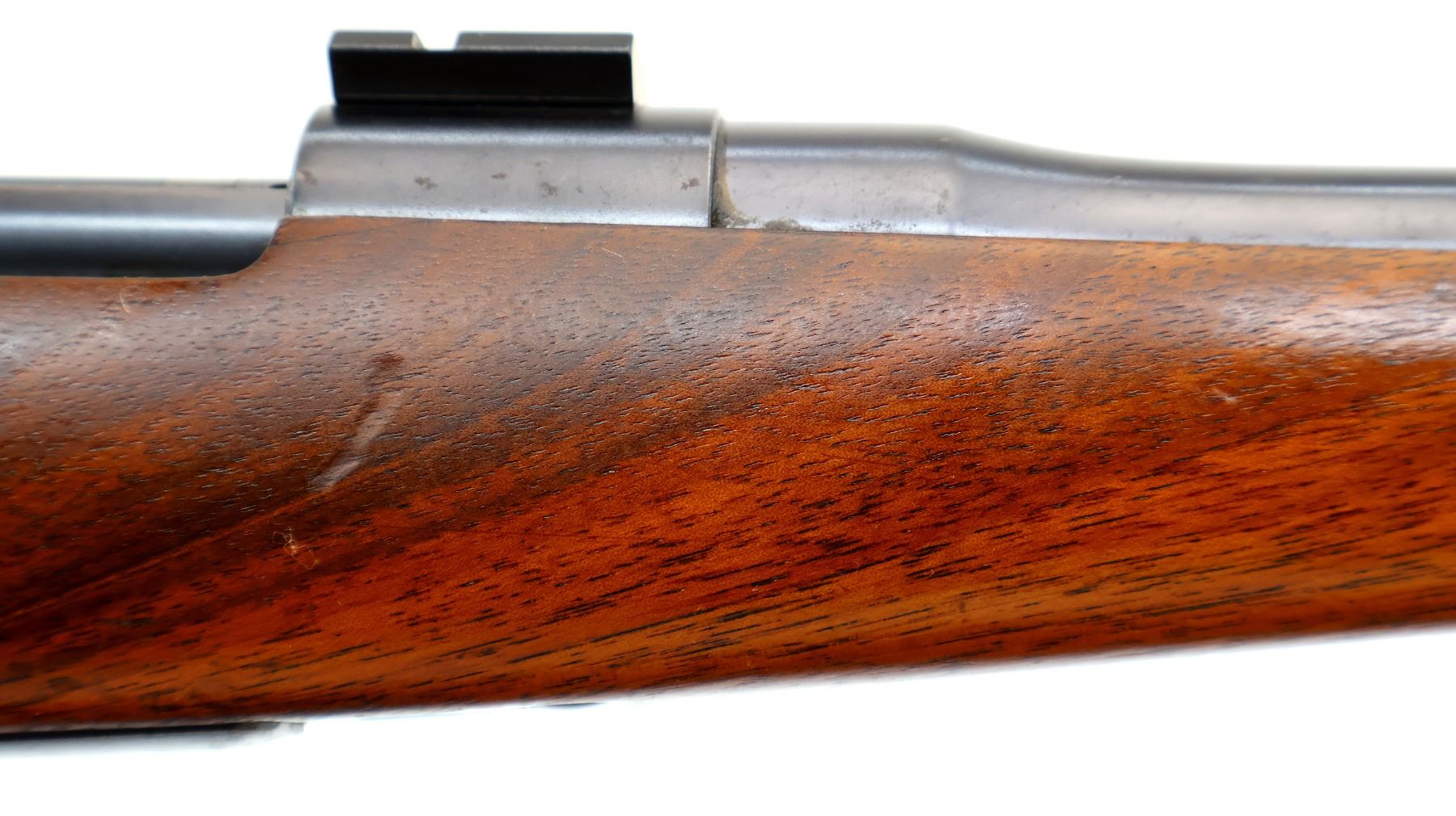 Main Description: Blade front sight with ramp, u notched rear sight, blued finish, receiver drilled and tapped with two piece steel scope bases installed, turned down bolt handle. One piece sporter wood stock, checkered pistol grip cracked behind receiver, grooved black polymer butt plate, sling swivels.
