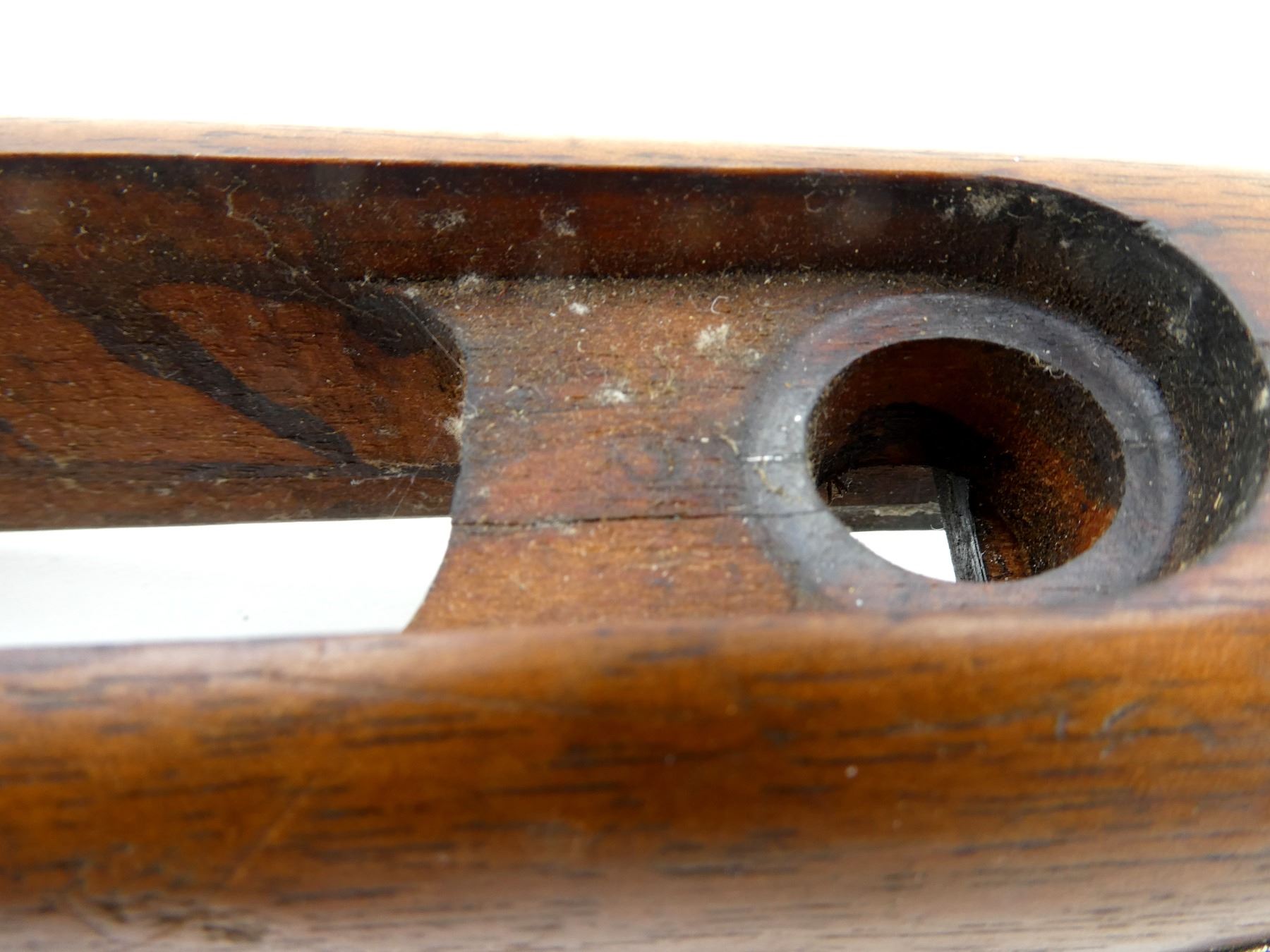 (1) WOODEN STOCK, CHECKERED, UNMARKED, WITH BRASS DISC, WITH SLING SWIVELS AND RH CHEEK REST, OVERALL LENGTH APPROX. 32.25". MAY REQUIRE FITTING. SEE PHOTOS.