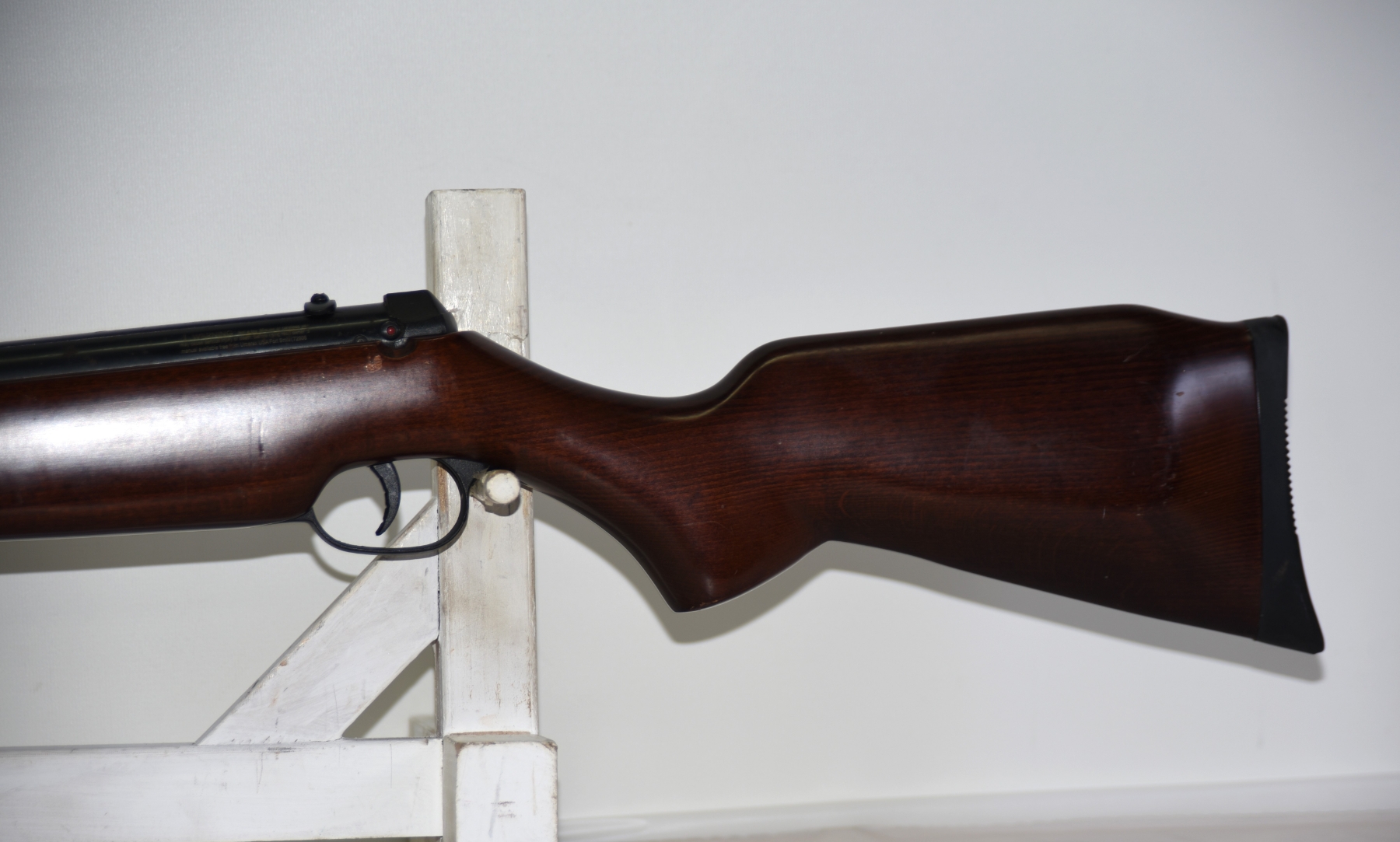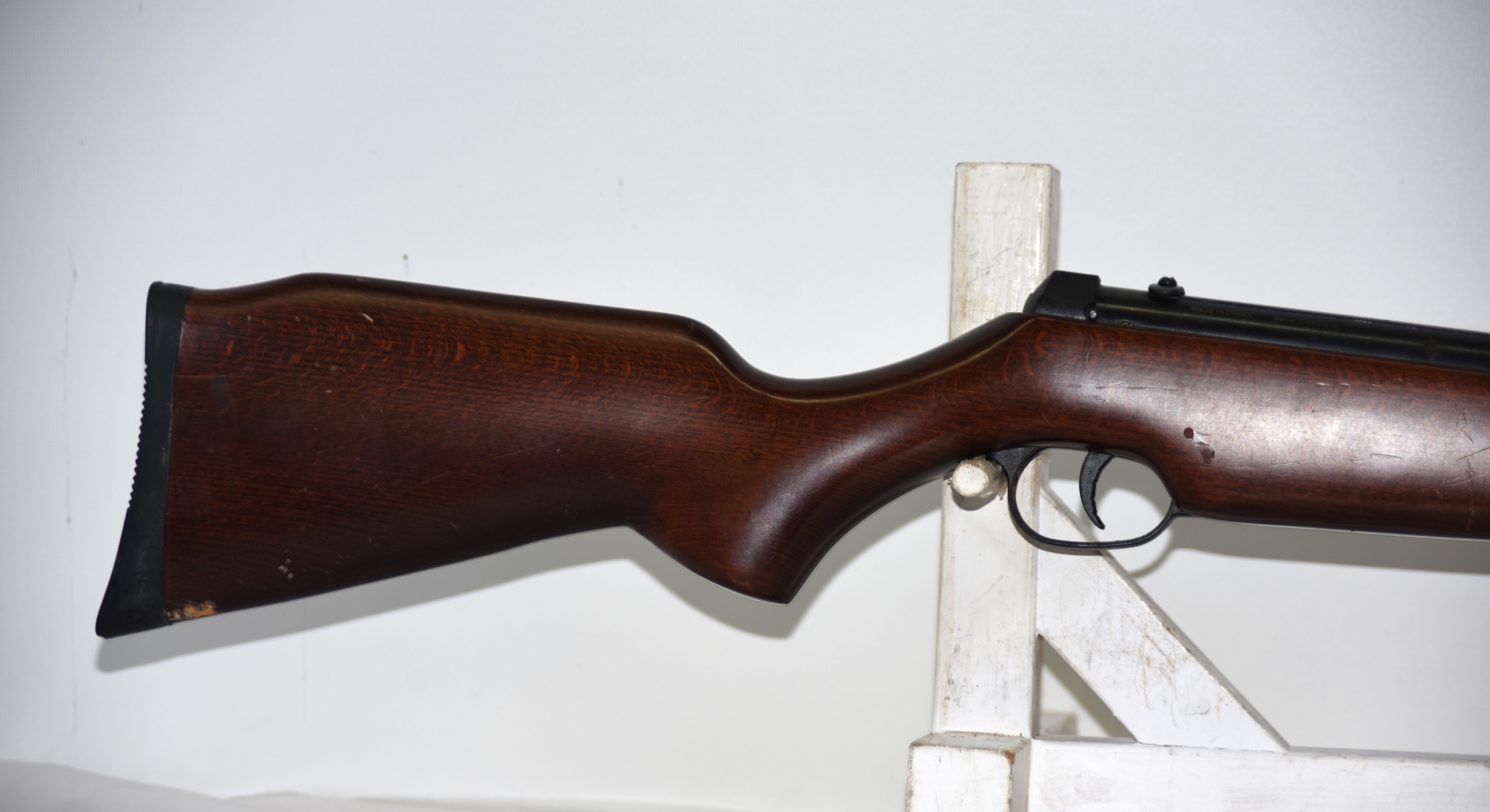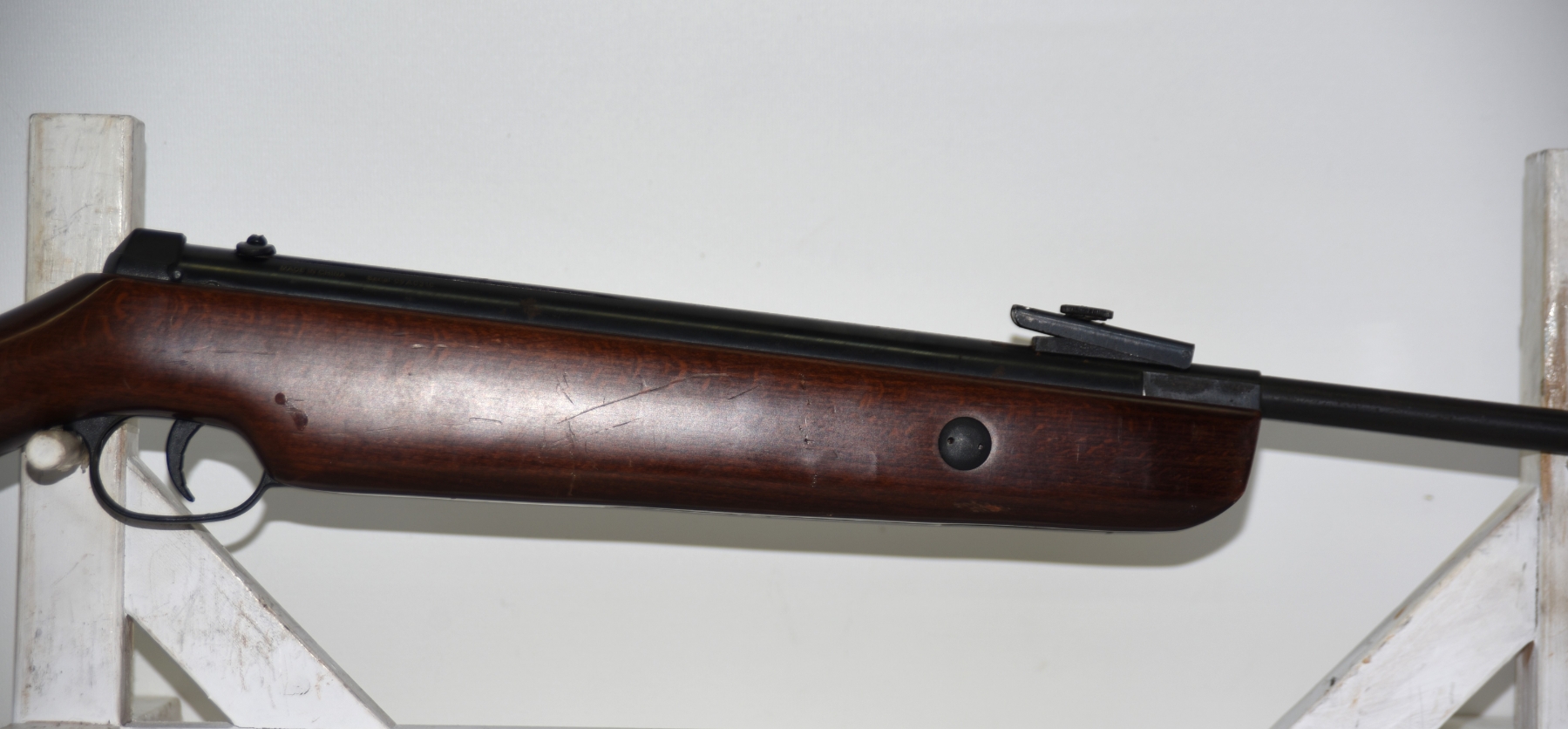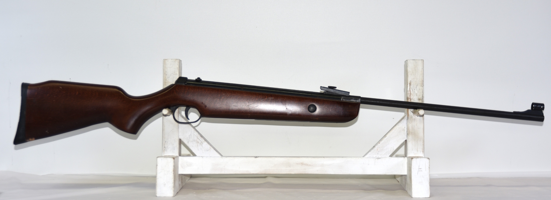 Wood stock shows scratches, scuffs, dents, few chips; condition is good.