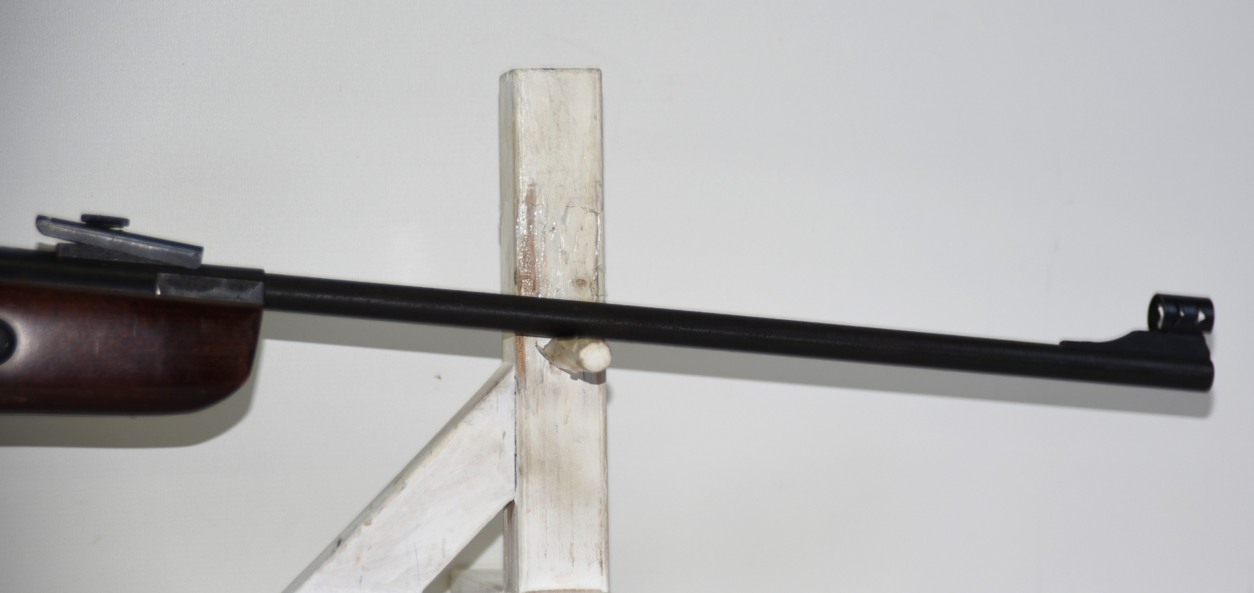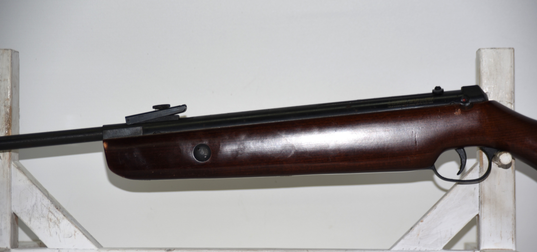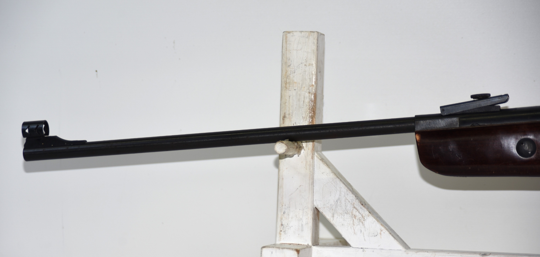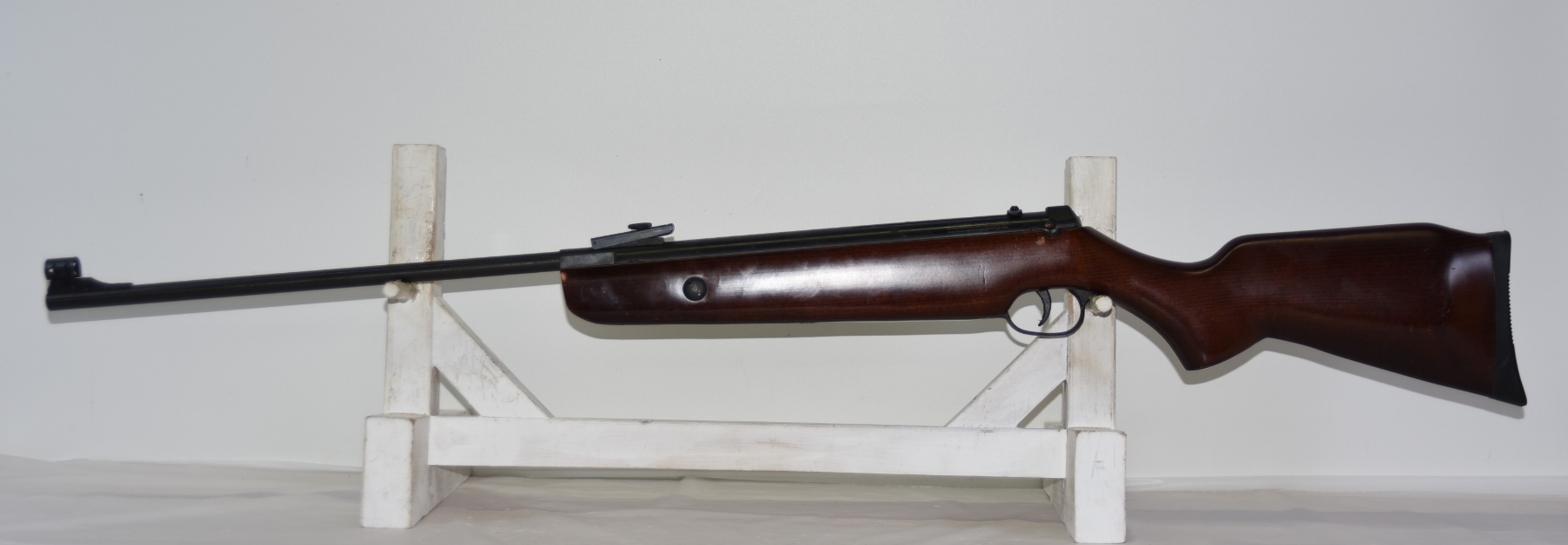 Wood stock shows scratches, scuffs, dents, few chips; condition is good.