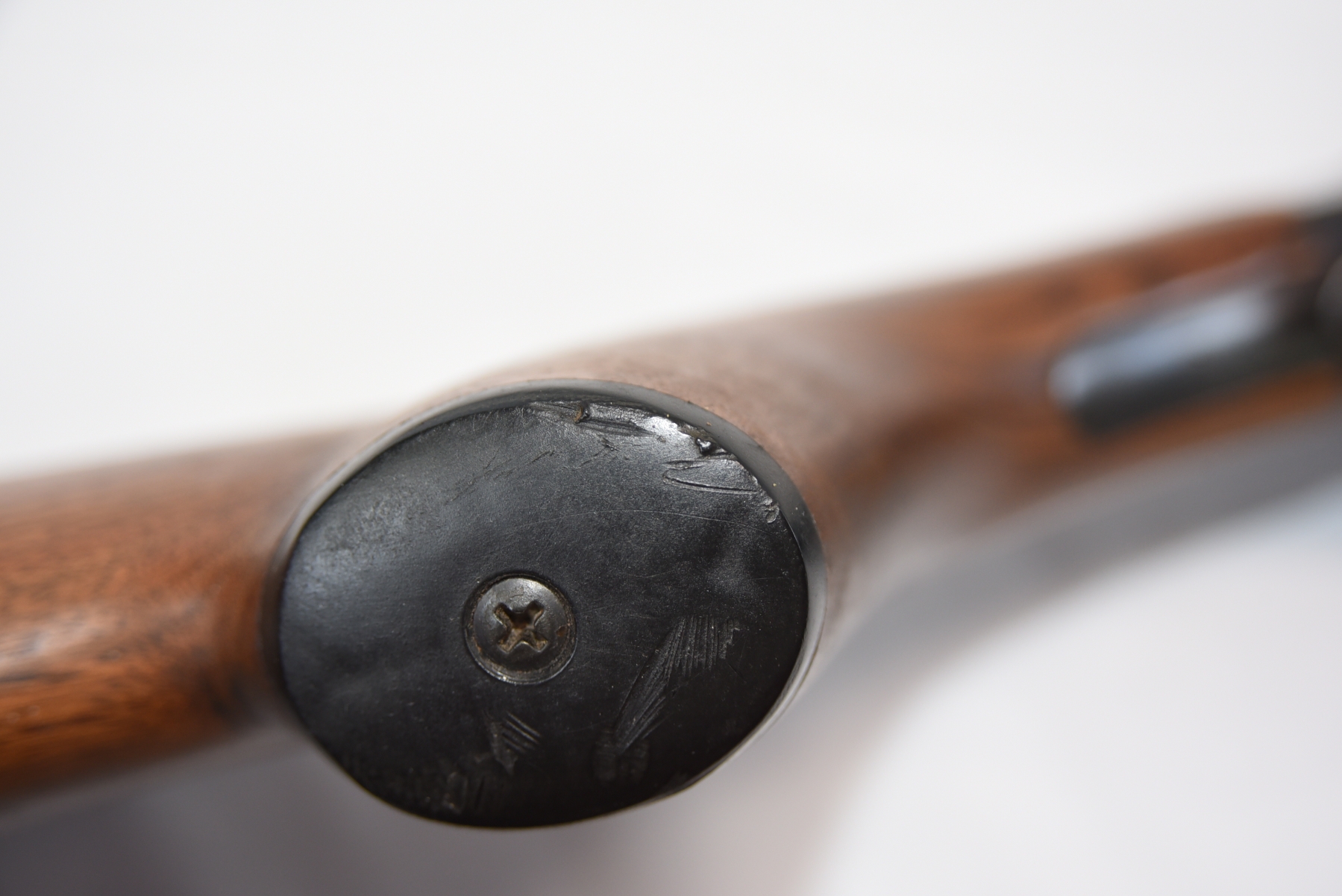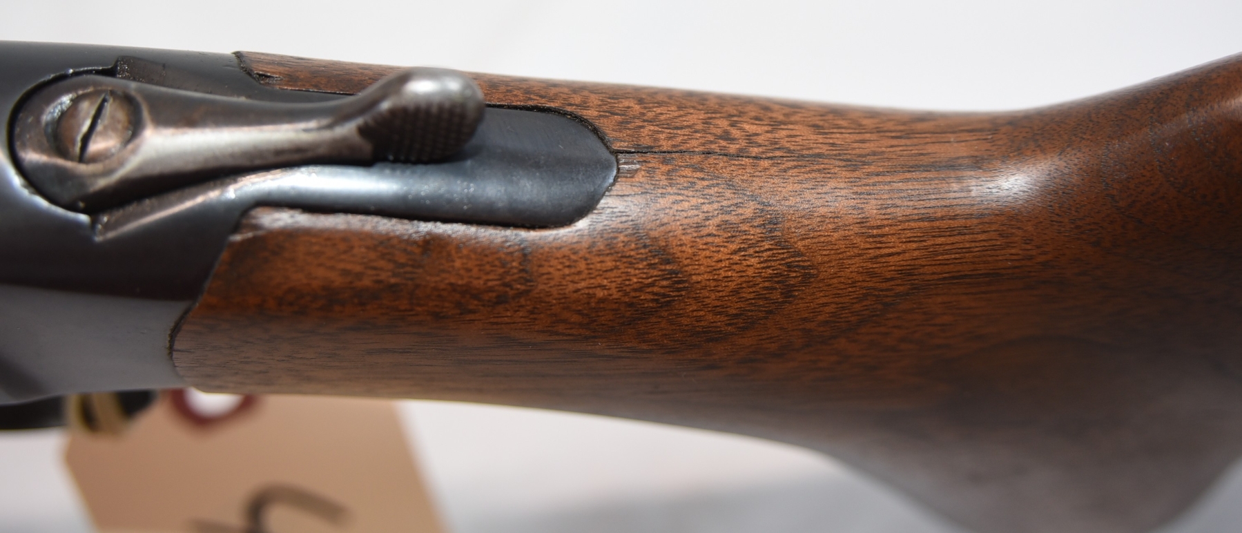 Wood stock shows some light scratches, crack in the upper portion of the grip, scuffs, light dings; condition is good.
