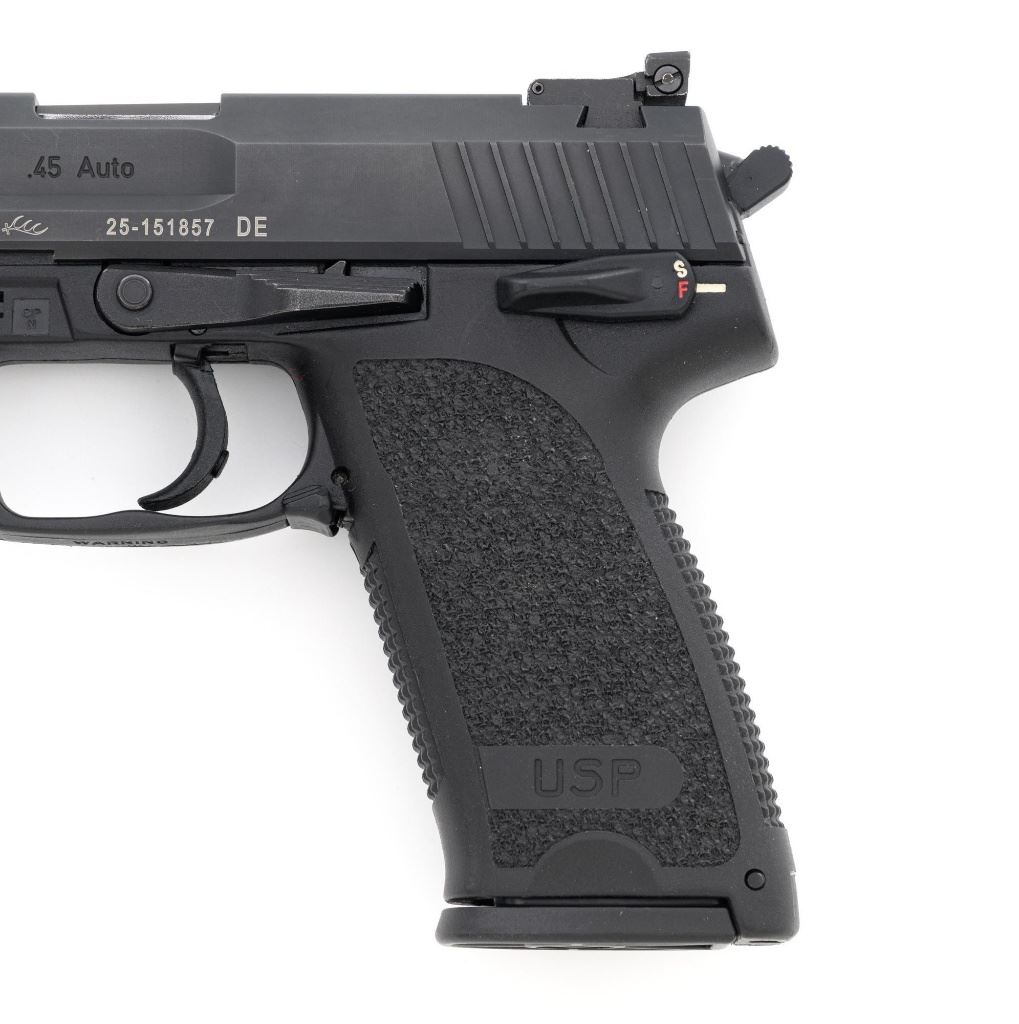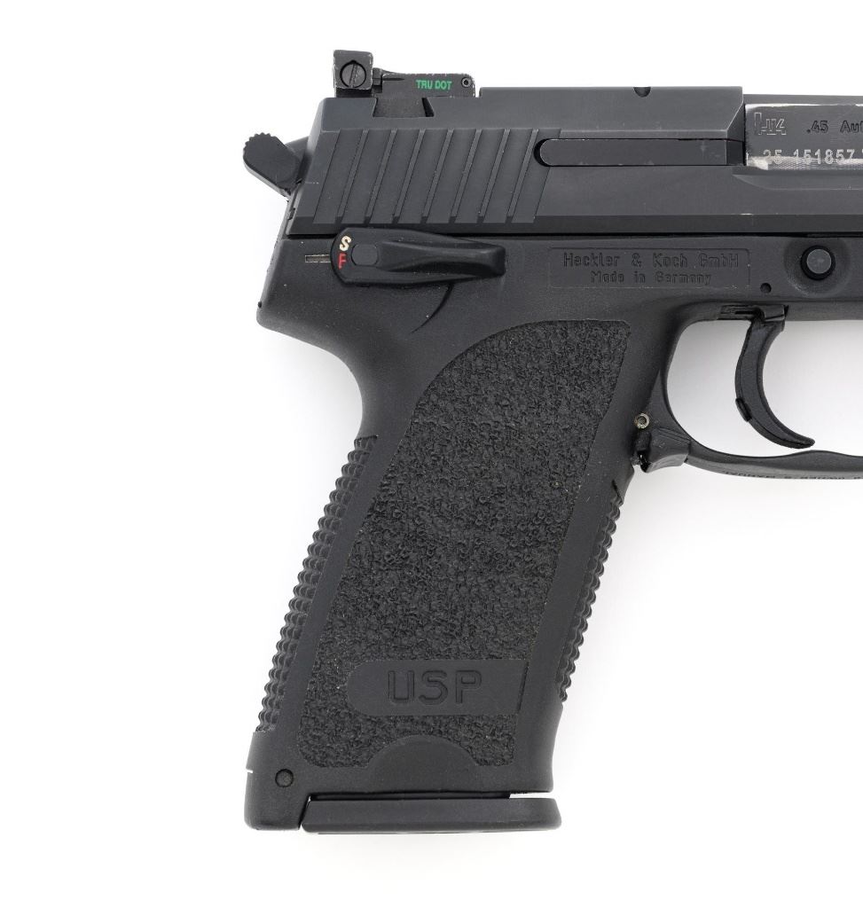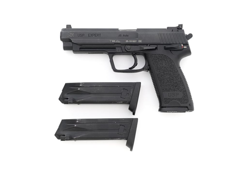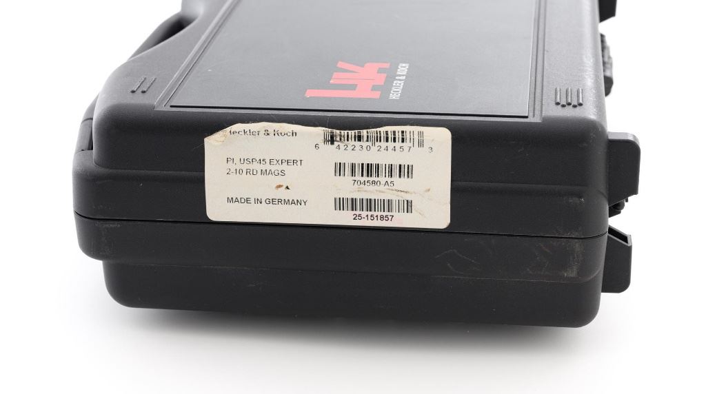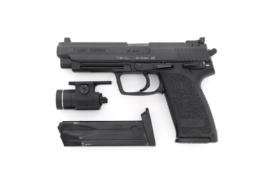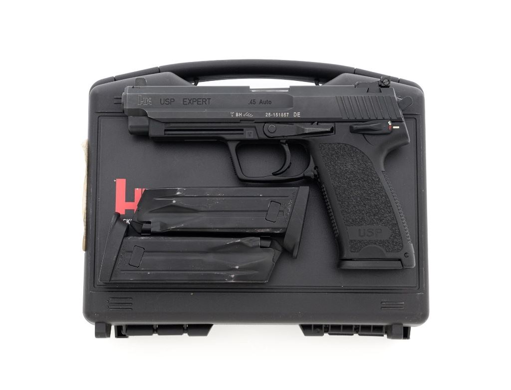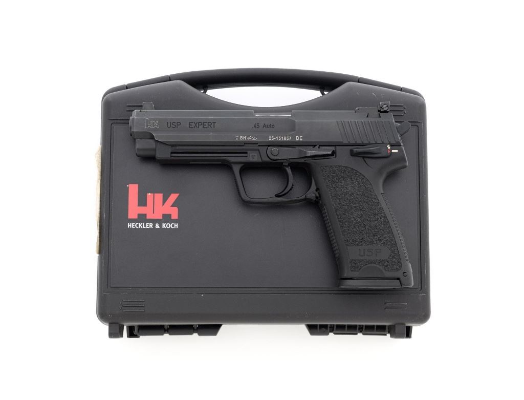 Heckler & Koch USP Expert Semi-Automatic Target Pistol, #25-151857, .45 ACP cal., 5.2" barrel, black finish, black polymer frame with integral textured grip panels, Tritium blade front sight, adjustable Tritium rear sight, ambidextrous safety/decocker and magazine release, with three (3) 10-round H&K magazines. Marked "MADE IN GERMANY" on right side of the frame. Includes factory H&K hard case with matching end label, foam interior, original front and rear sights, instruction manual, Streamlight Model TLR-3 flashlight attachment with mounting hardware, keys, wrenches, and associated packaging materials. Light was tested and functions properly. Pistol is in excellent overall condition, retaining approx. 97%-98% factory finish, with some high point edgewear, and handling marks. Grips show little use. Action functions smoothly. Bore is bright with excellent rifling. Est.: $1,000-$1,200. (Modern/PPT)