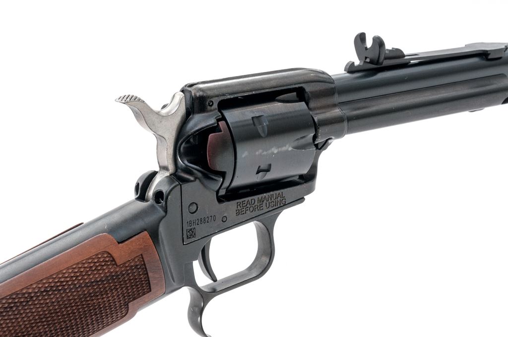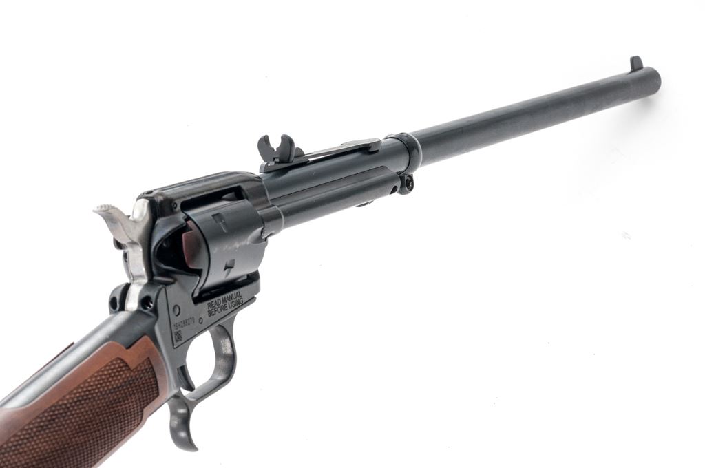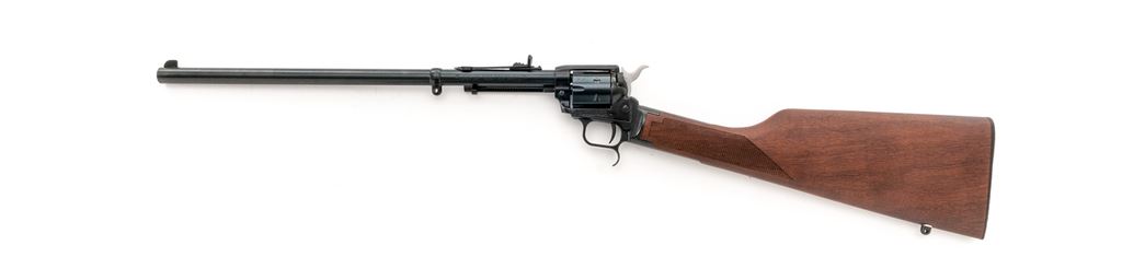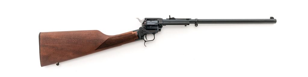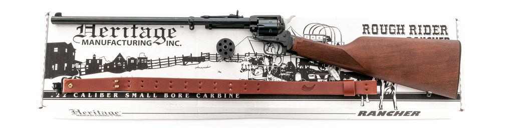 Heritage Rough Rider Rancher Single Action Revolving Carbine, #1BH288270, .22 LR/.22 mag. cal., 6-shot, 16-1/8" barrel with blue finish, black alloy receiver, straight grip checkered walnut stock with checkered black plastic Heritage buttplate, and sling swivel studs. Sights include a blade front and buckhorn rear with elevator. In original box with matching numbered end label, .22 mag. and .22 LR cylinders, and brown leather Hunter sling with quick-detachable sling swivels. Condition is excellent retaining approx. 98%+ factory metal finish. Factory lettering is crisp. Stock is like new with sharp checkering. Action cycles smoothly, cylinder locks up tight, bore is bright with sharp rifling. Overall, appears to have been handled and fired very little. Est.: $250-$350. (Modern)