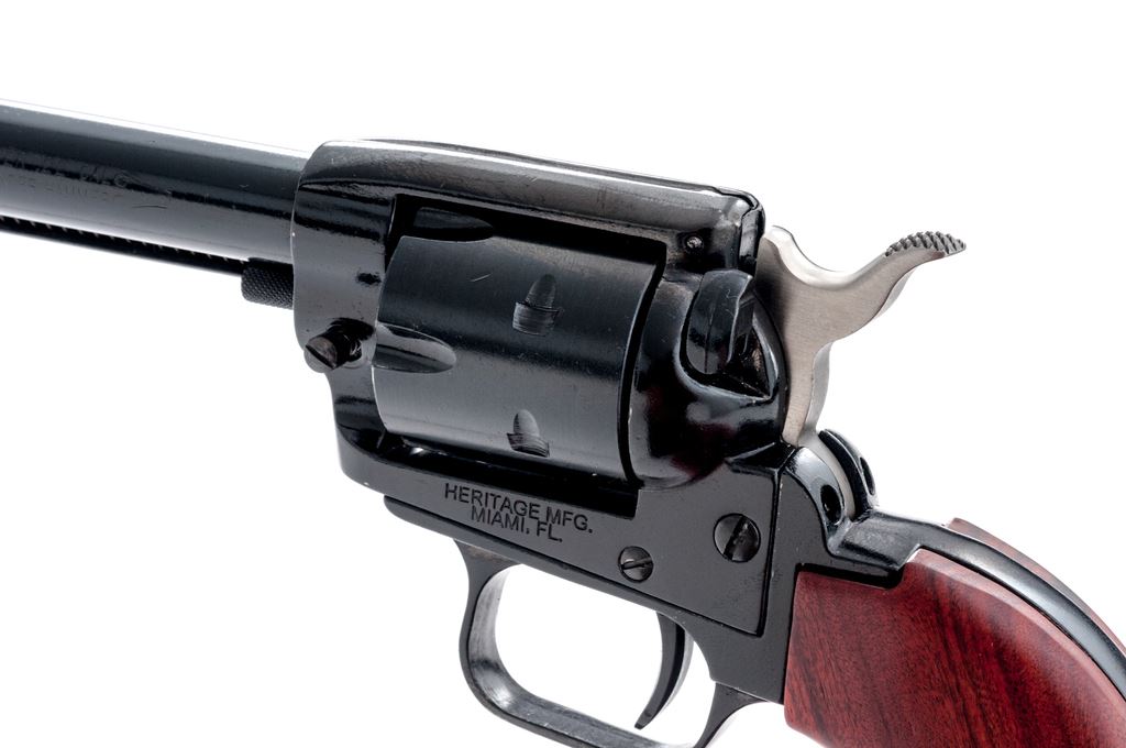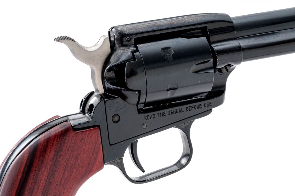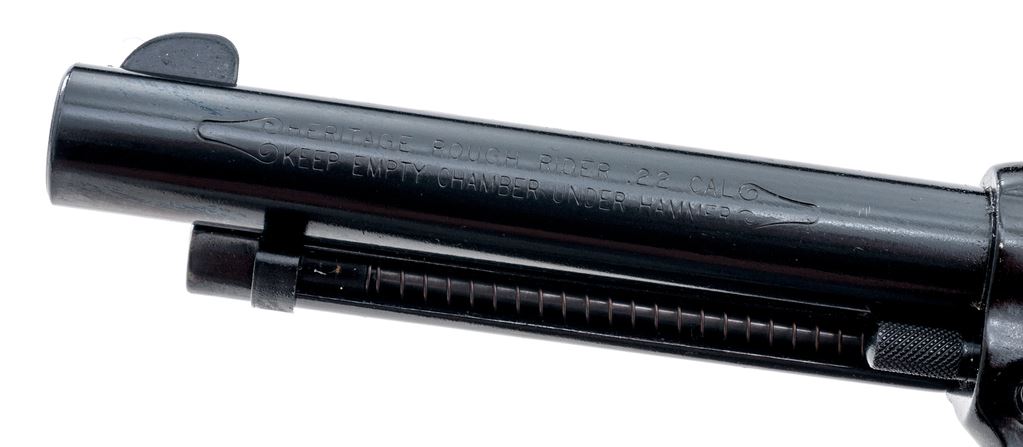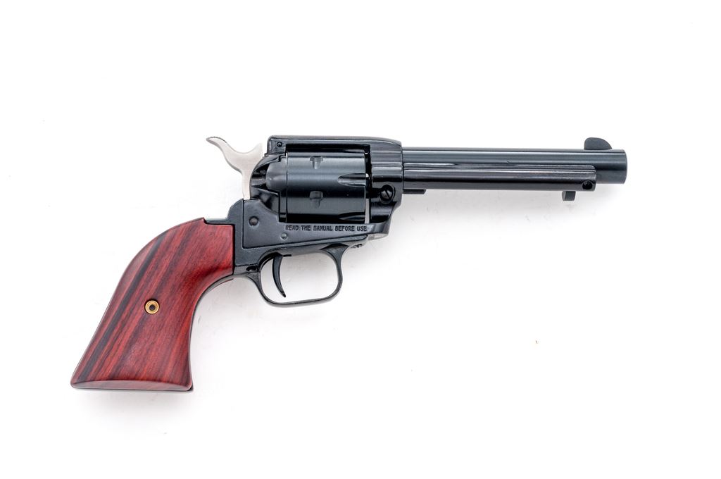 Heritage Rough Rider Single Action Revolver, with .22 LR and .22 magnum cylinders, #T100883, 4.75'' barrel, blue/black finish, smooth cocobolo wood grips, with standard sights. In original box with matching end label, owner's manual, and trigger lock. Condition is excellent, appearing very lightly used, retaining approx. 99% original factory finish, showing just light handling marks, the most noticeable being a scratch to the front strap. Grips are as new. Crisp action, mirror bright bore with excellent rifling. Est.: $100-$200. (Modern/PPT)