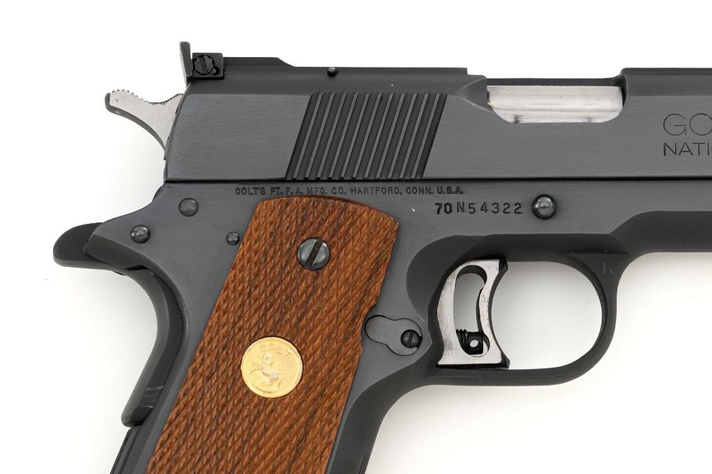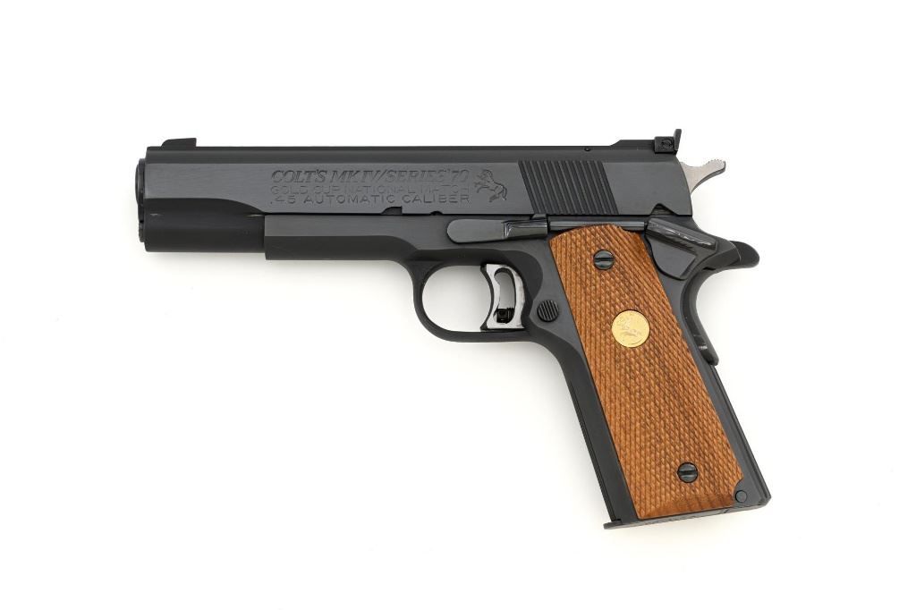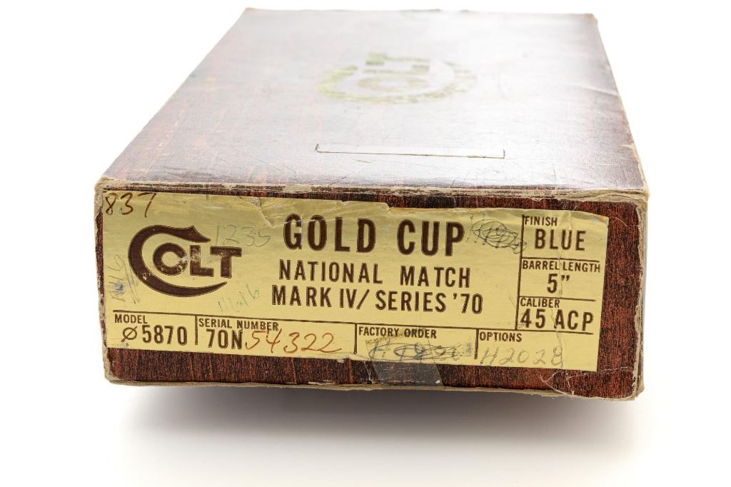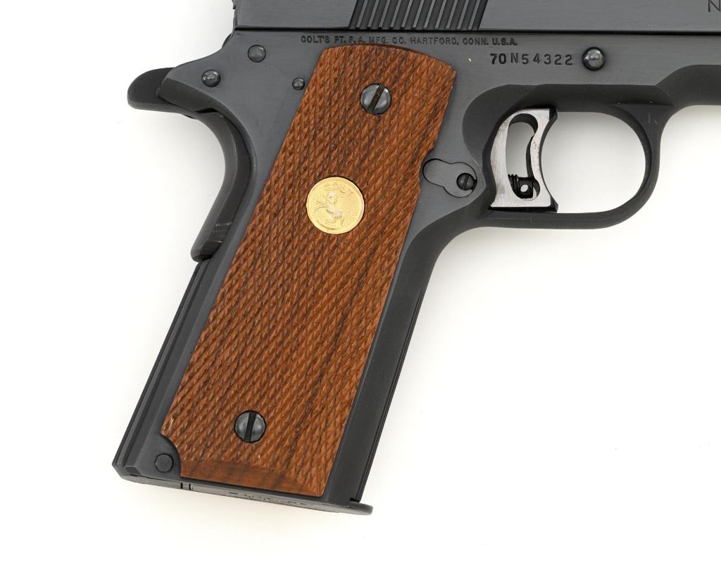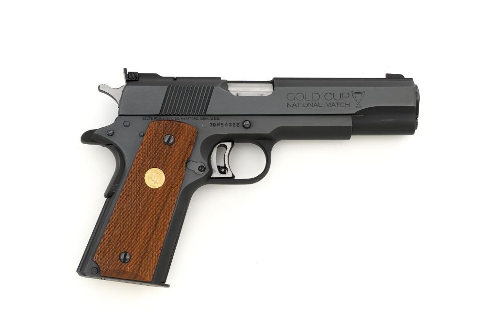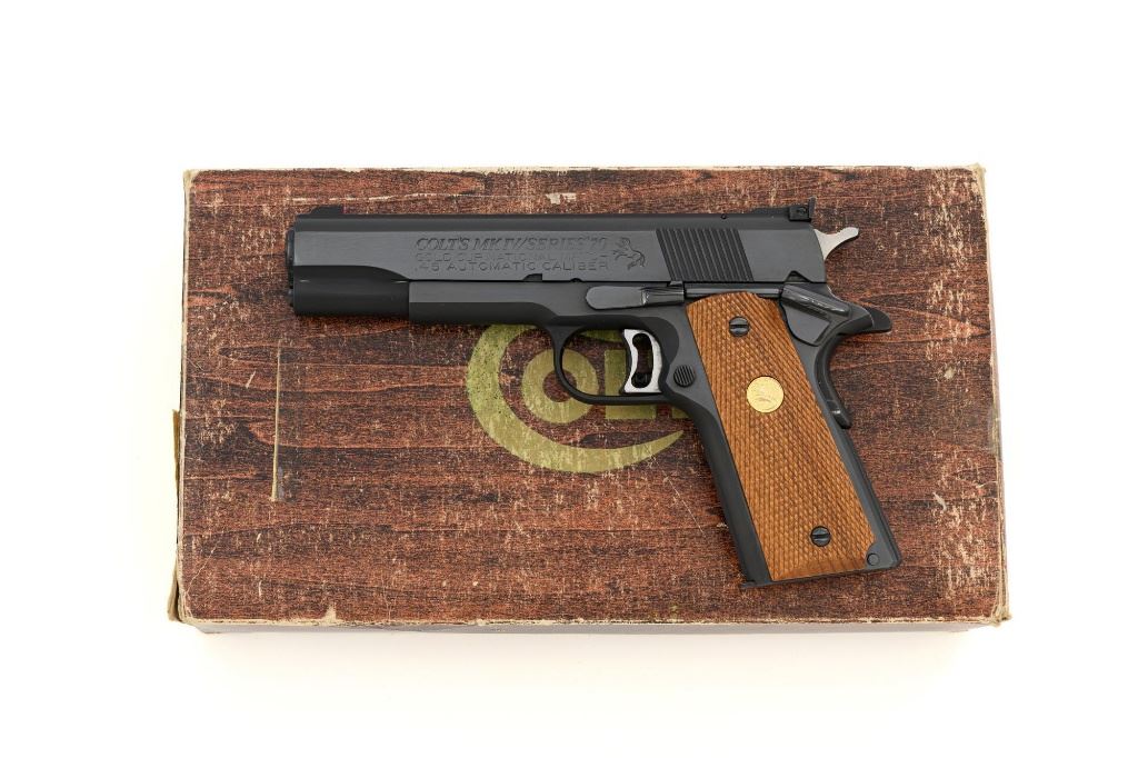 High Condition Colt MK IV Series 70 Gold Cup National Match Semi-Automatic Pistol, #70N54322, .45 ACP cal., 5" National Match barrel, blue finish, checkered walnut two-piece grips with Colt medallions, blade front sight (red nail polish added), Elliason fully adjustable square-notch rear sight, flat mainspring housing, adjustable target trigger, with one 7-round blue steel magazine marked "COLT / .45 AUTO.". Includes Colt factory one-piece wood grain pattern cardboard box with matching end label, instruction manual, safety pamphlet, bushing, Allen wrenches, and associated packaging materials. Mfgd 1978. Pistol is in excellent overall condition, retaining approx. 99% factory blue, with only minor marks, and shows little evidence of use. Grips are in excellent condition with fine checkering detail and bright medallions. Action is crisp and operates smoothly. Bore is mirror bright with excellent rifling. Est.: $1,500-$2,500. (Modern/PPT)