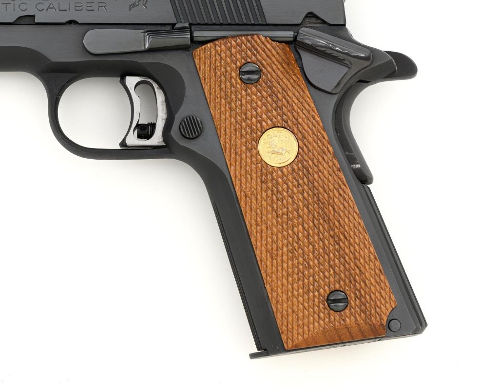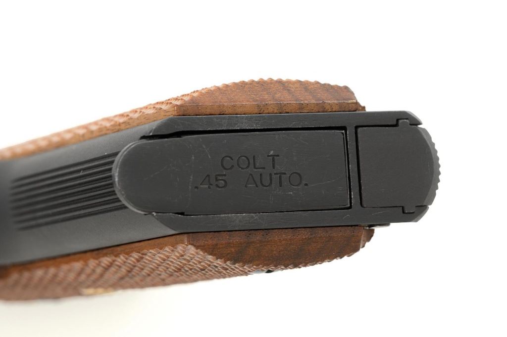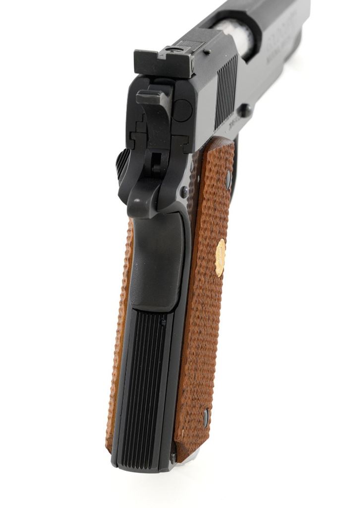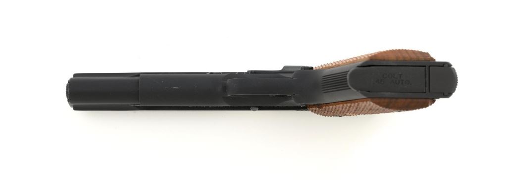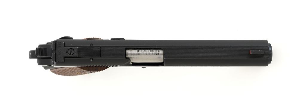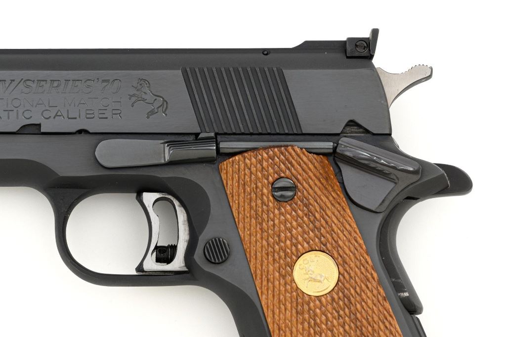 High Condition Colt MK IV Series 70 Gold Cup National Match Semi-Automatic Pistol, #70N54322, .45 ACP cal., 5" National Match barrel, blue finish, checkered walnut two-piece grips with Colt medallions, blade front sight (red nail polish added), Elliason fully adjustable square-notch rear sight, flat mainspring housing, adjustable target trigger, with one 7-round blue steel magazine marked "COLT / .45 AUTO.". Includes Colt factory one-piece wood grain pattern cardboard box with matching end label, instruction manual, safety pamphlet, bushing, Allen wrenches, and associated packaging materials. Mfgd 1978. Pistol is in excellent overall condition, retaining approx. 99% factory blue, with only minor marks, and shows little evidence of use. Grips are in excellent condition with fine checkering detail and bright medallions. Action is crisp and operates smoothly. Bore is mirror bright with excellent rifling. Est.: $1,500-$2,500. (Modern/PPT)