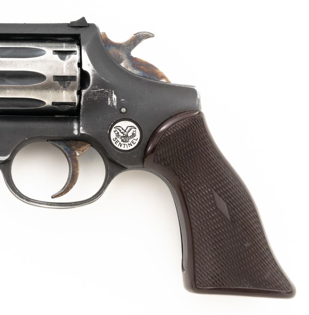 High Standard Sentinel R-101 9-Shot Double Action Revolver, #801363, .22 S-L- LR cal., 6" barrel, blue finish, aluminum alloy frame, checkered Bakelite High Standard grips, ramped blade front sight, and fixed square-notch rear sight. Mfgd 1967. Revolver is in very good overall condition, retaining approx. 80%-85% thinning factory finish, showing general thinning and wear. Grips show a little smoothing to the checkering detail. Action functions intermittently and needs repair/adjustment. Bore is very good, showing some minor frosting and erosion, with clearly defined rifling. Est.: $200-$300. (C&R/PPT)
