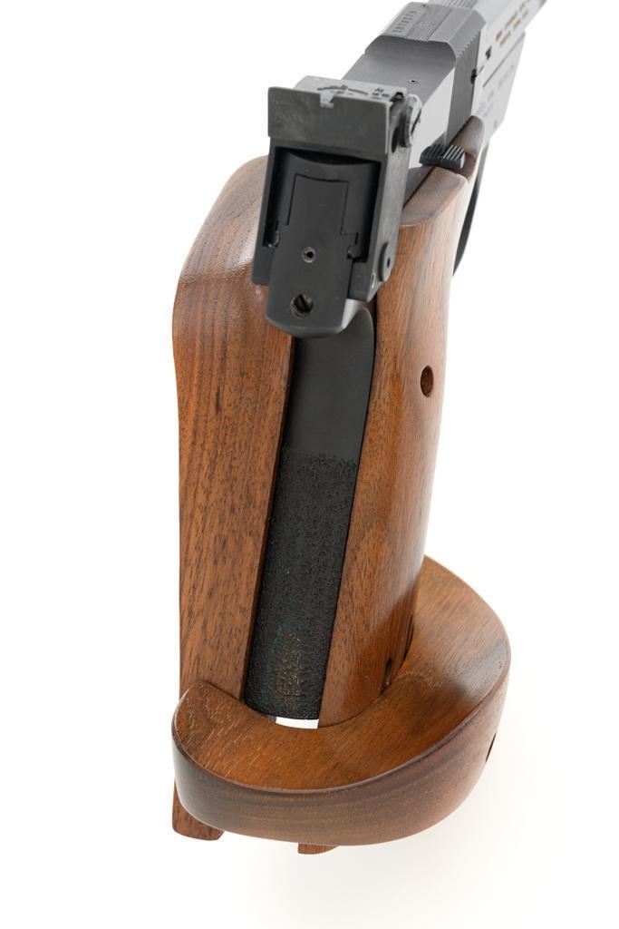 High Standard Supermatic Trophy Military Model 106 Military Semi-Automatic Pistol, #1878179, .22 L.R. cal., 6.5" fluted barrel with muzzle brake, drilled and tapped for barrel weights, high gloss blue finish, smooth walnut exaggerated target grips with rest, Patridge front sight, adjustable square notch rear sight, gold factory ribbed trigger, push button take down, stippled front and rear grip straps, color case hardened magazine release, with one 10-round High Standard magazine with red plastic base. Right barrel lug is marked "HIGH STANDARD MFG. CORP. / HAMDEN, CONN. U.S.A." Frame is marked "MODEL 106 / MILITARY". Mfgd 1968. Pistol is in near excellent overall condition, retaining approx. 96%-97% factory finish, with minor handling marks. Trigger shows moderate corrosion and loss of gold finish. Replacement target grips are in excellent condition, showing little use. Action is crisp and functions smoothly. Bore is near excellent with well-defined rifling. Considered the top of the line for High Standard pistols. Est.: $600-$800. (C&R/PPT)