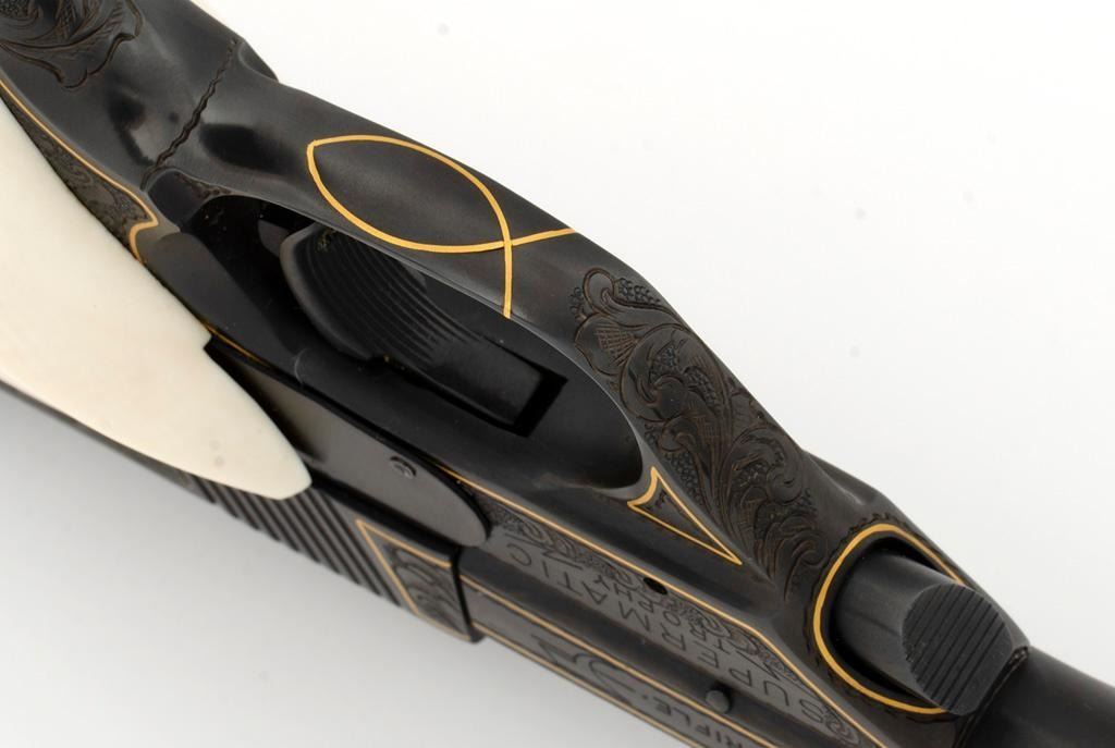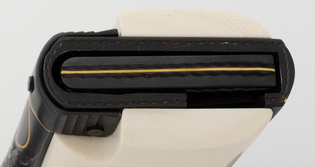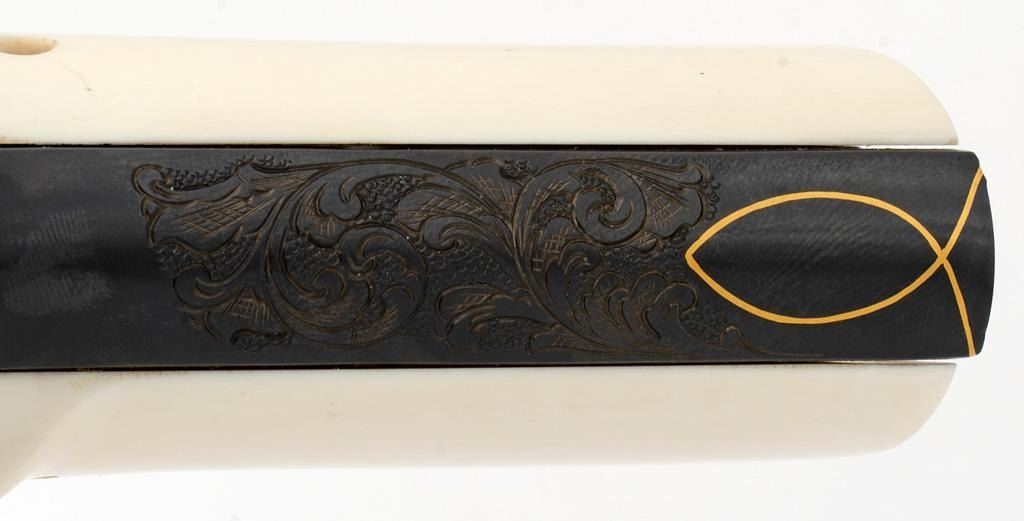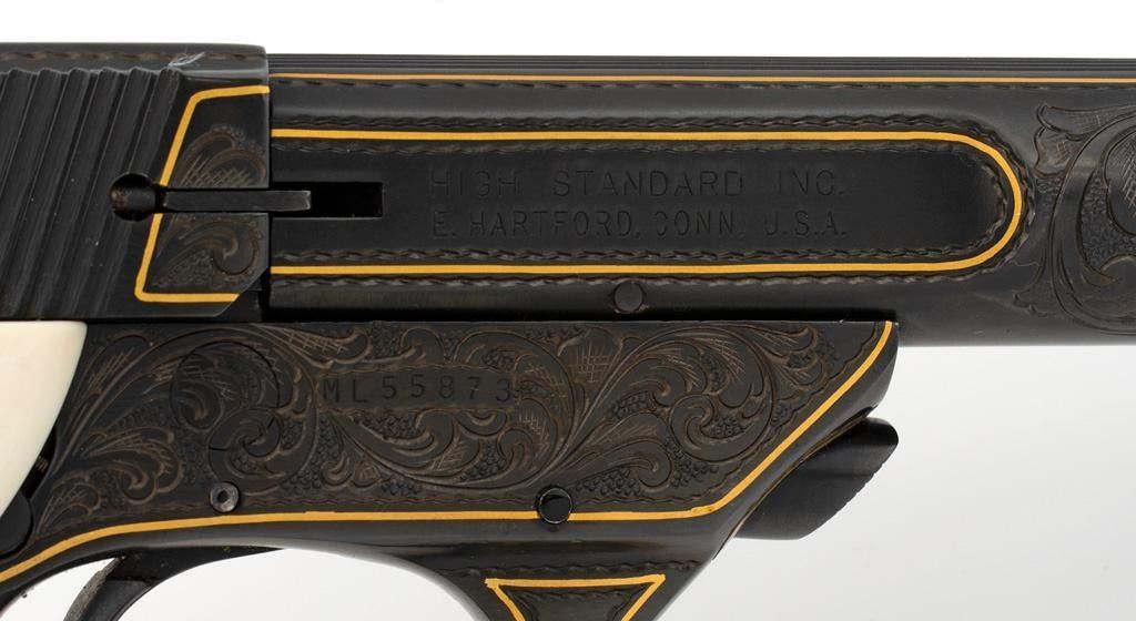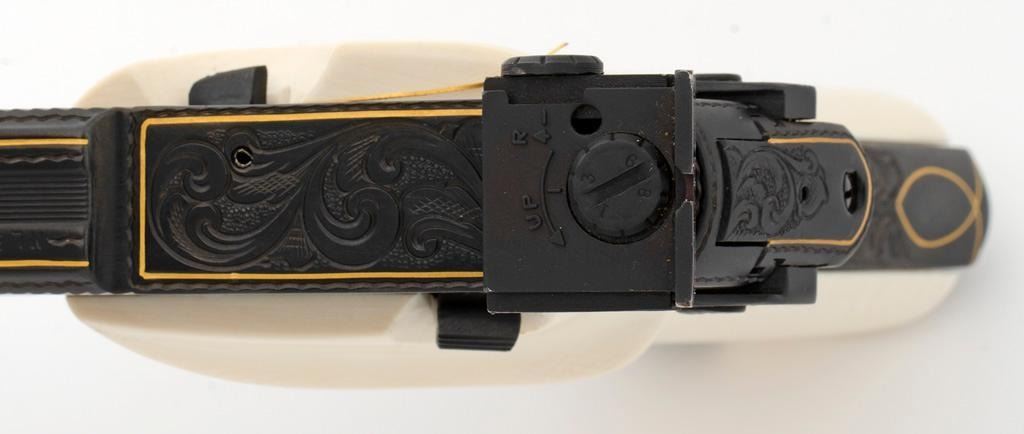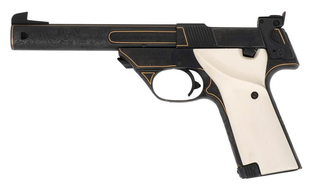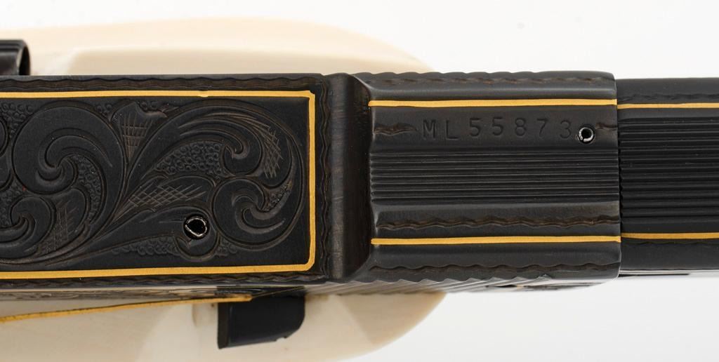 22 caliber, 5.5& #34; barrel, SN ML55873, target sights, Finish in blue with Ivory grips. Beautifully scroll engraved with the borders out lined in Gold lines. Nicely executed with stippled background. This pistol retains nearly all of the blue finish. Bore is excellent. The grips are in excellent condition.