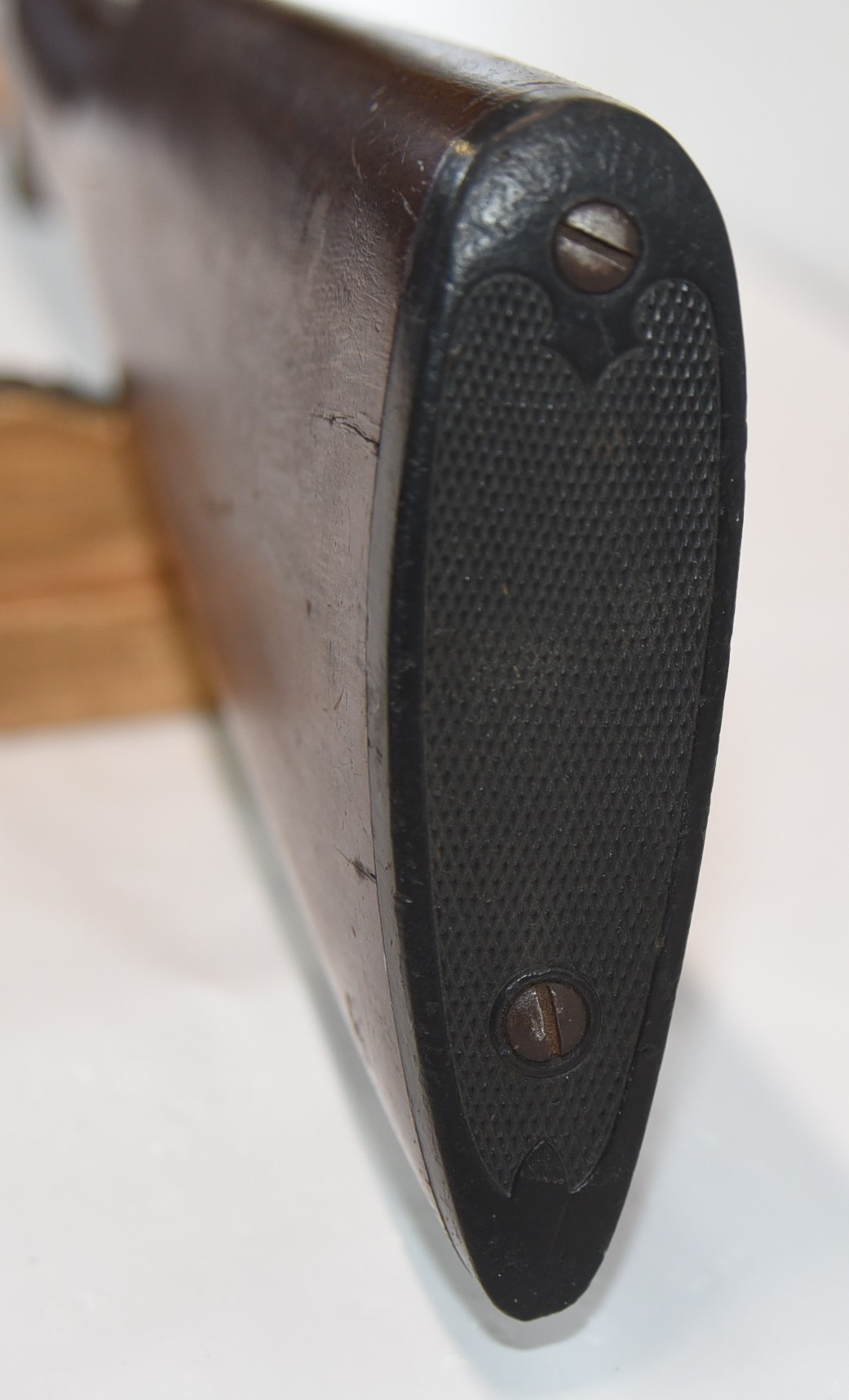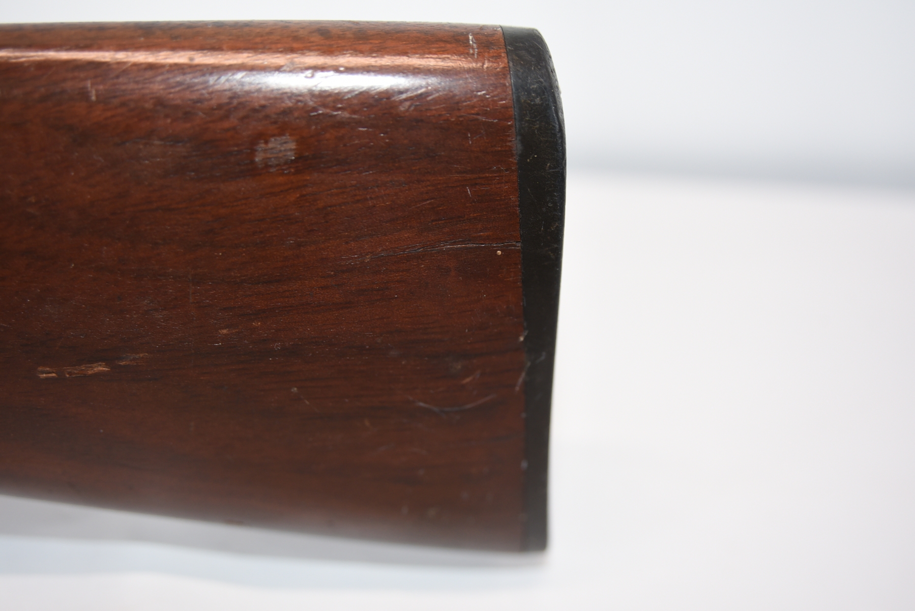 Wood stock shows a crack in the grip section on the right side of rear stock, there are scratches, scuffs, dents, finish wear; condition is fair.