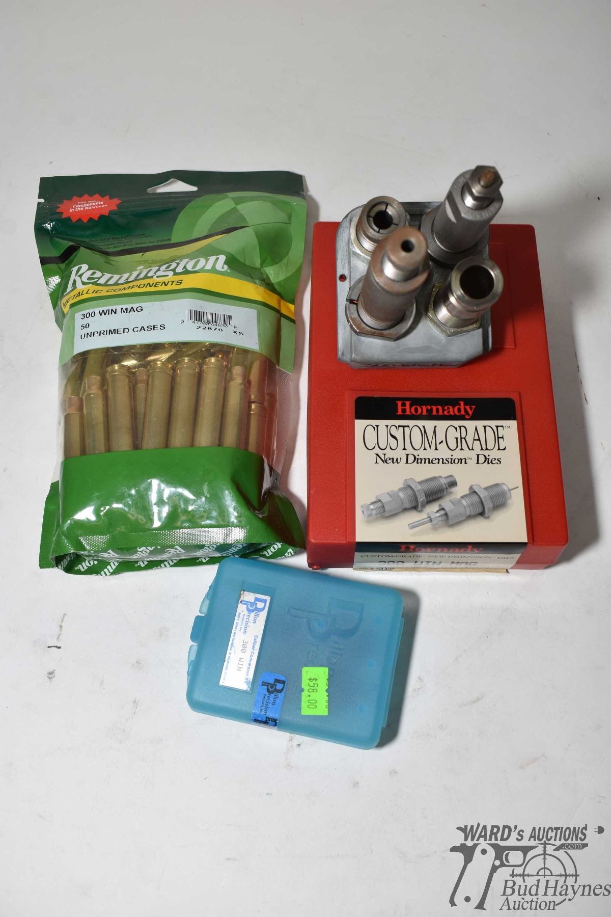 Hornady custom grade .30 win mag die set in dillon tool block, conversion set and one full 50 count bag Remington .300 win mag brass