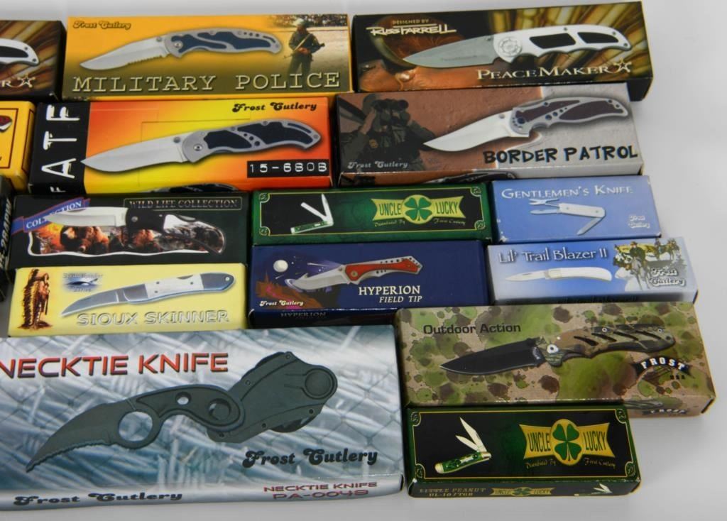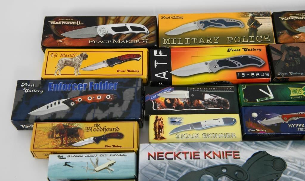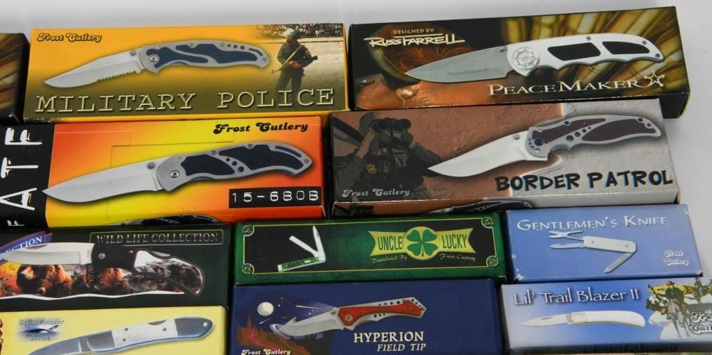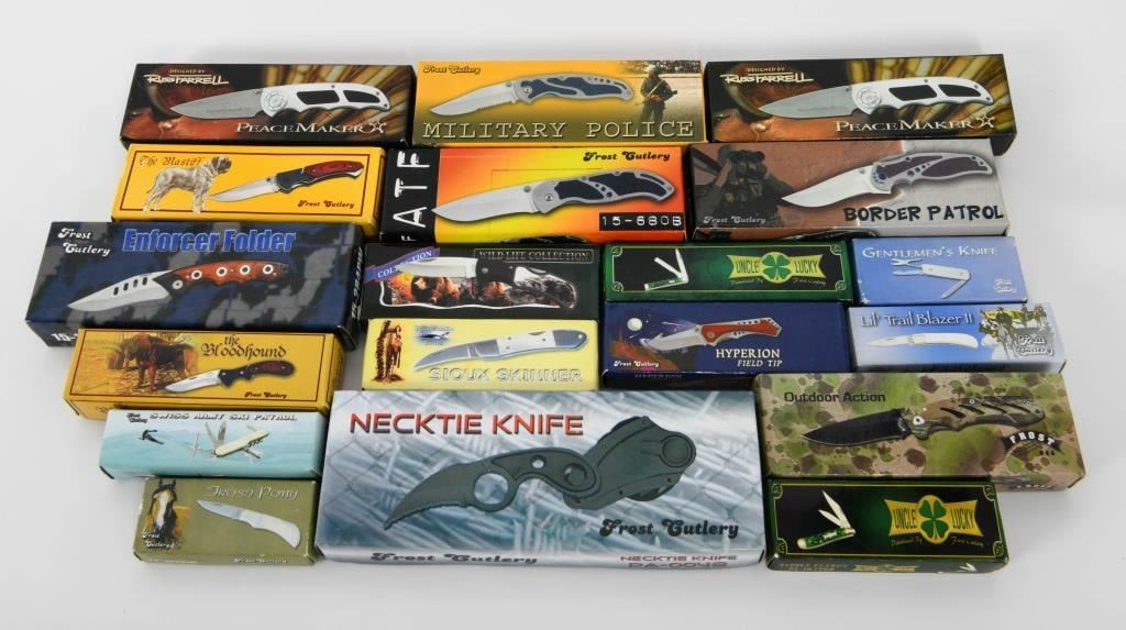Attention, valued bidders! Feast your eyes on our vast selection of brand-new Frost Cutlery Folding Knives! This remarkable collection includes a variety of models such as the Lil Trail Blazer II, Necktie Knife, Border Patrol Knife, Enforcer Folder Knife, and many more! Don't miss out on this opportunity to expand your collection?place your bids now and secure these exceptional folding knives for yourself!