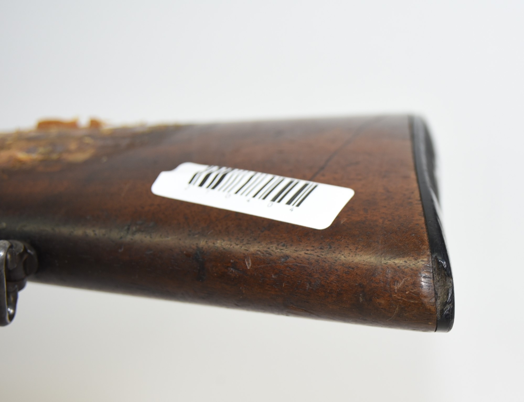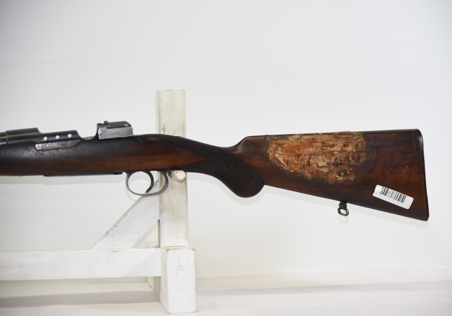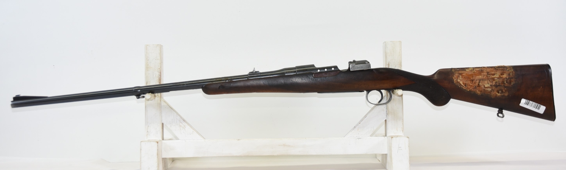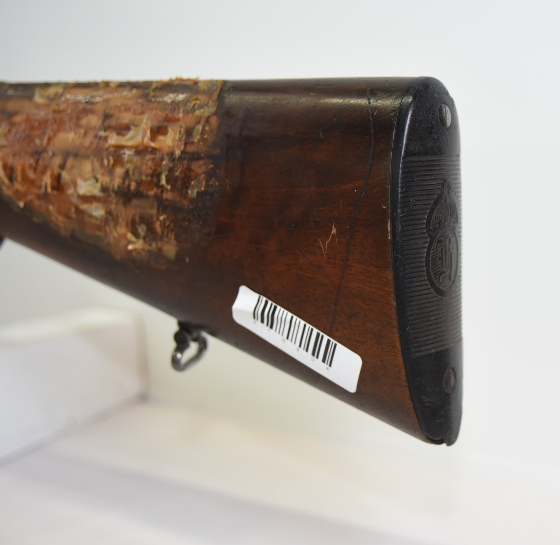 Wood stock shows finish wear, cheek piece has been removed, there are other repairs/modifications to the stock, there are also scratches and scuffs, butt plate has a chip, light dents; condition is less than fair.