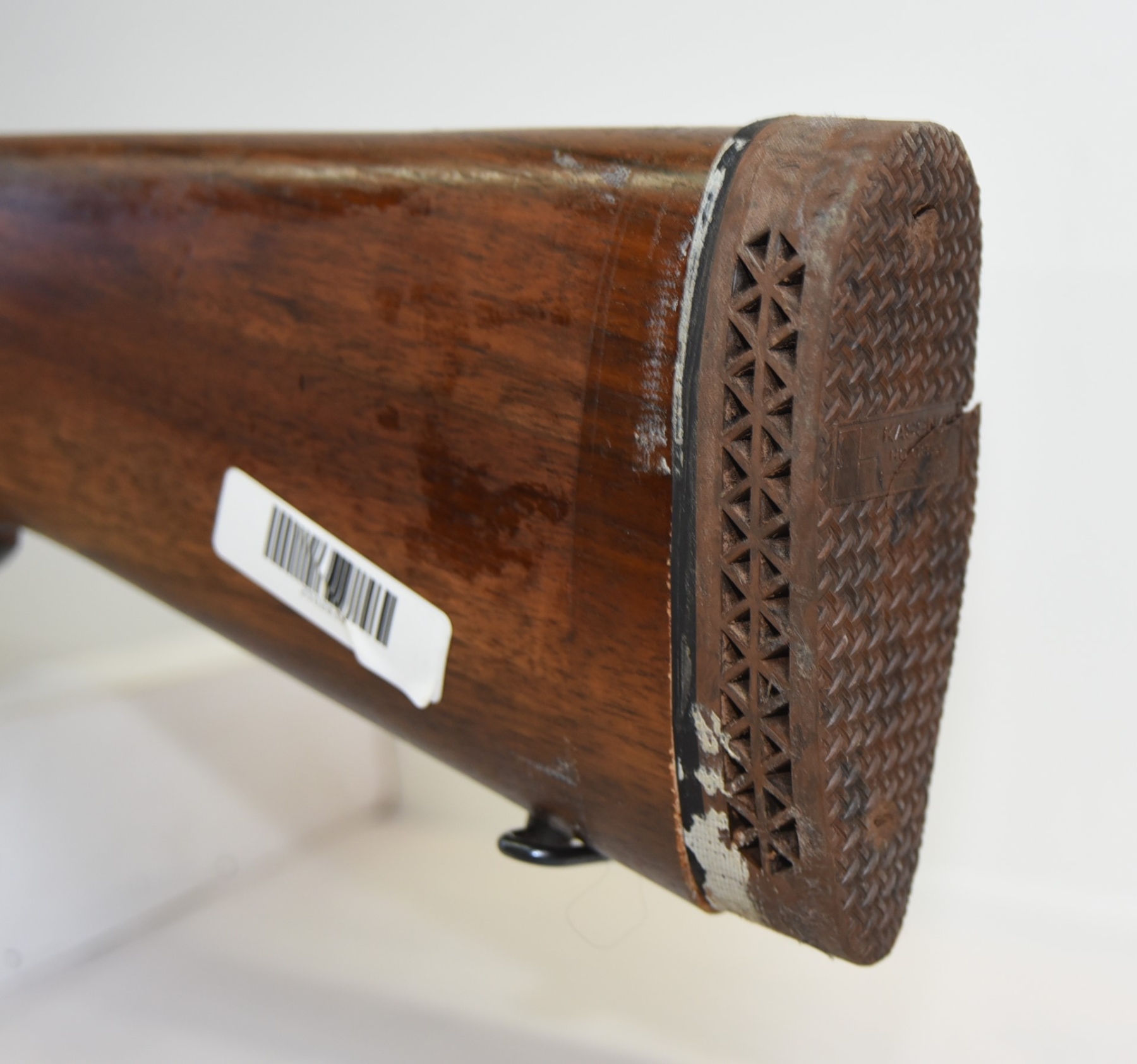 Wood stock shows scratches, scuffs, chips at rear of receiver, recoil pad is falling apart; condition is fair.