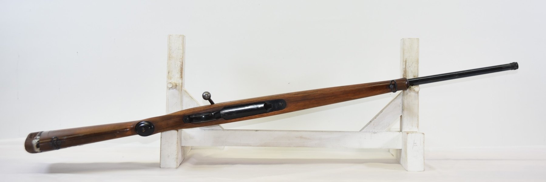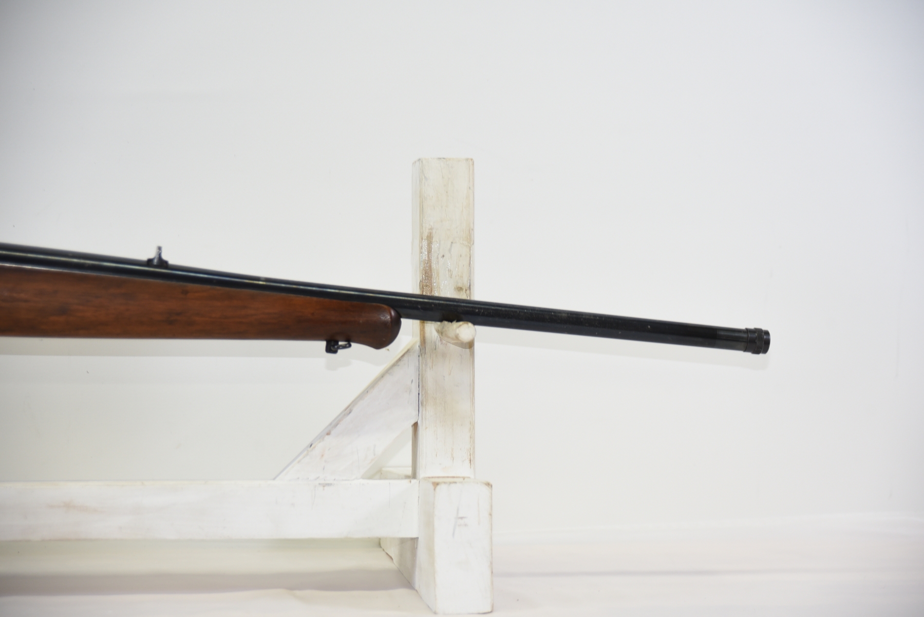 Metal finish shows front sight is missing due to barrel being shortened, there are scratches, scuffs, bolt stop parts are missing and bolt falls out; condition is fair.