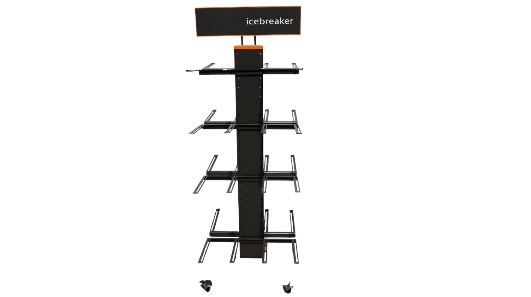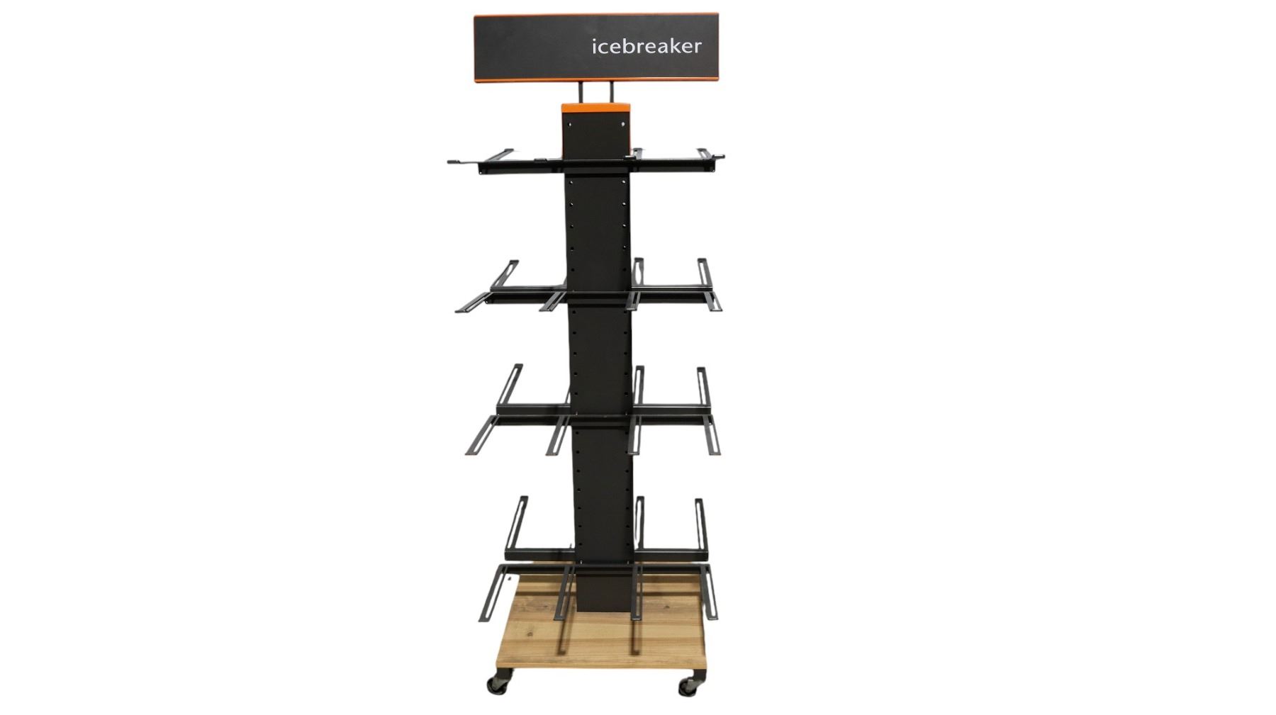 (1) ICE BREAKER DISPLAY RACK ON WHEELS (TWO LOCKING WHEELS), 8 ADJUSTABLE SHELVES, GREY & ORANGE STEEL WITH WOOD BASE, ASSEMBLED APPROX. 21" X 26.5" X 62". SEE PHOTOS. *ADDITIONAL SHIPPING / FREIGHT CHARGES WILL APPLY*