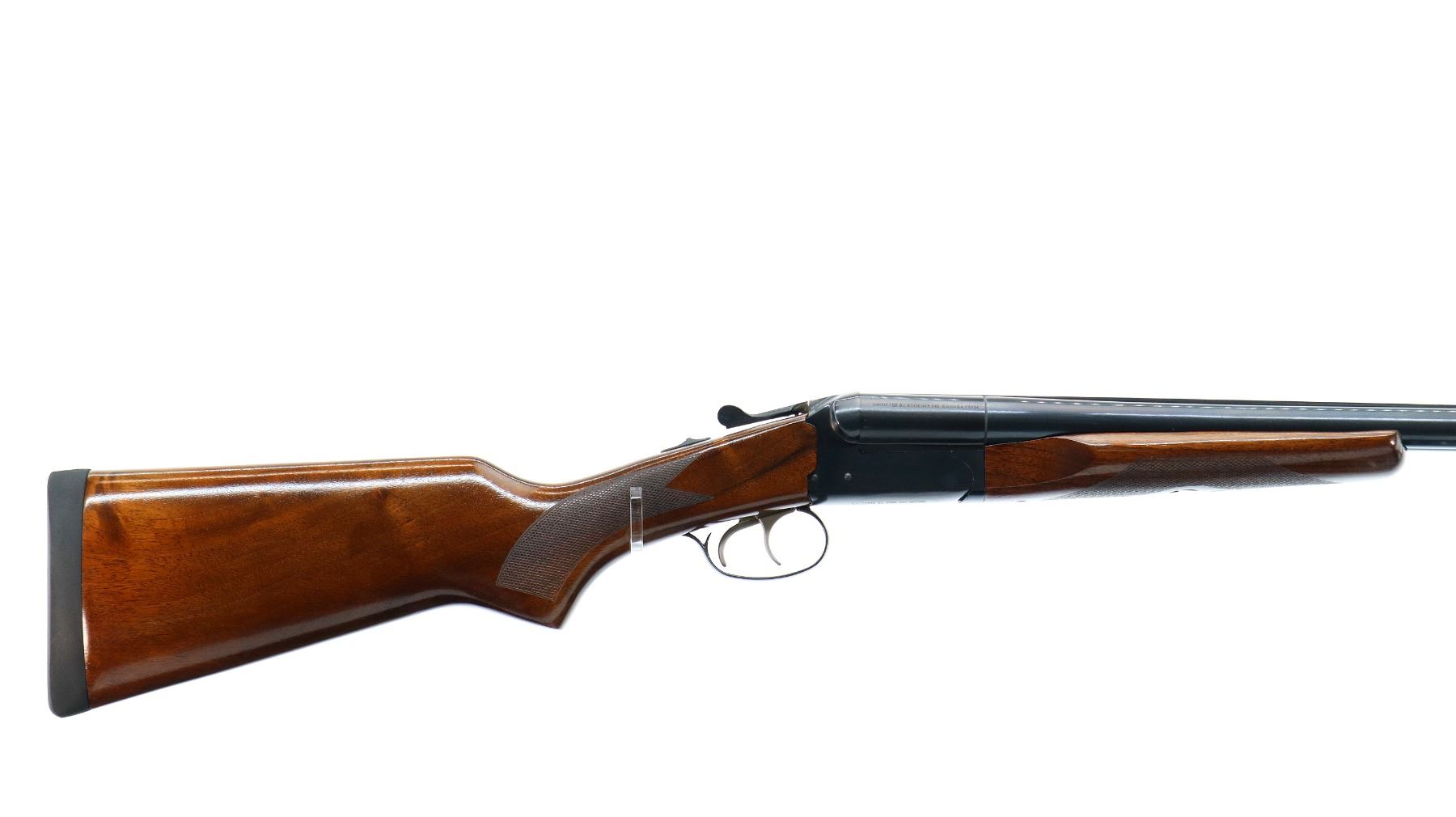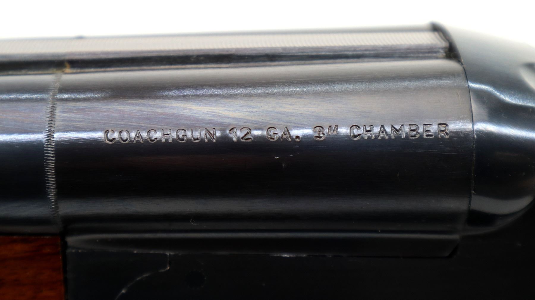 Main Description: Brass bead, blued finish, raised rib, automatic safety, extractor, double triggers. Two piece wood stocks, checkered beavertail forearm and pistol grip, black rubber recoil pad.