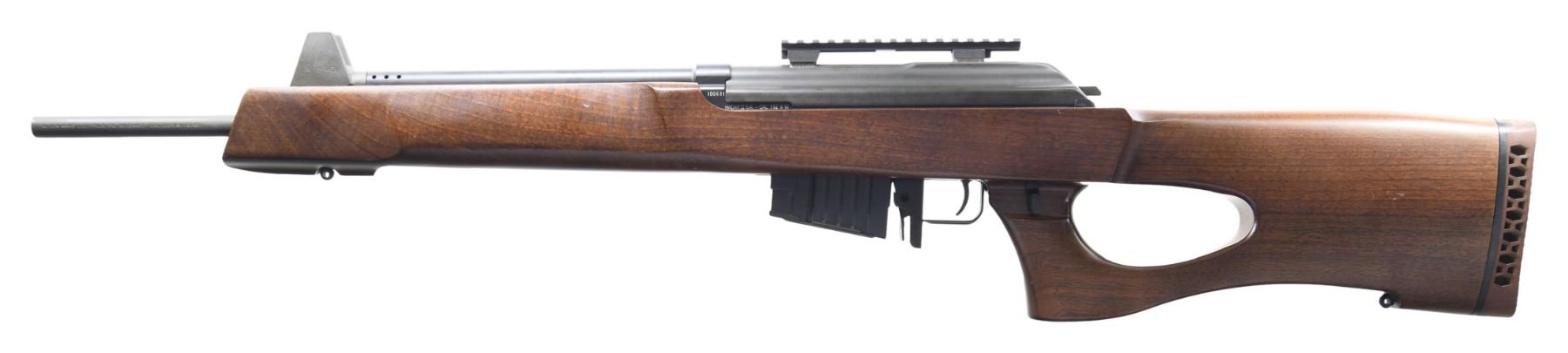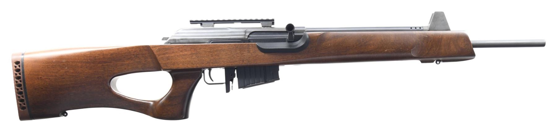 Cal. 7.62x51mm. S# 100631. Bbl. 18.5". The Hadar II SA rifle was manufactured in 1989 by IMI of Israel. Heavily sporterized Galil-Type rifle. Walnut thumbhole sporter stock w/ red rubber recoil pad. Medium profile barrel w/ no threads at muzzle. Elevation adjustable, protected post front sight. 6" scope rail on top cover for optics mounting. Black / gray matte finish on exposed metal surfaces. Barrel marked "ACTION ARMS LTD. PHILA. PA. IMI ISRAEL. CAL. 308 WIN. / 7.62x51" on left side. Left side receiver marked "100631 / HADAR II S.A. - CAL 7.62x51". MAGS: 1 factory 4 rd. CONDITION: Exposed metal surfaces retain the vast majority of finish. Only a few light drag lines & some thinning in areas of mechanical intervention visible under close inspection. Bore is bright w/ strong rifling. Safety / selector engagement may need some TLC as it does not engage reliably. (25-2173/JZ). MODERN. $800-1,200.