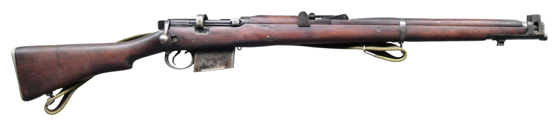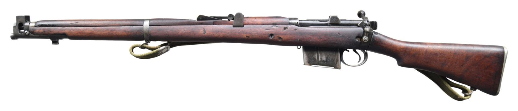 Cal. 7.62x51. S# C7336. Bbl. 25 1/5". Blade front sight with protective ears. Tangent rear sight graduated to 800m. All visible matching numbers. Right side of socket has Ishapore & 2A1 markings with 1965 date. Right rear of receiver has Navy Arms import marking. Suncorite finish. Hardwood stock set with bottom mounted sling swivels & canvas SMLE sling that appears to be of newer mfr. MAGS: 1-12 rd. matching numbered to rifle. CONDITION: stock set appears sanded with faint Ishapore roundel on left side of butt, a minor handguard crack ahead of rear sight, a pair of armorer reinforcements at rear of handguard, a few dents, scattered dings & handling marks. Metal is mostly gray with strong traces of Suncorite finish, edge wear & some scattered oxidation. Action functions properly when hand cycled. Bright near excellent bore. (25-3764/MJC). CURIO. $200-400.