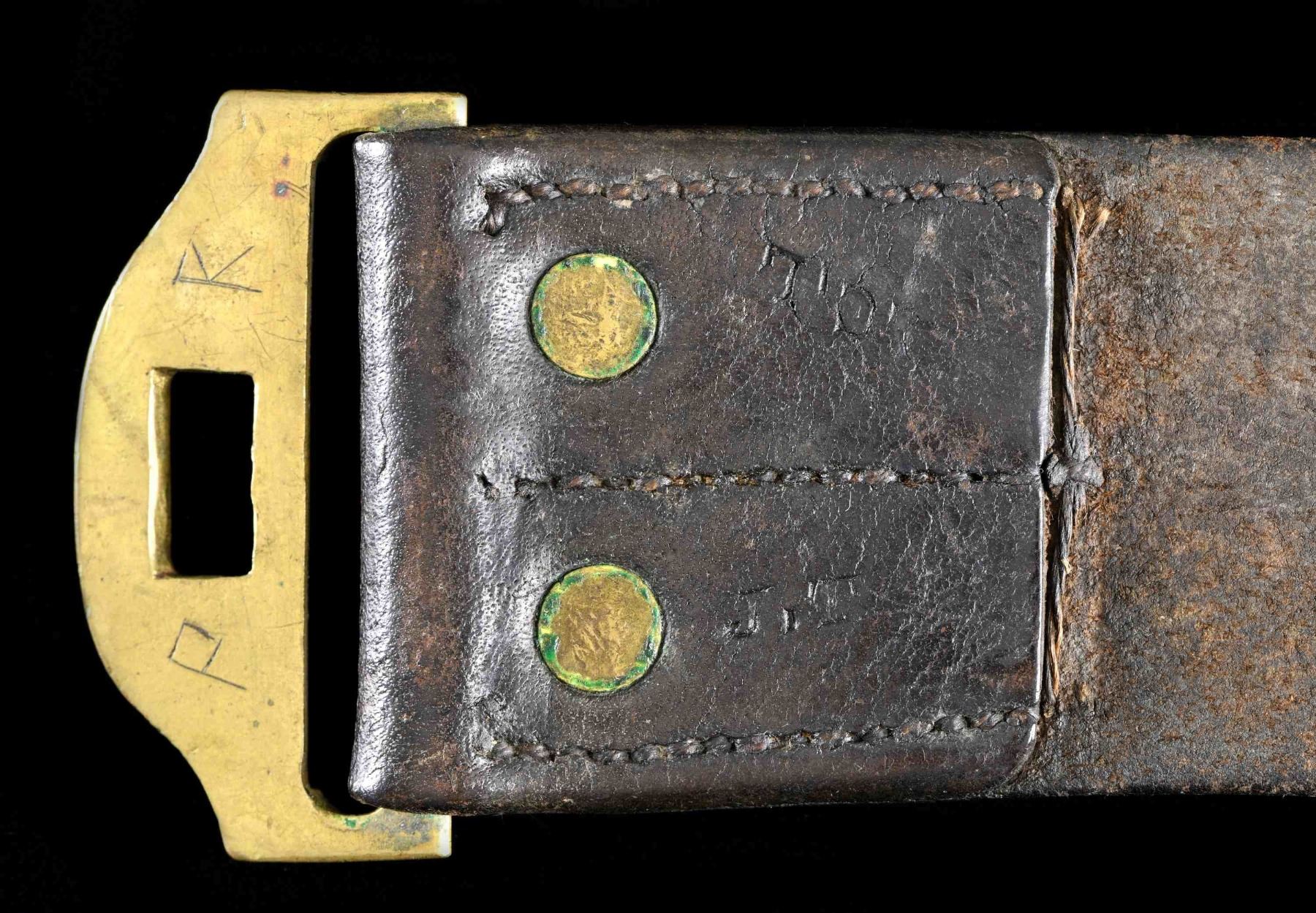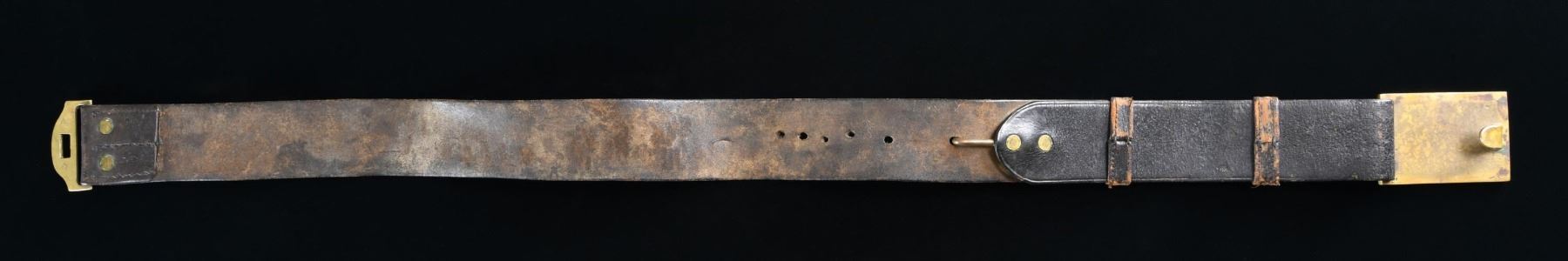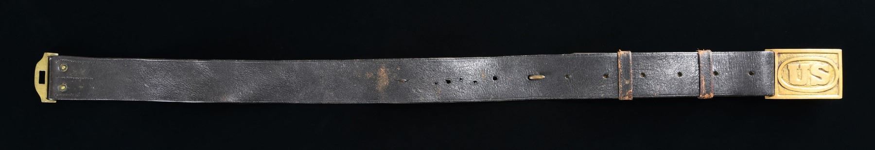 Nice solid example of 40" adjustable enlisted belt inspected "C.L." & "J.T." rectangular cast US buckle. CONDITION: very good overall retains much of its original black dyed finish, two added patent leather adjustment loops. (02-24482/JS). NON-GUN. $300-400.